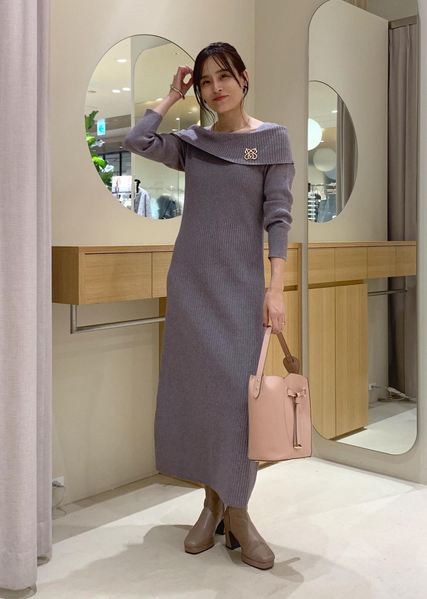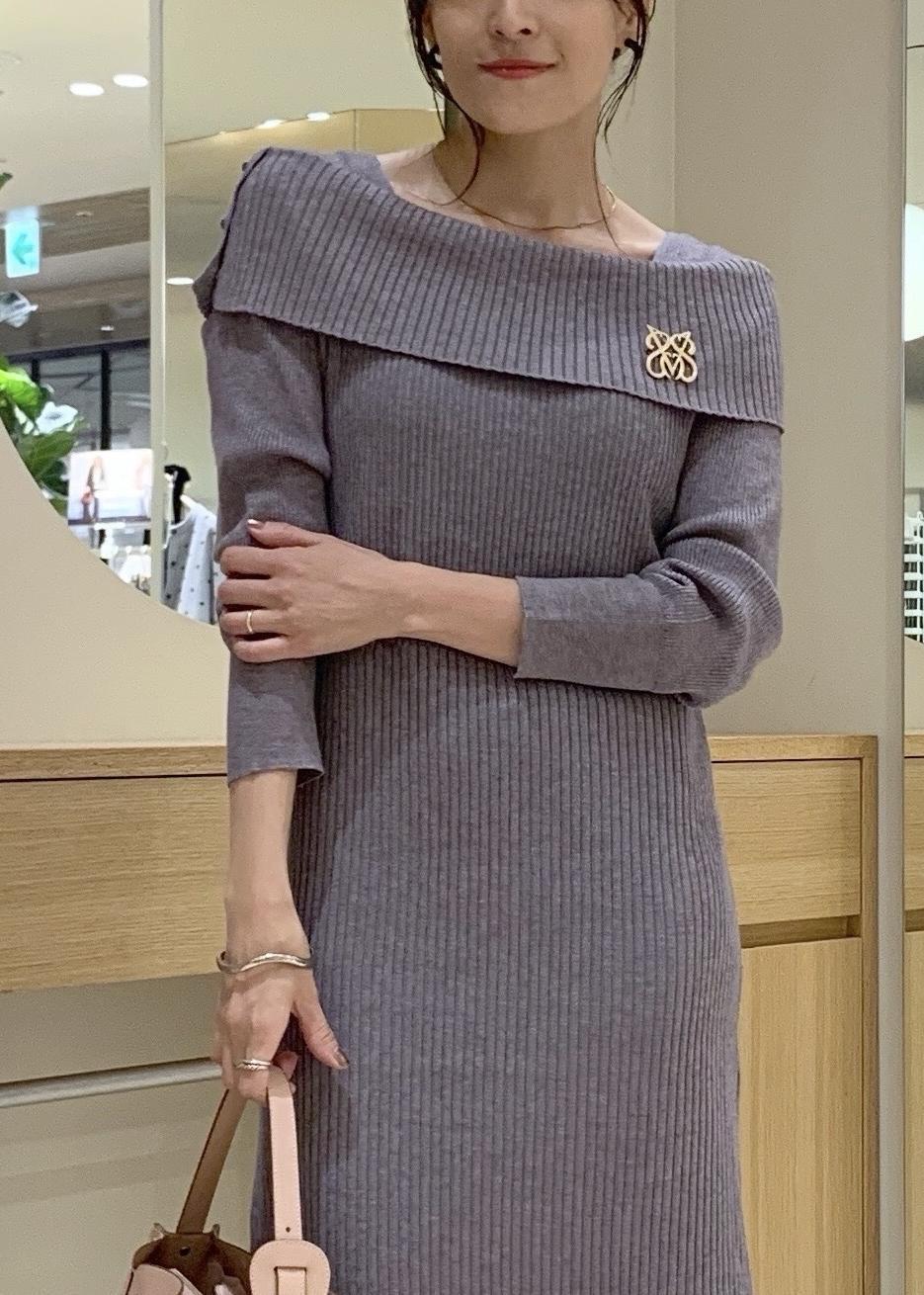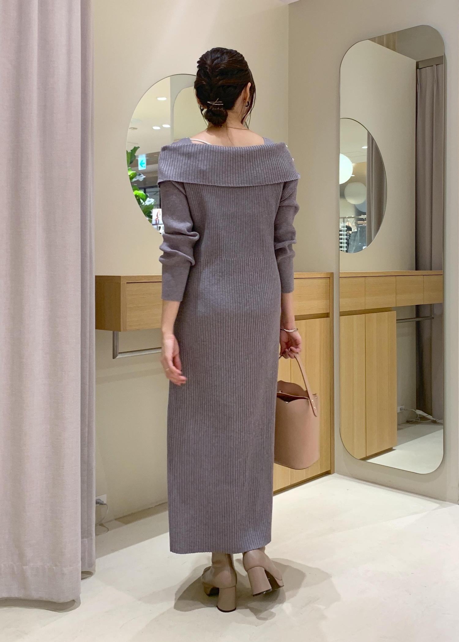 VISアシメオフショルリブニット美シルエットワンピース/着丈が選べるグレー / F¥8,899レビューニットなので、伸縮性があり着心地よし!