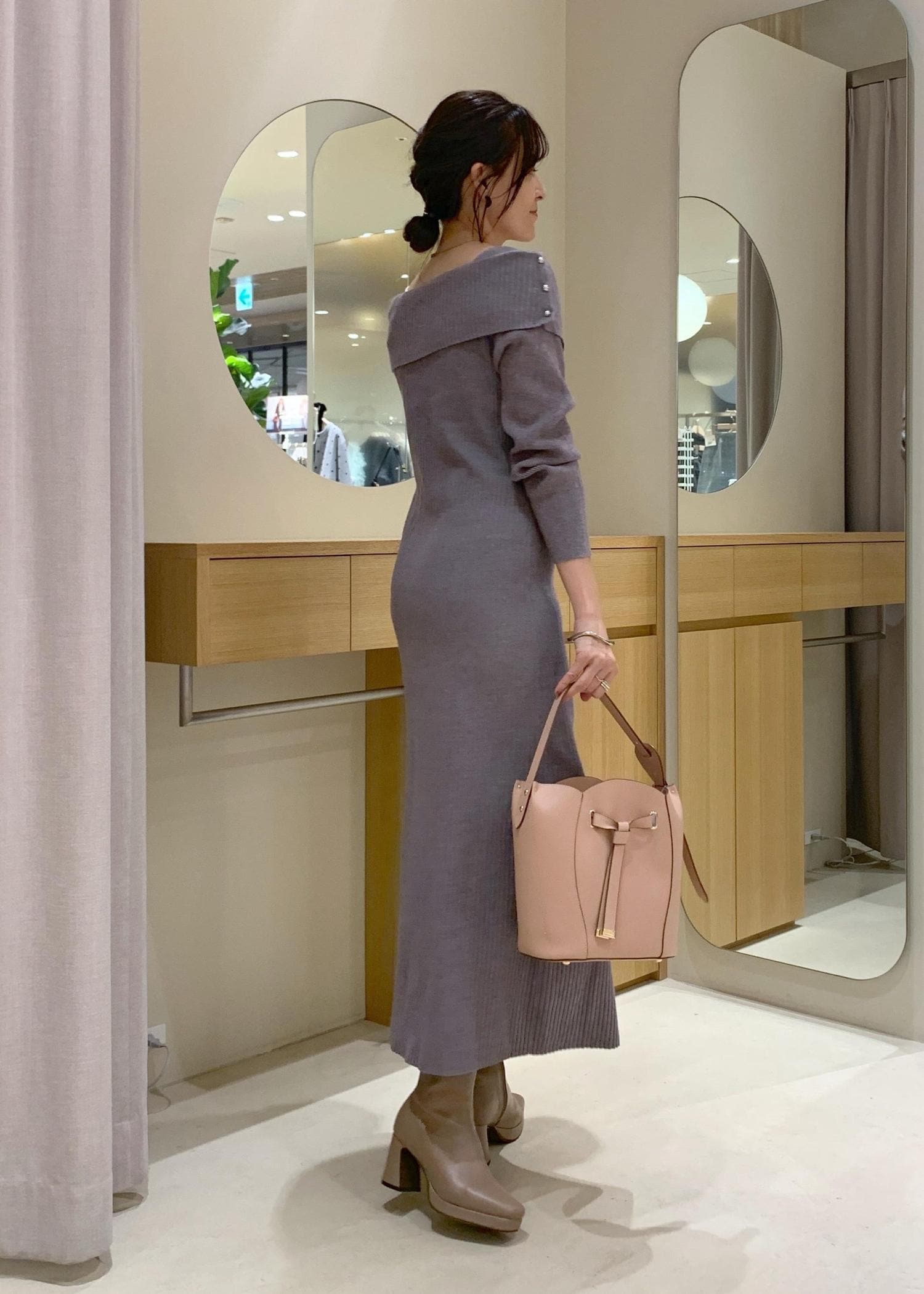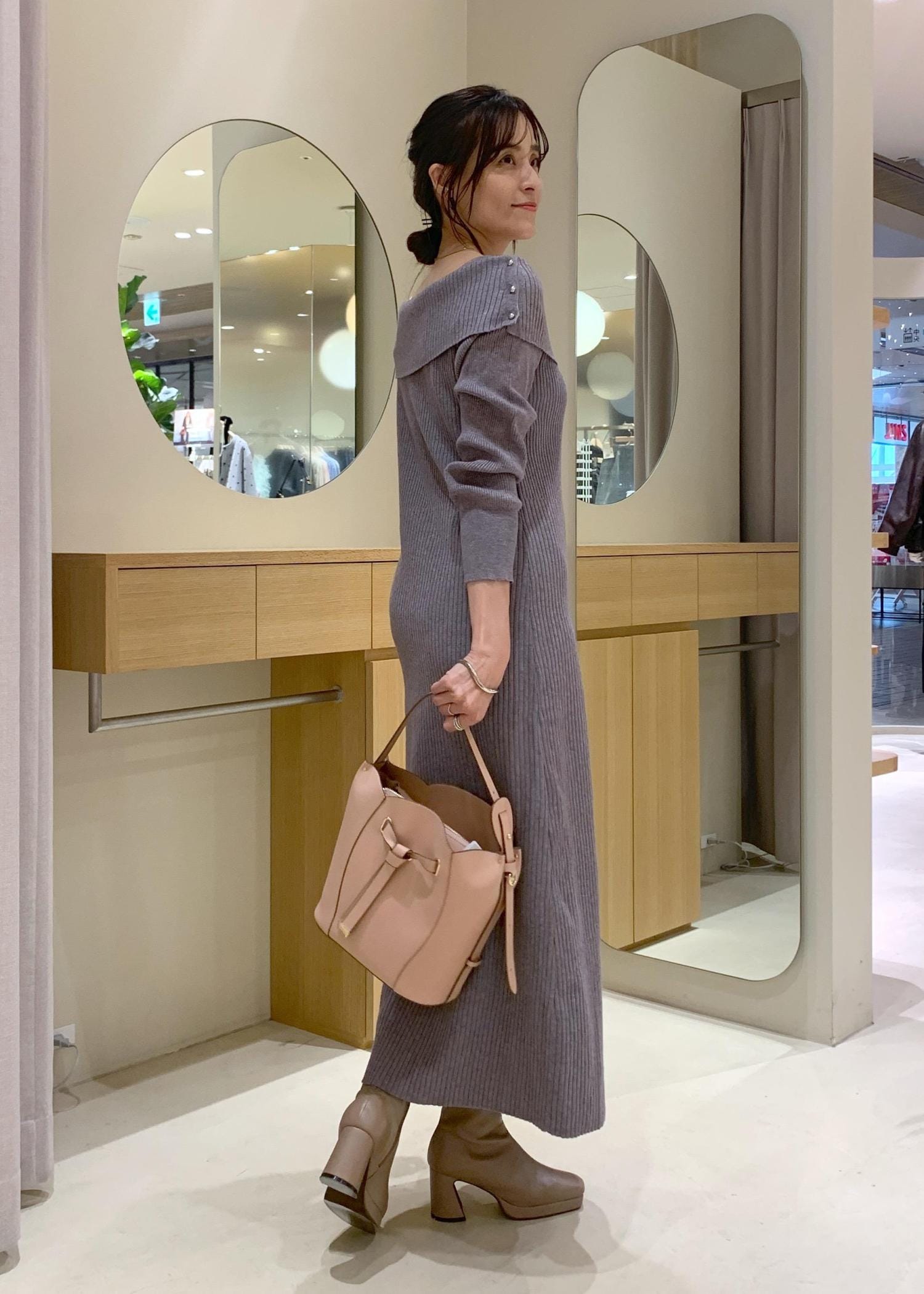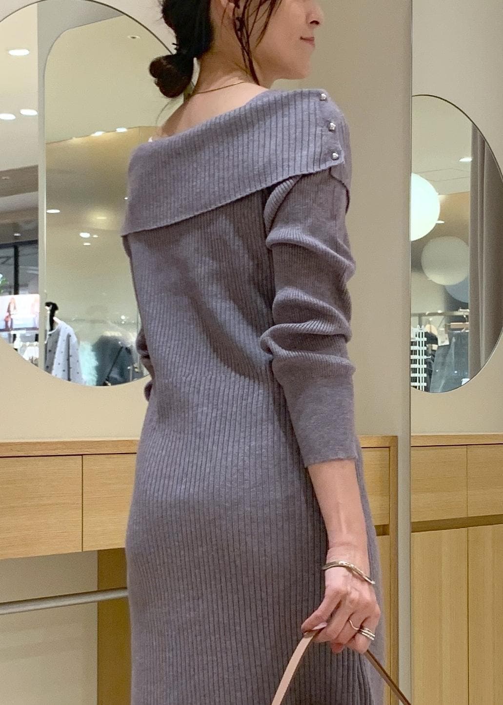 VISアシメオフショルリブニット美シルエットワンピース/着丈が選べるグレー / F¥8,899レビューニットなので、伸縮性があり着心地よし!