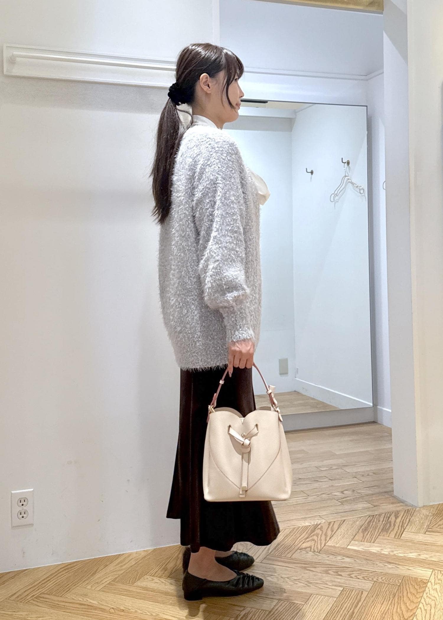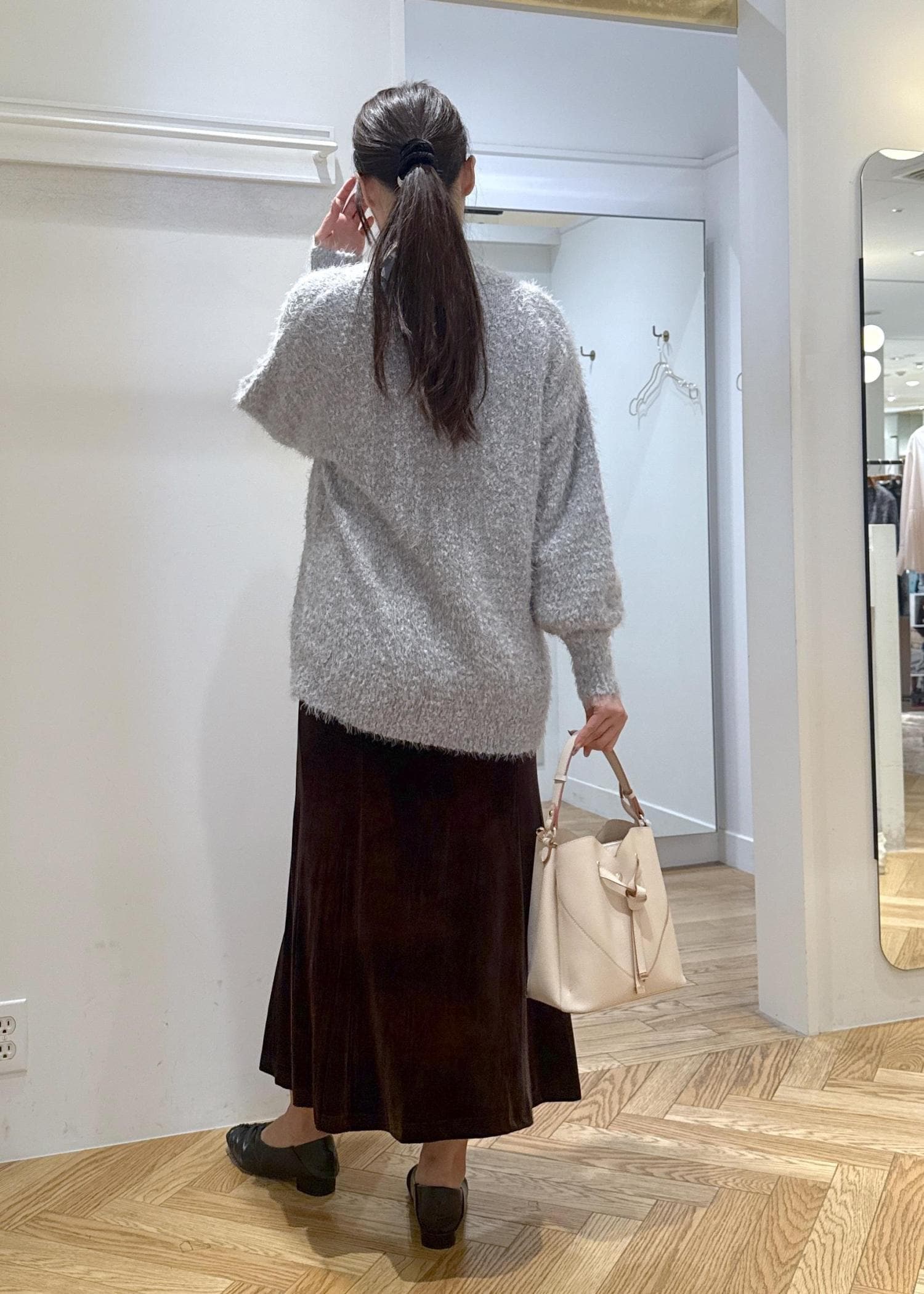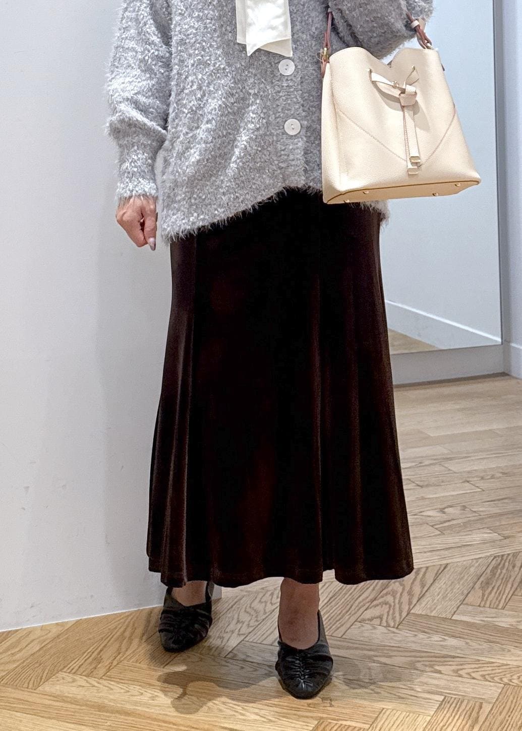 秋らしいブラウンのベロアスカートにぽこぽこカーディガンを合わせた大人カジュアルコーデです。