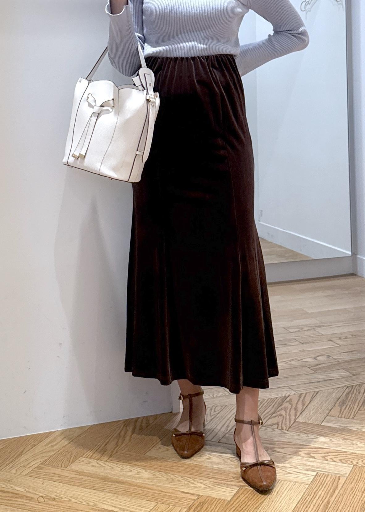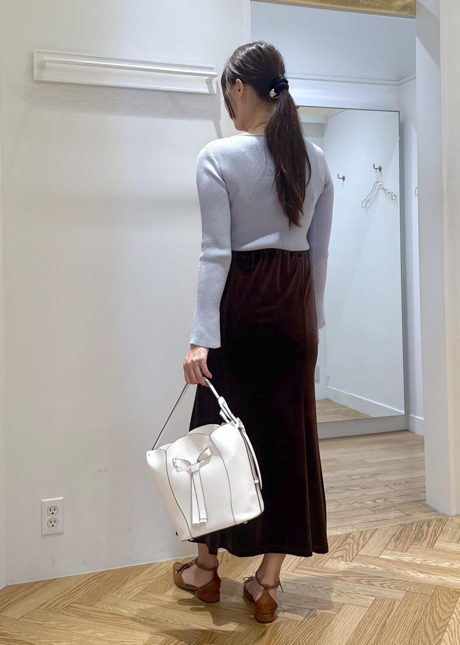 ブルーカラーのツイストデザインが華やかなリブニットにベロアスカートを合わせて大人カジュアルコーデです。