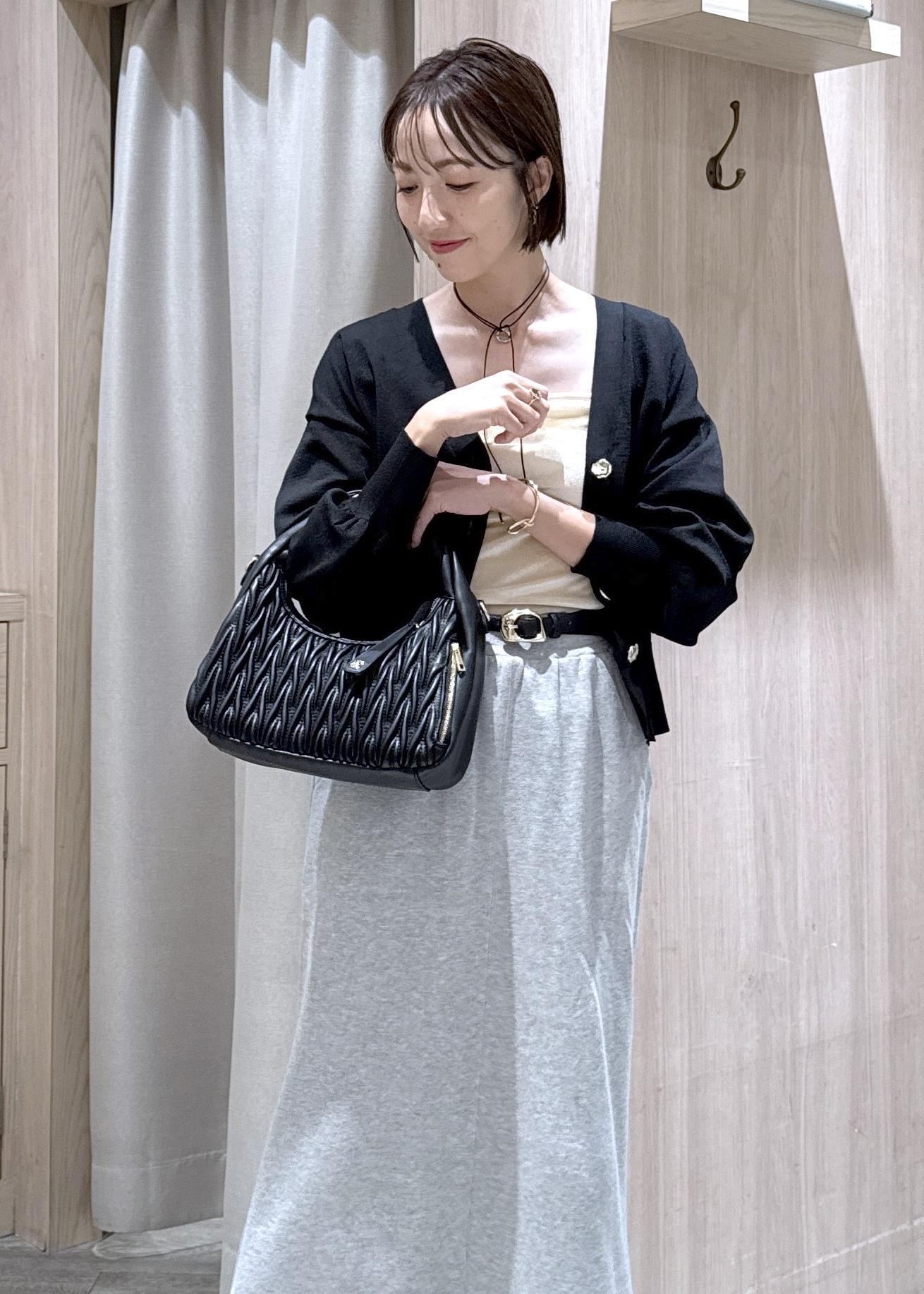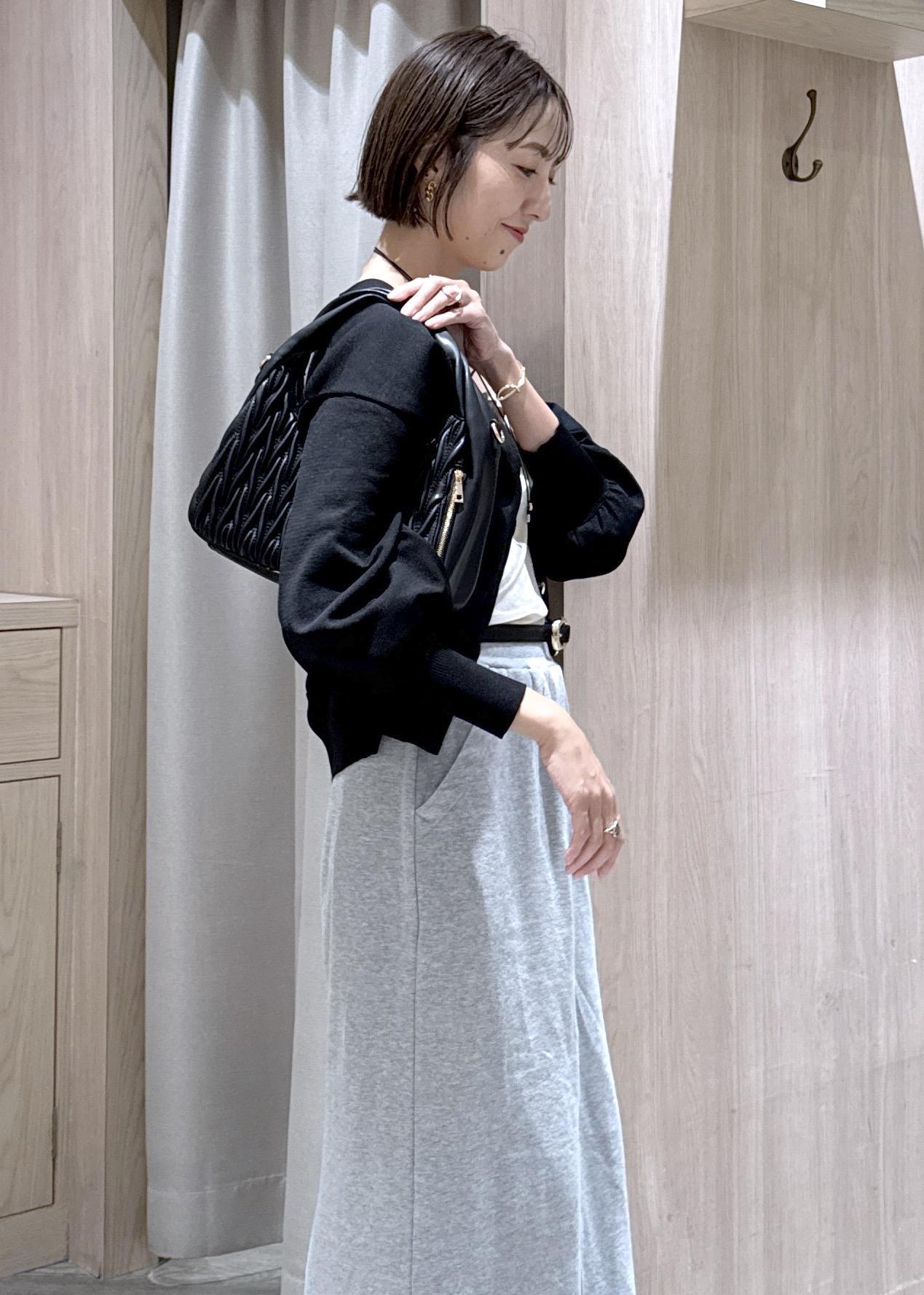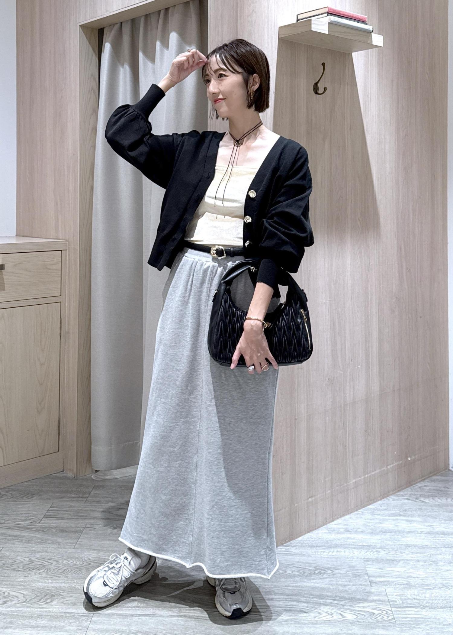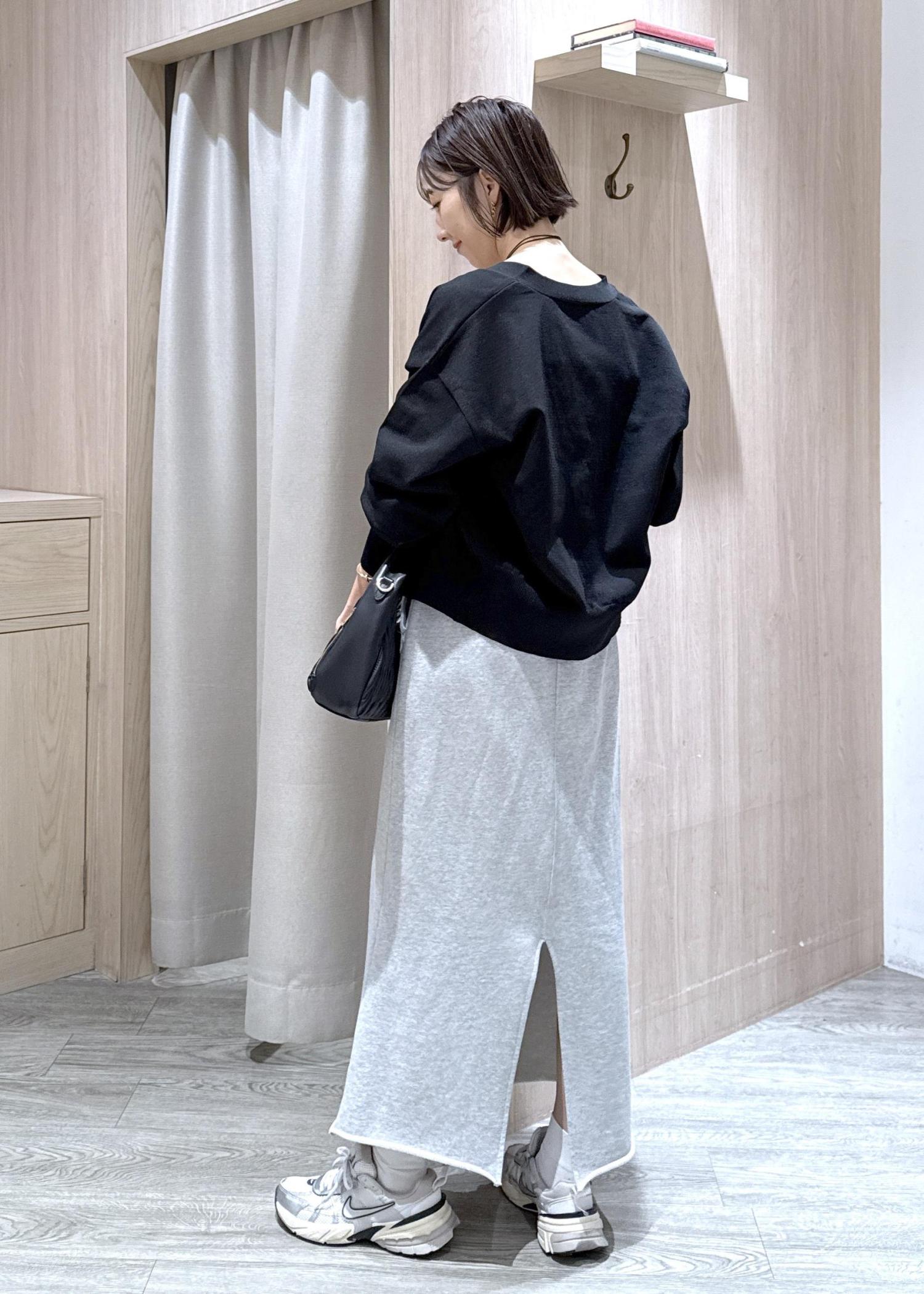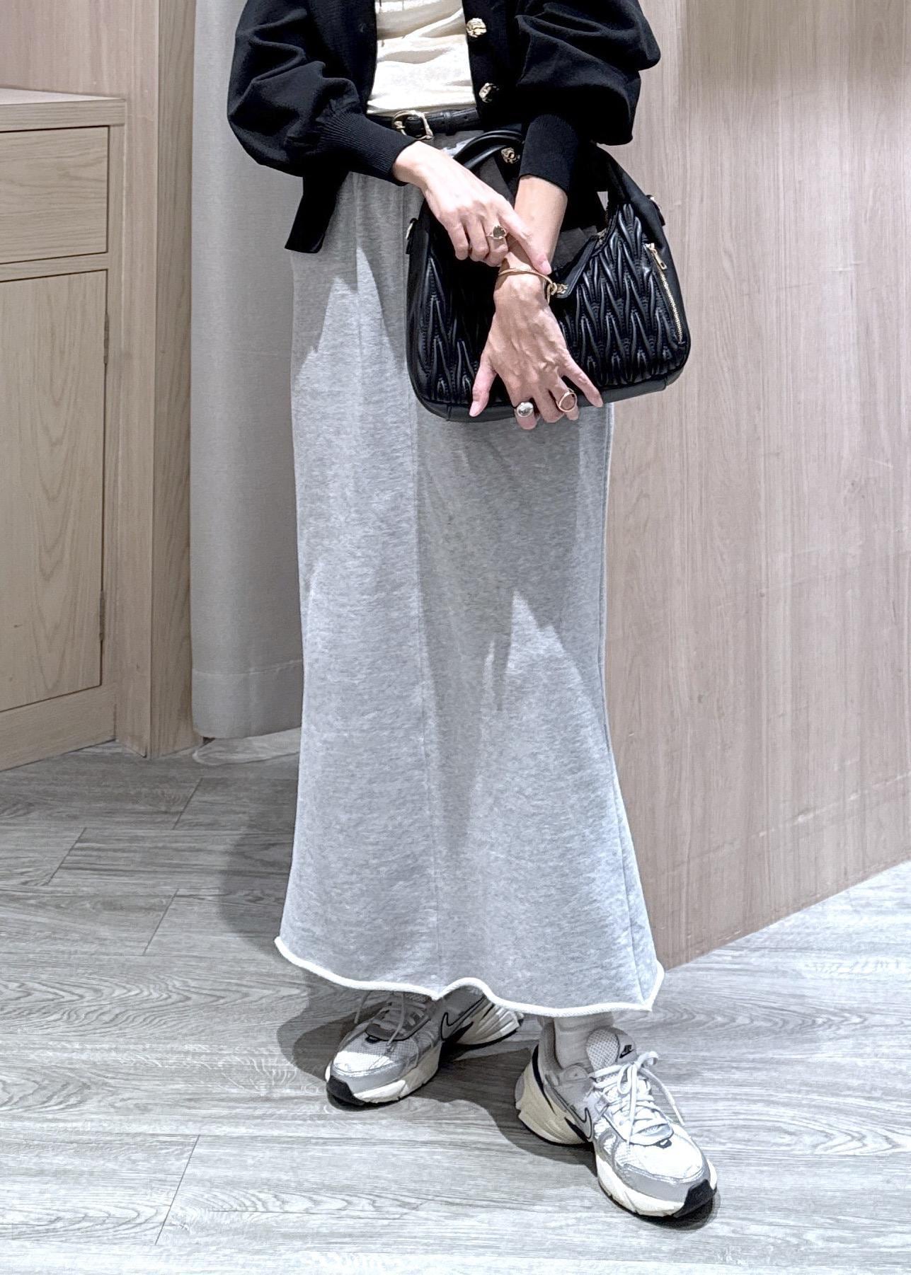 スウェット素材のナローススカートなので楽ちんなのにカジュアルすぎず、キレイめスタイルにも合わせやすいです◎