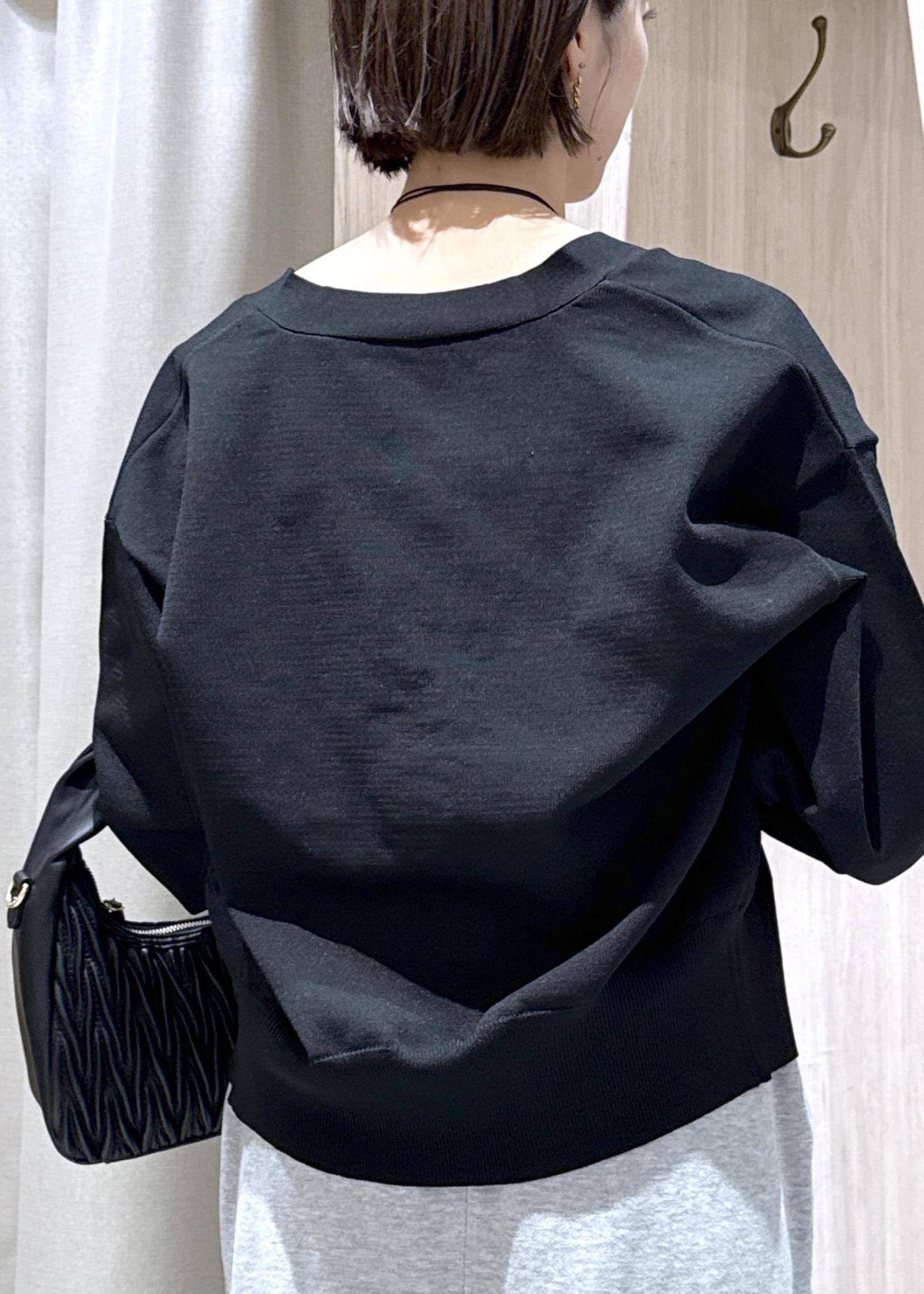 ポリエステルのサラッとした軽い素材感のカーディガンです。肩周りがゆったりとしていて、ルーズに着こなせる深めのVネックデザイン!