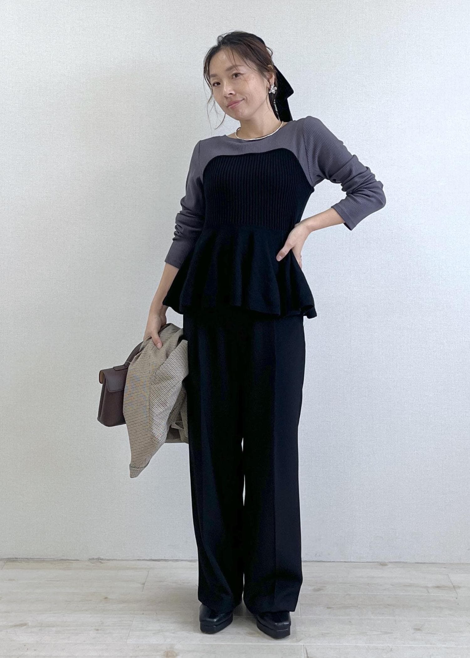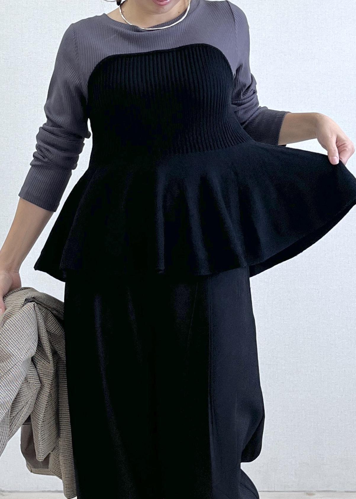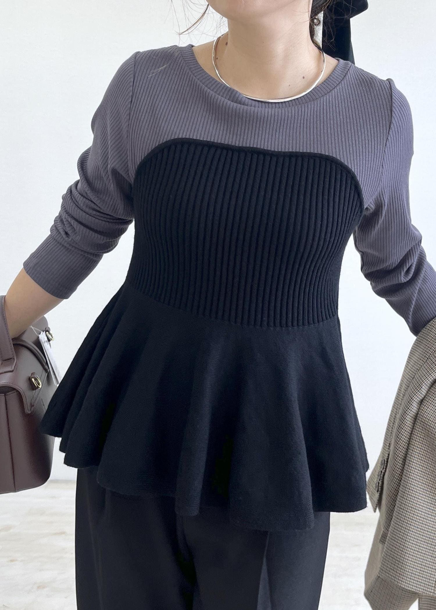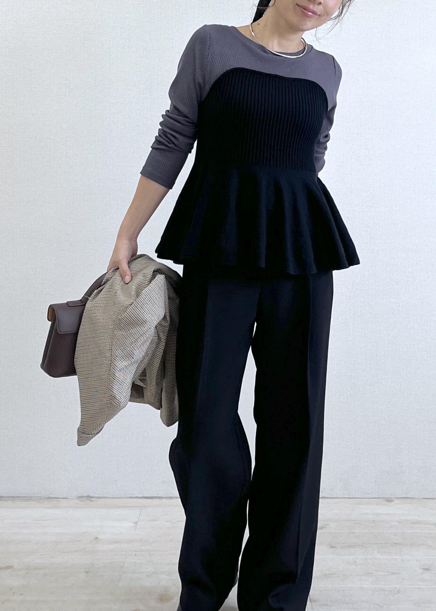 ウエスト切り替えのペプラムニットで、自然にスタイルアップできるデザイン。