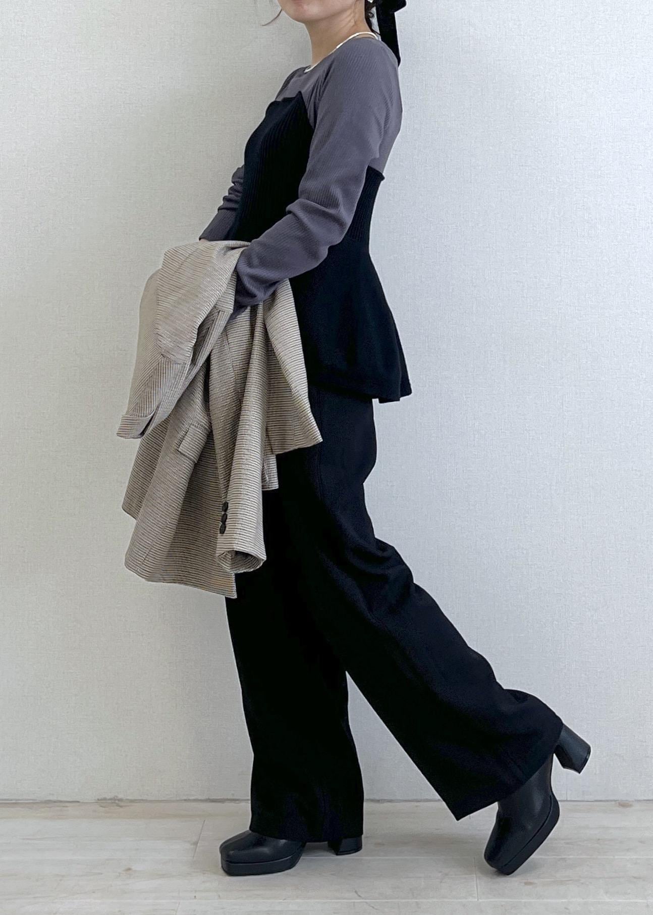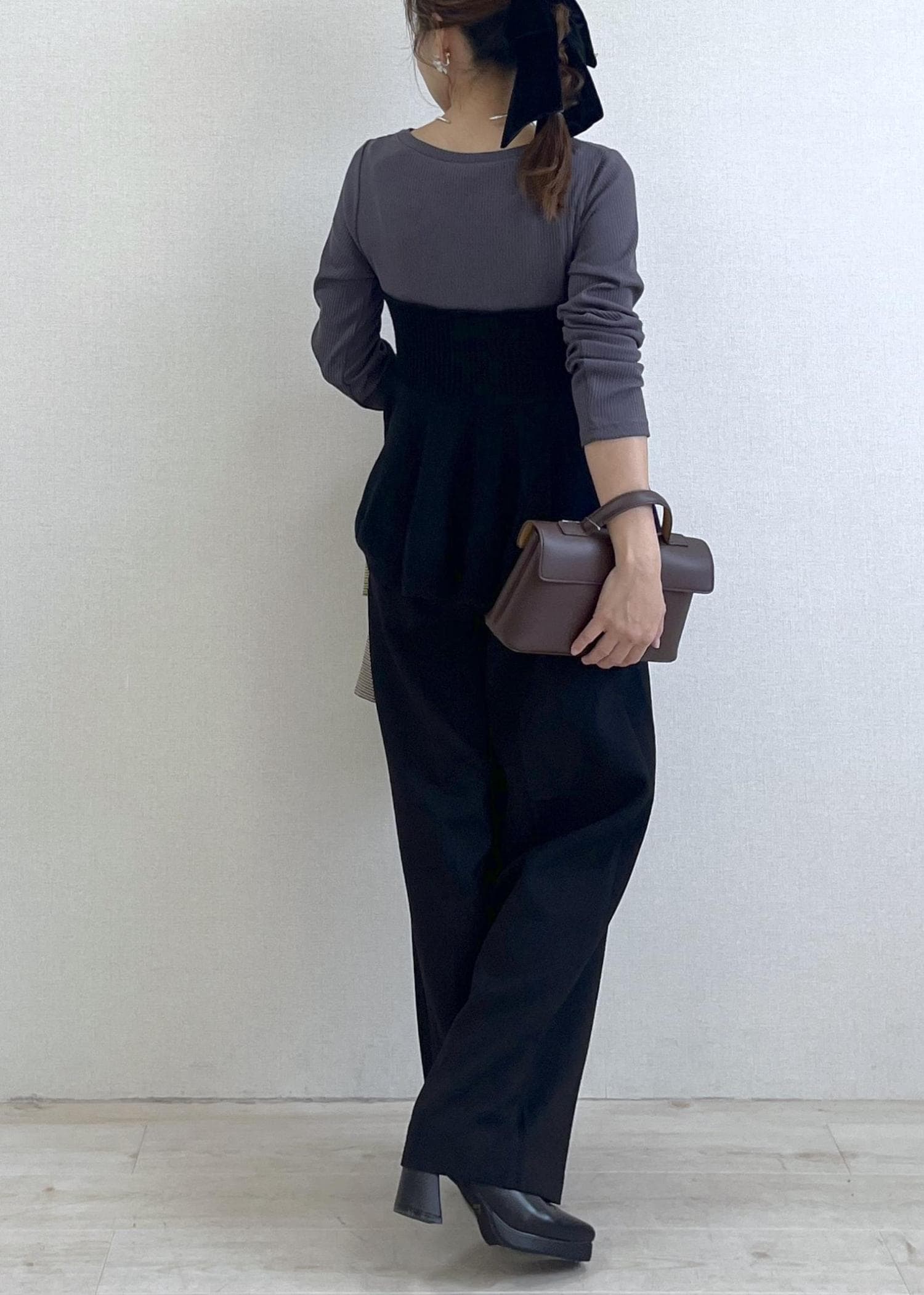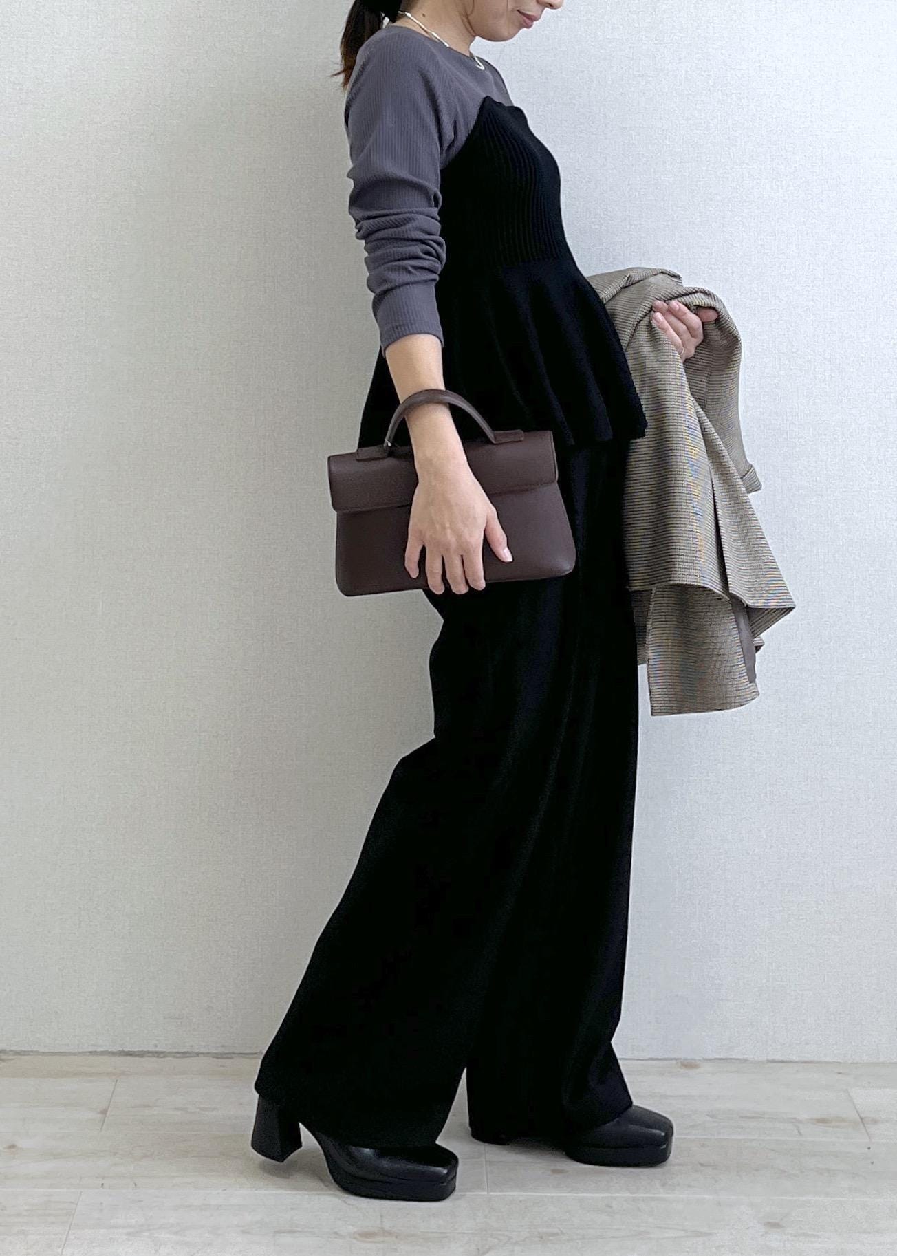 黒のワイドパンツを合わせて、きれいめにまとめました。