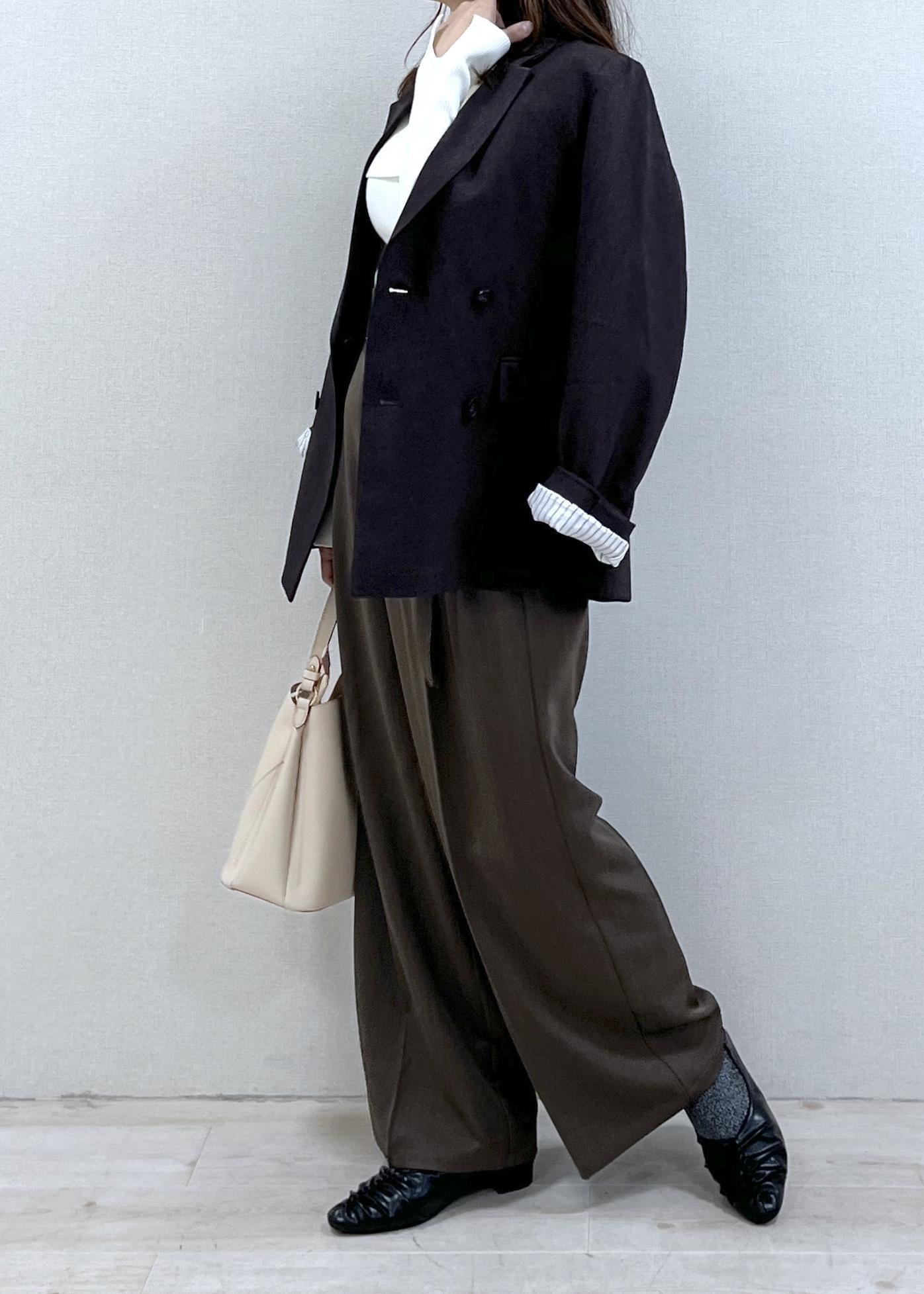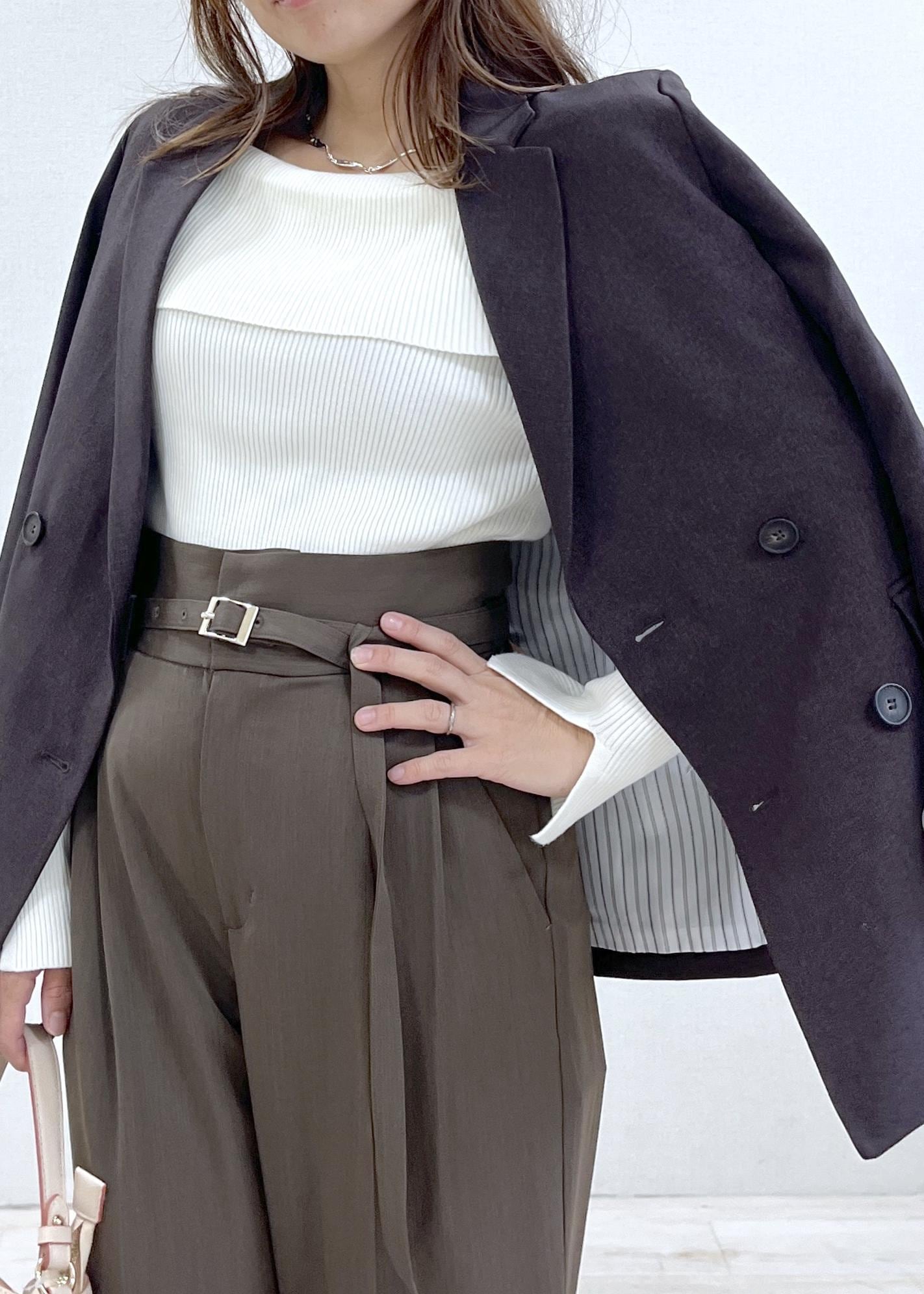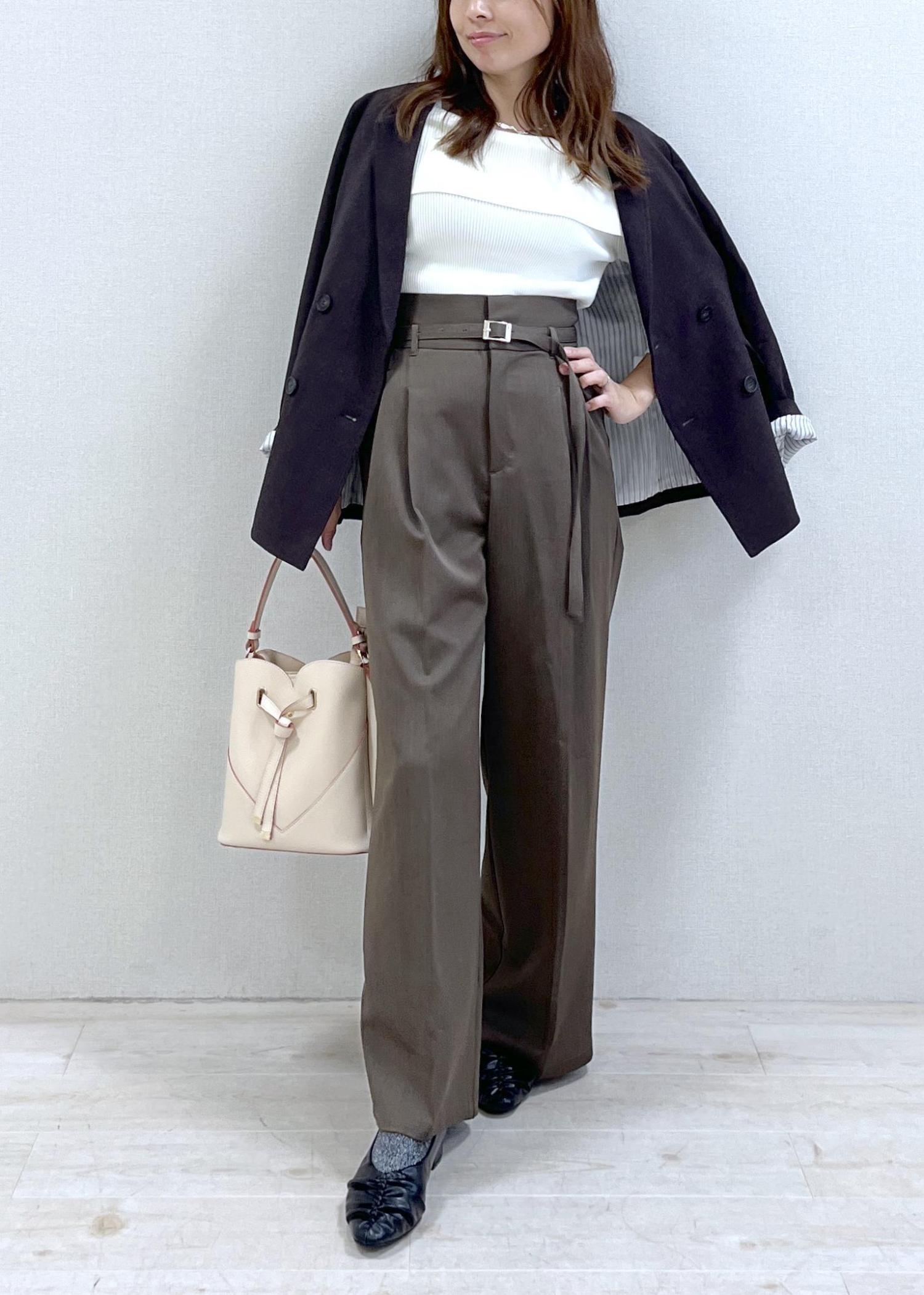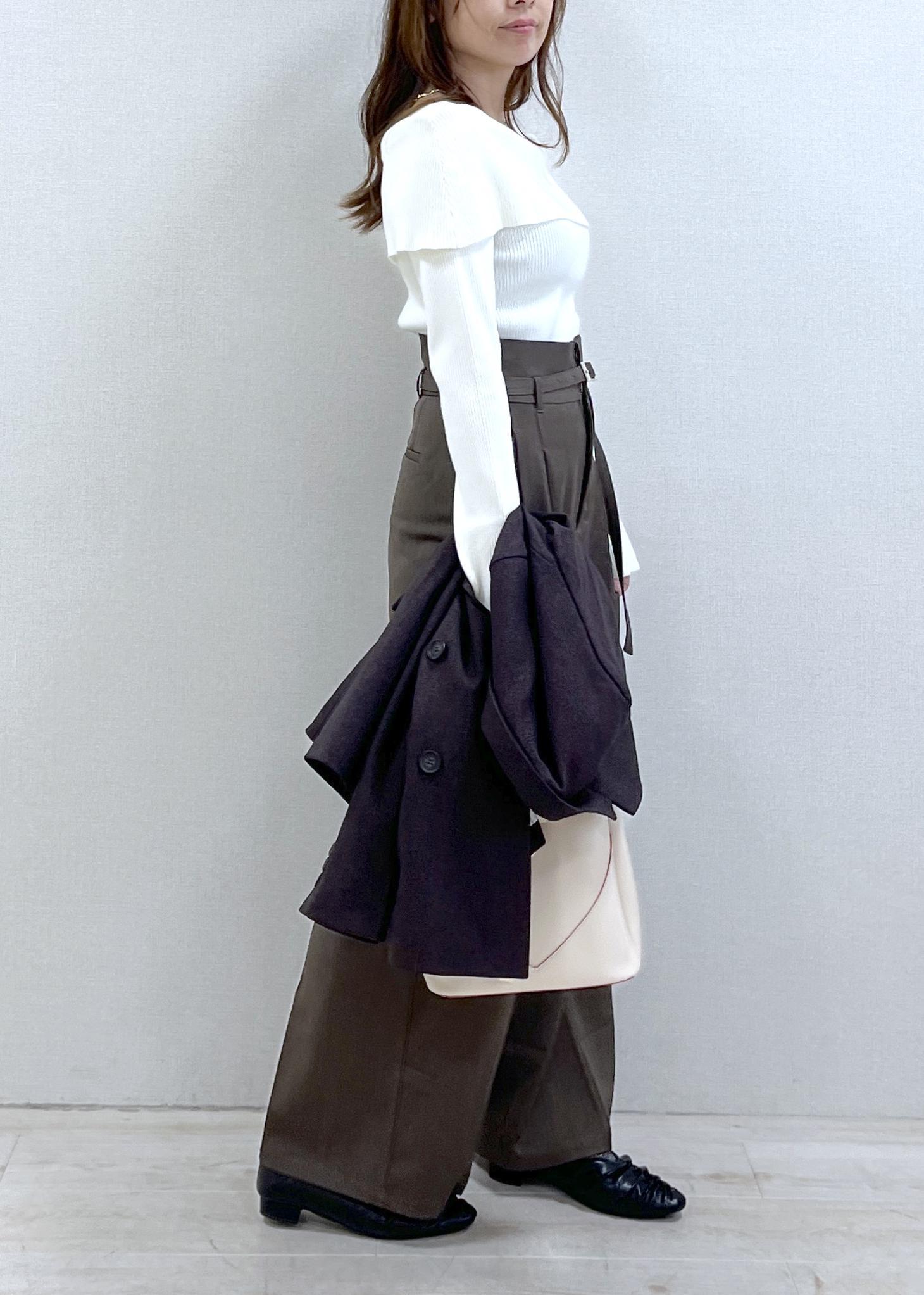 オフショル風ニットにハイウエストのワイドパンツを合わせて、きれいめだけど力の抜けた大人コーデにしました。
