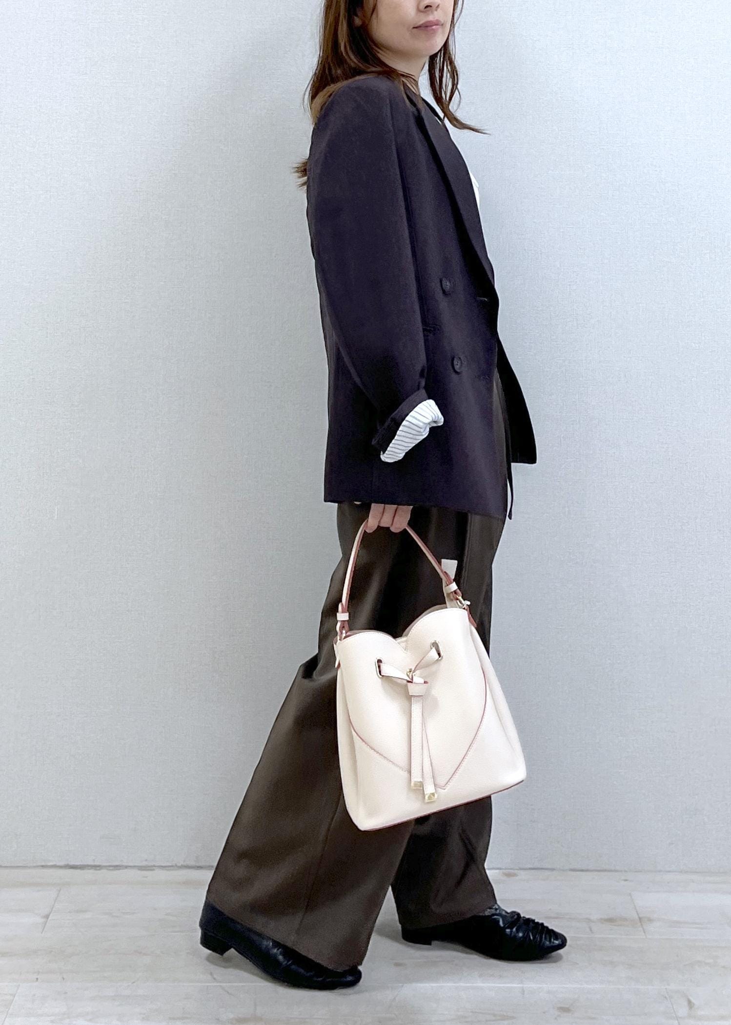 淡いカラーのバッグを合わせて、全体をやわらかく仕上げてます。