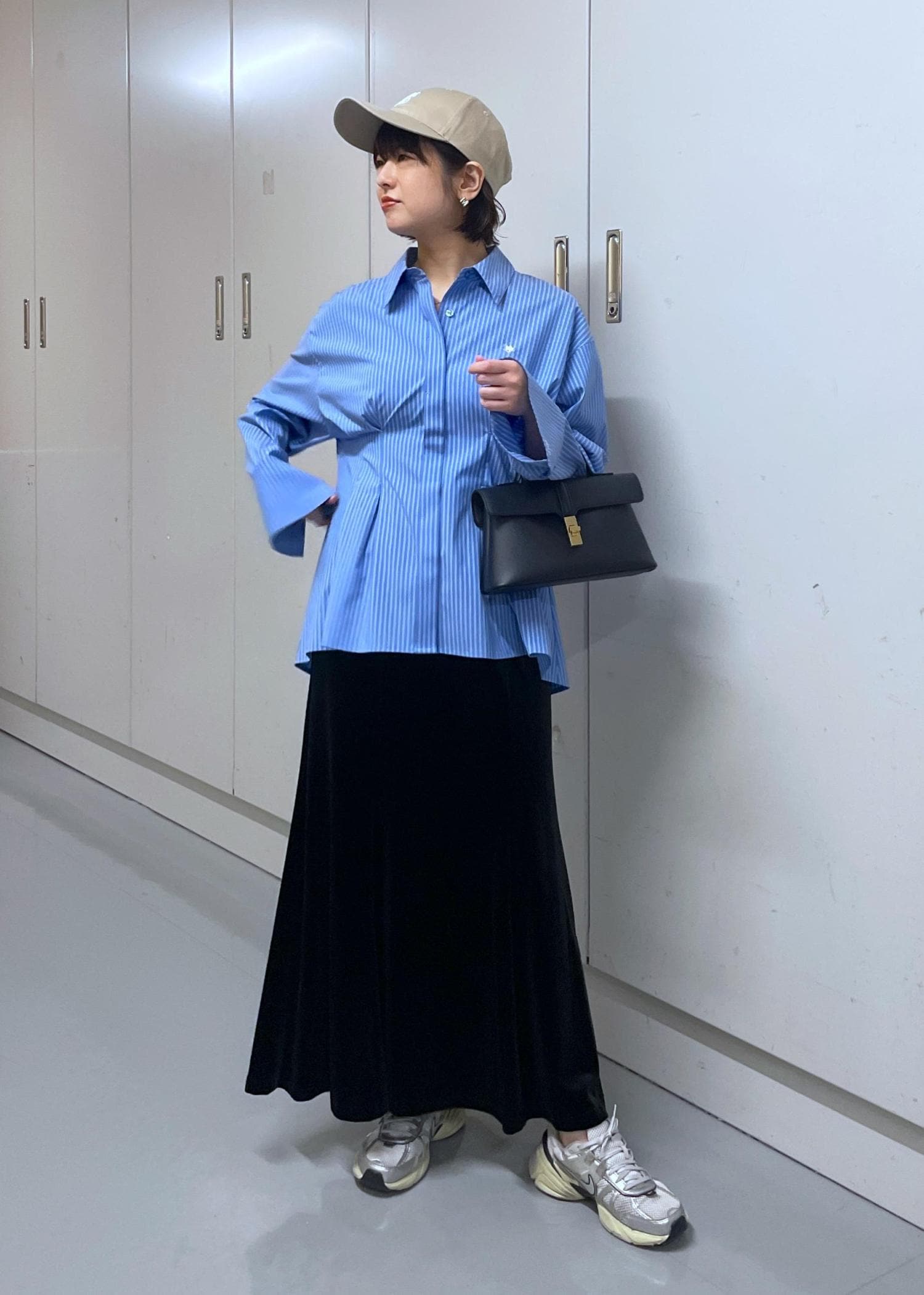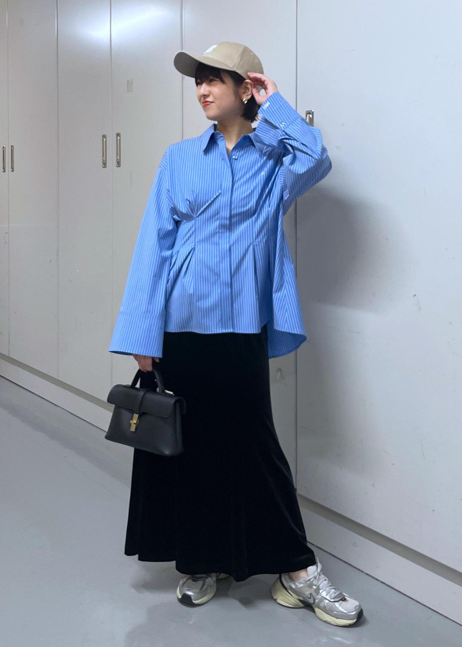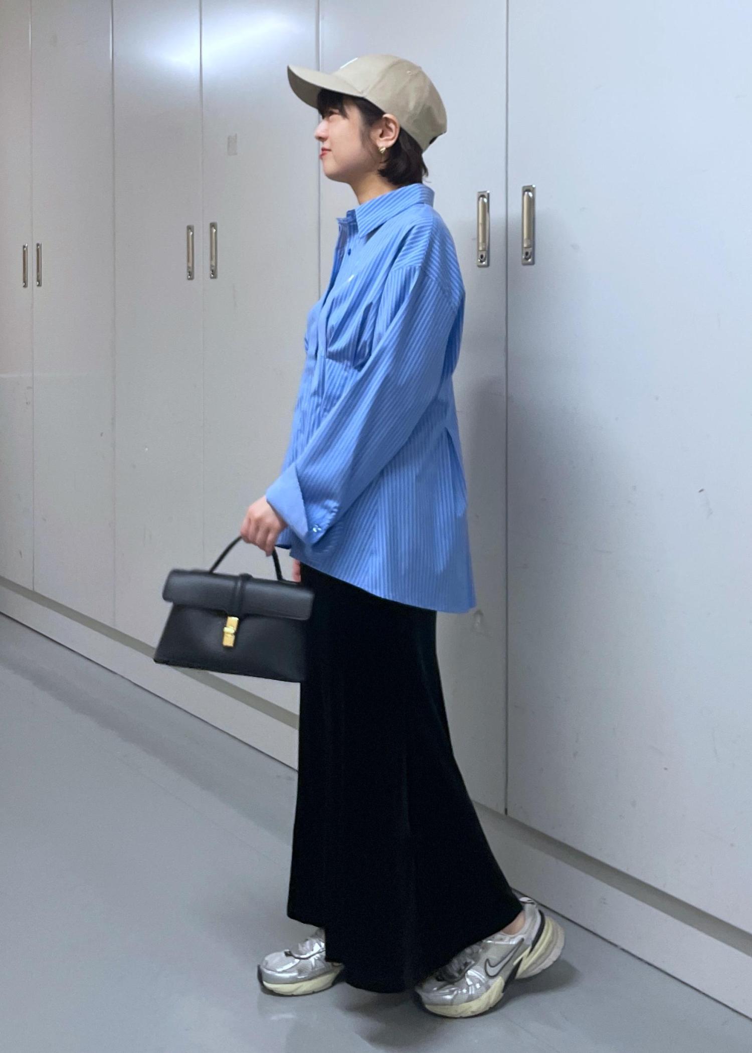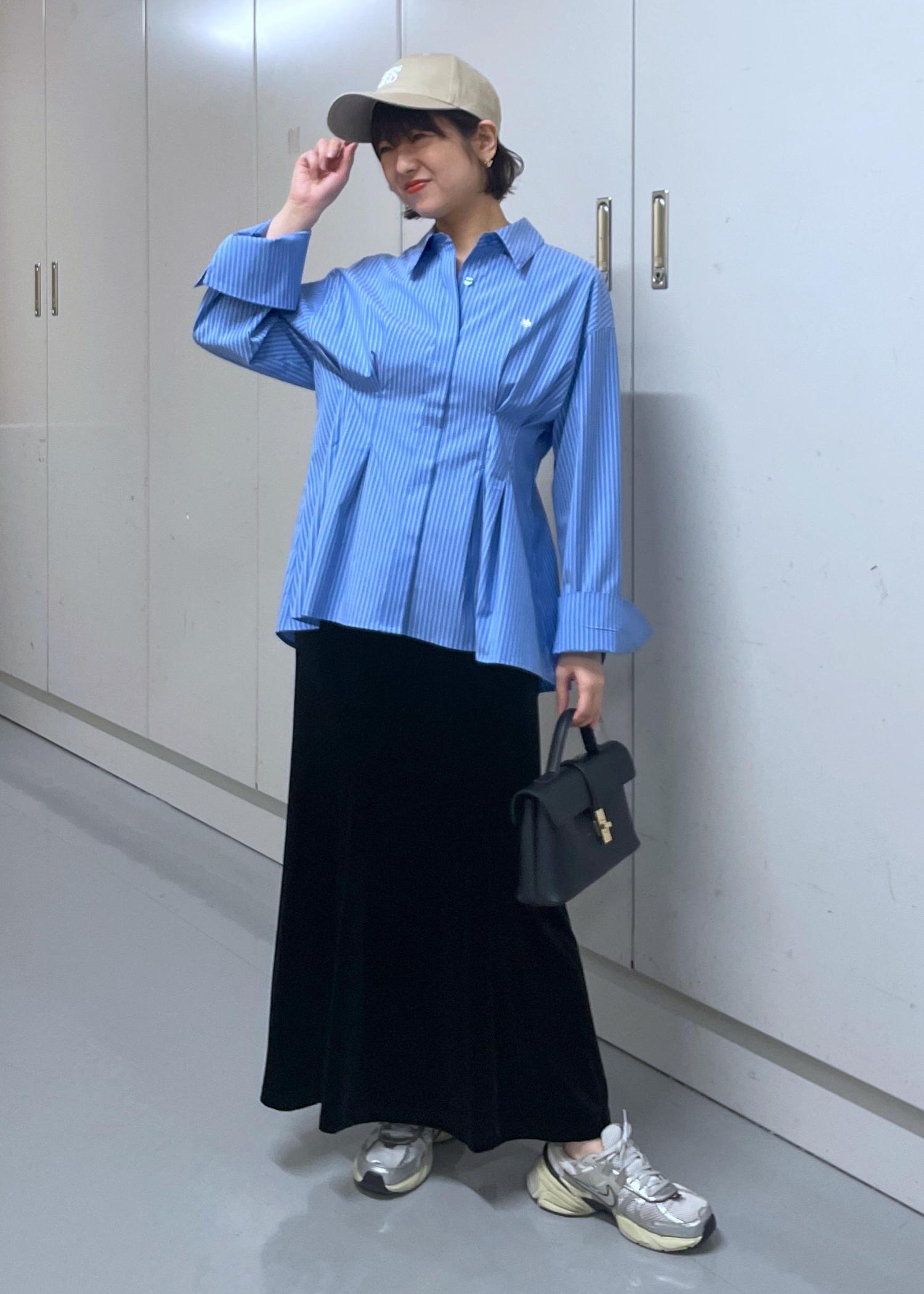 ベロア素材で艶感があるので、カジュアルからきれい目なコーデにも合わせやすいです。 -