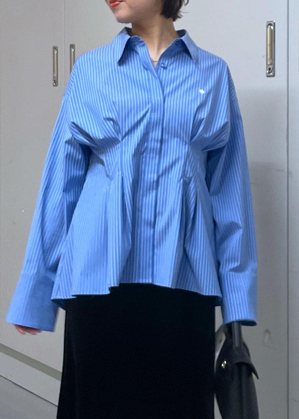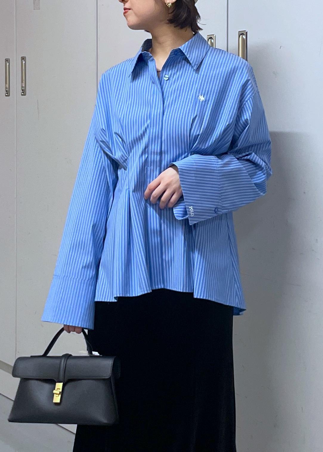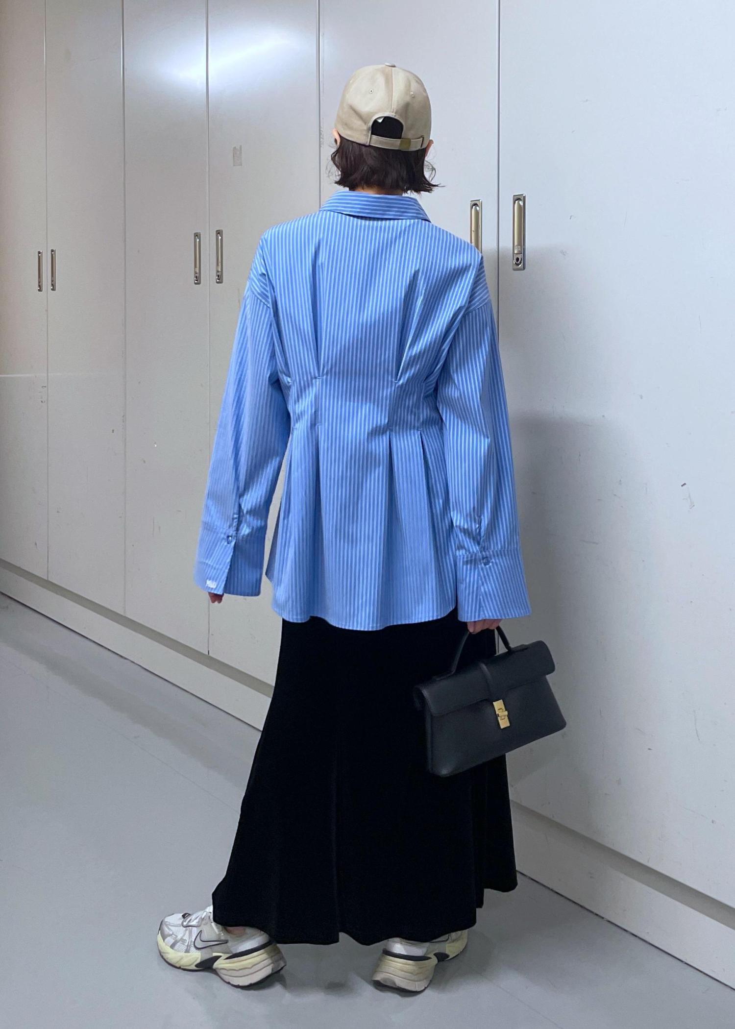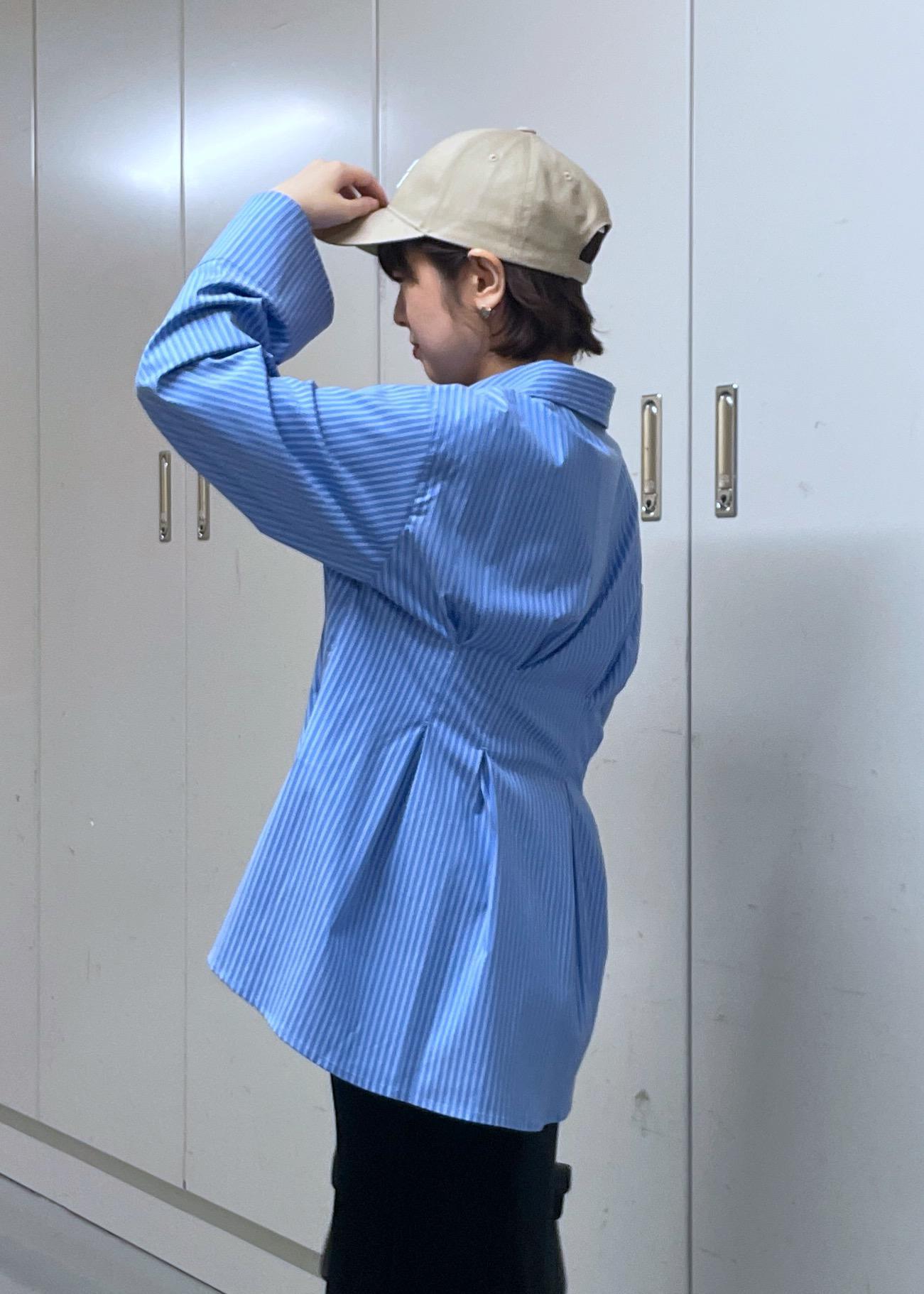 肩周りやアームにゆとりあり、オーバーシルエットですがウエストにタックが入っていることで女性らしくメリハリある印象になります◎ -
