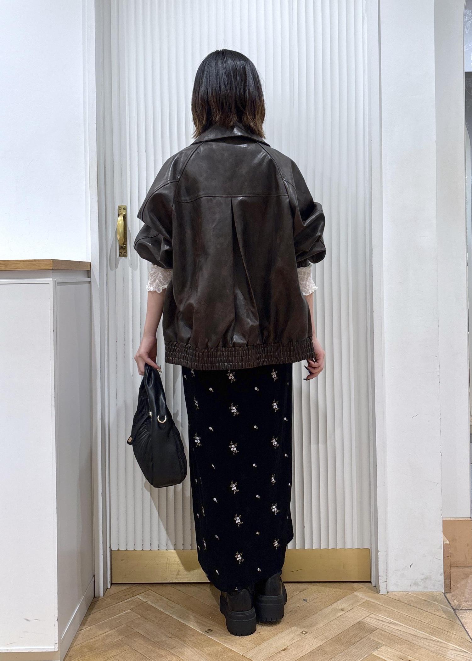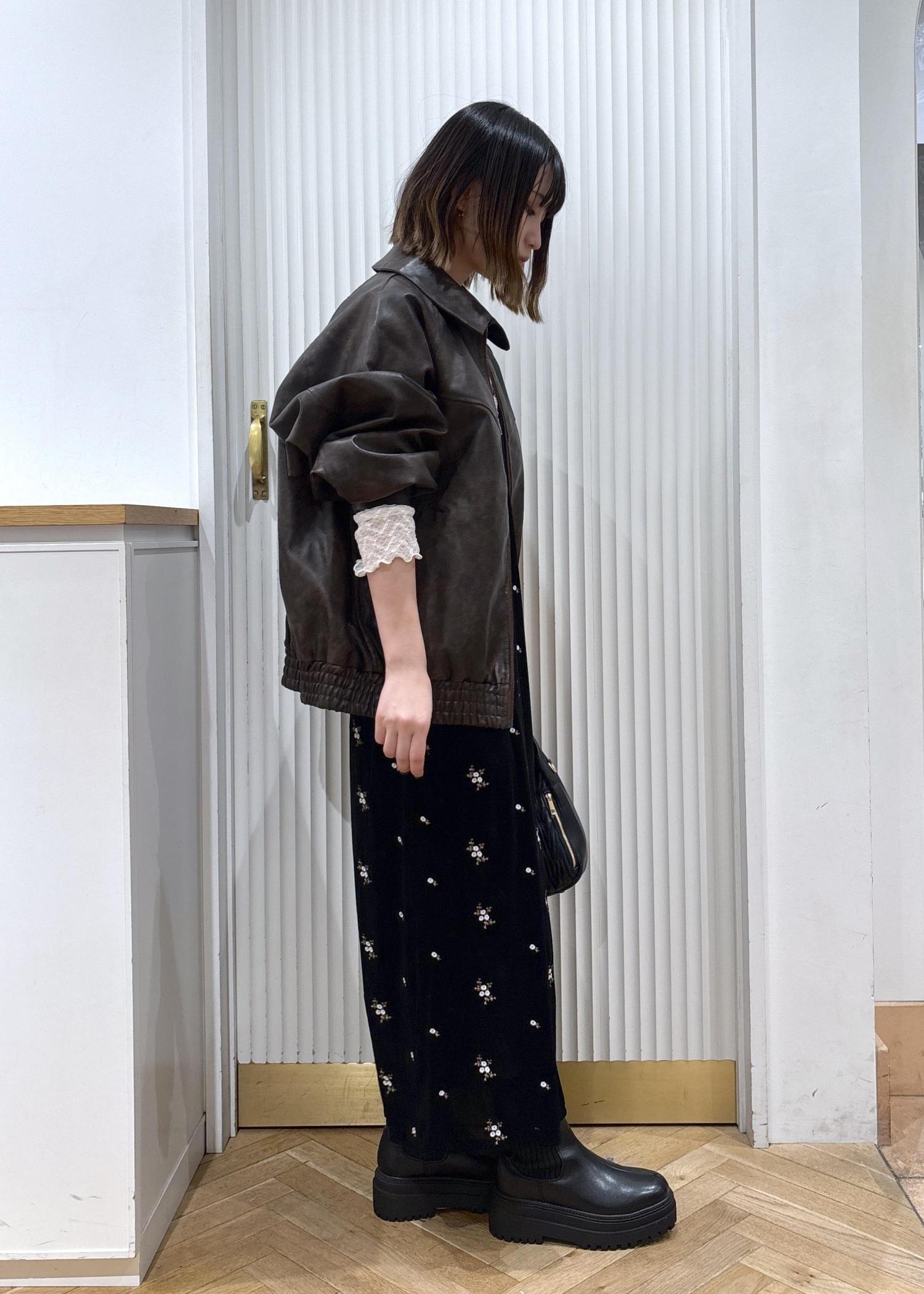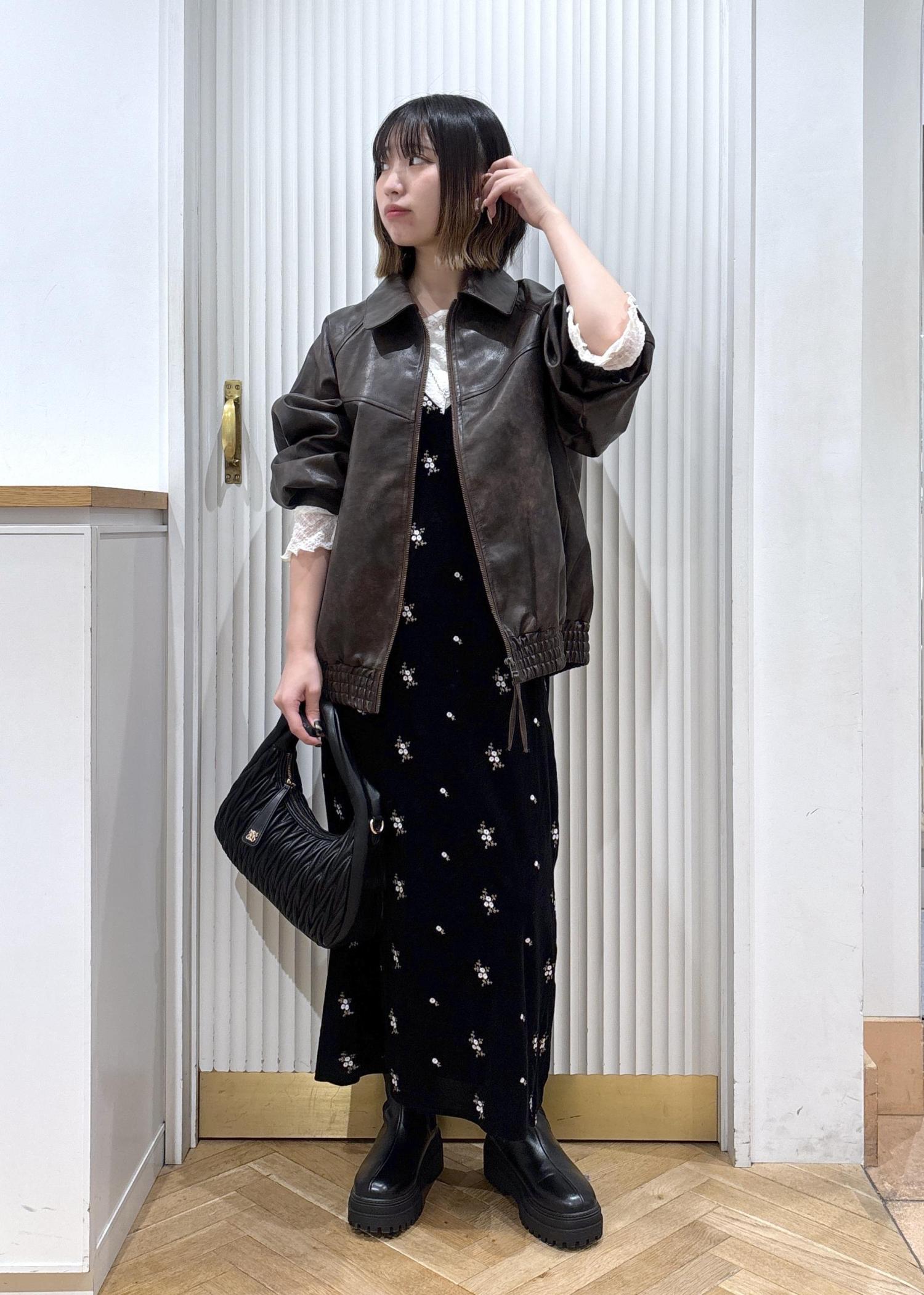ベロアのワンピースに合皮ジャケットを合わせたカジュアルコーデです!モノトーンを基調としているため合皮をブラウンにすることで秋らしさがぐっとあがりコーディネートが重たくなりすぎないのがポイントです!レースや花柄を入れることで女性らしさがプラスされカジュアルすぎないコーデになります!