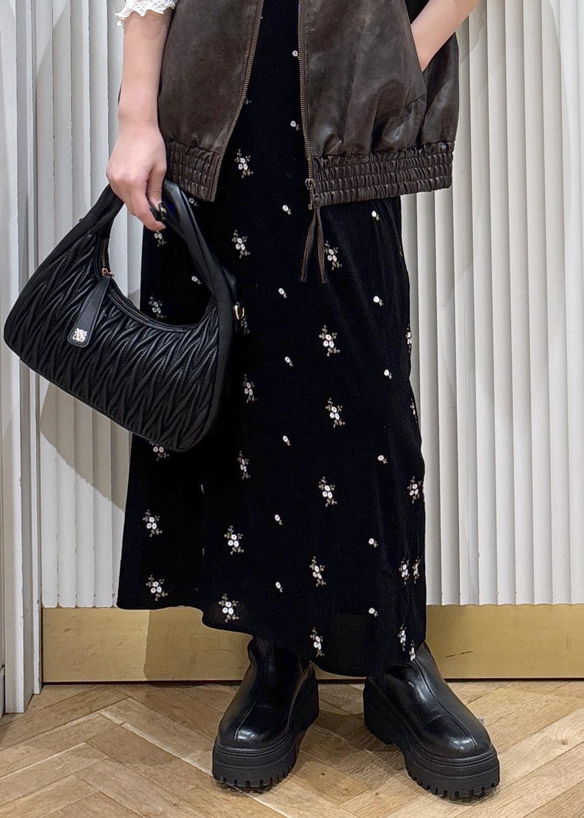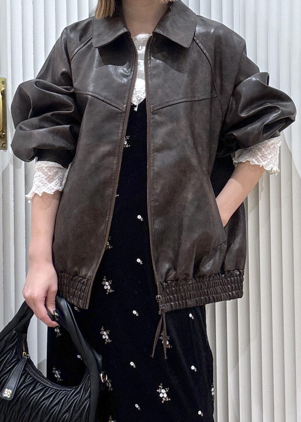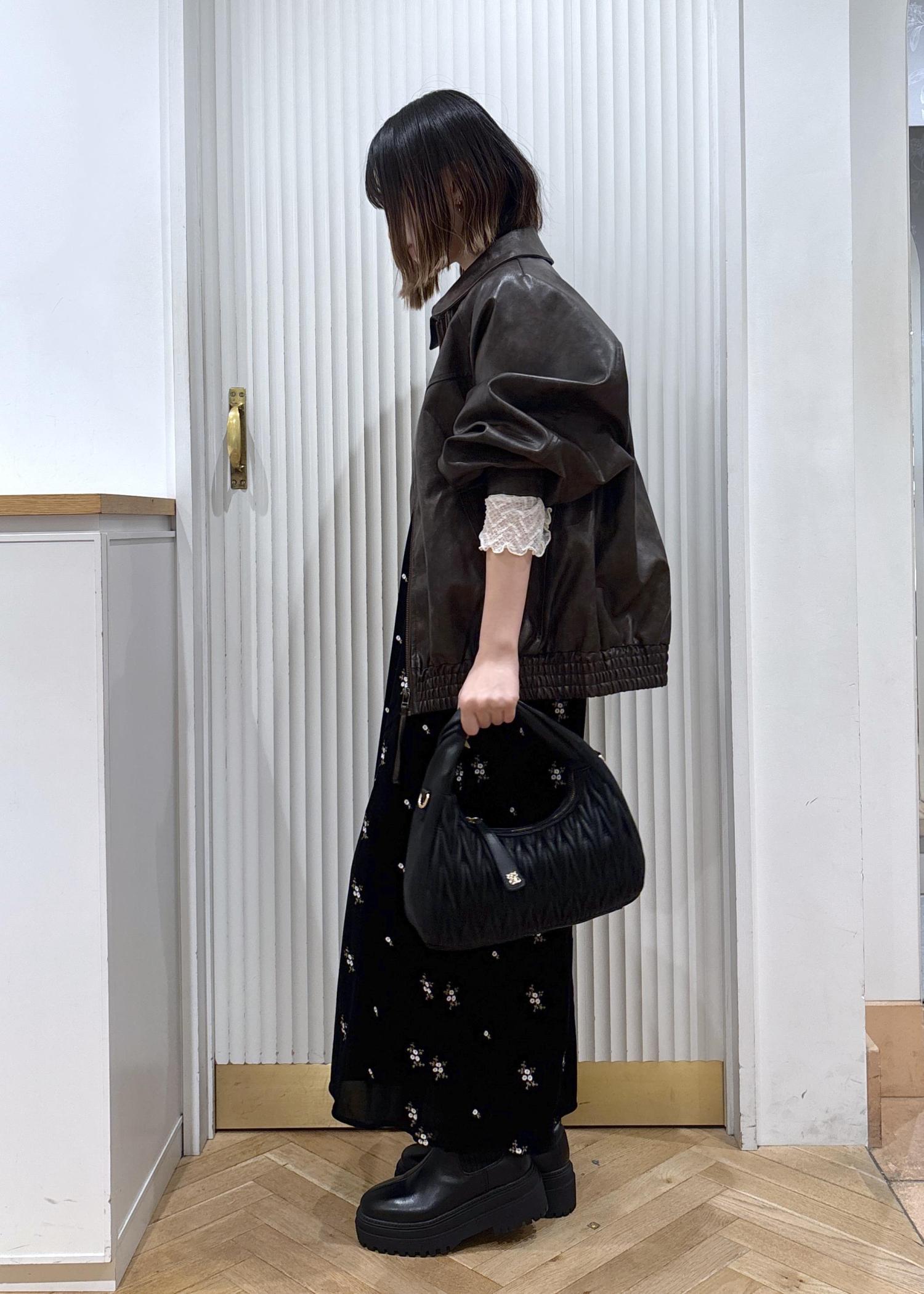 ベロアのワンピースに合皮ジャケットを合わせたカジュアルコーデです!モノトーンを基調としているため合皮をブラウンにすることで秋らしさがぐっとあがりコーディネートが重たくなりすぎないのがポイントです!レースや花柄を入れることで女性らしさがプラスされカジュアルすぎないコーデになります!