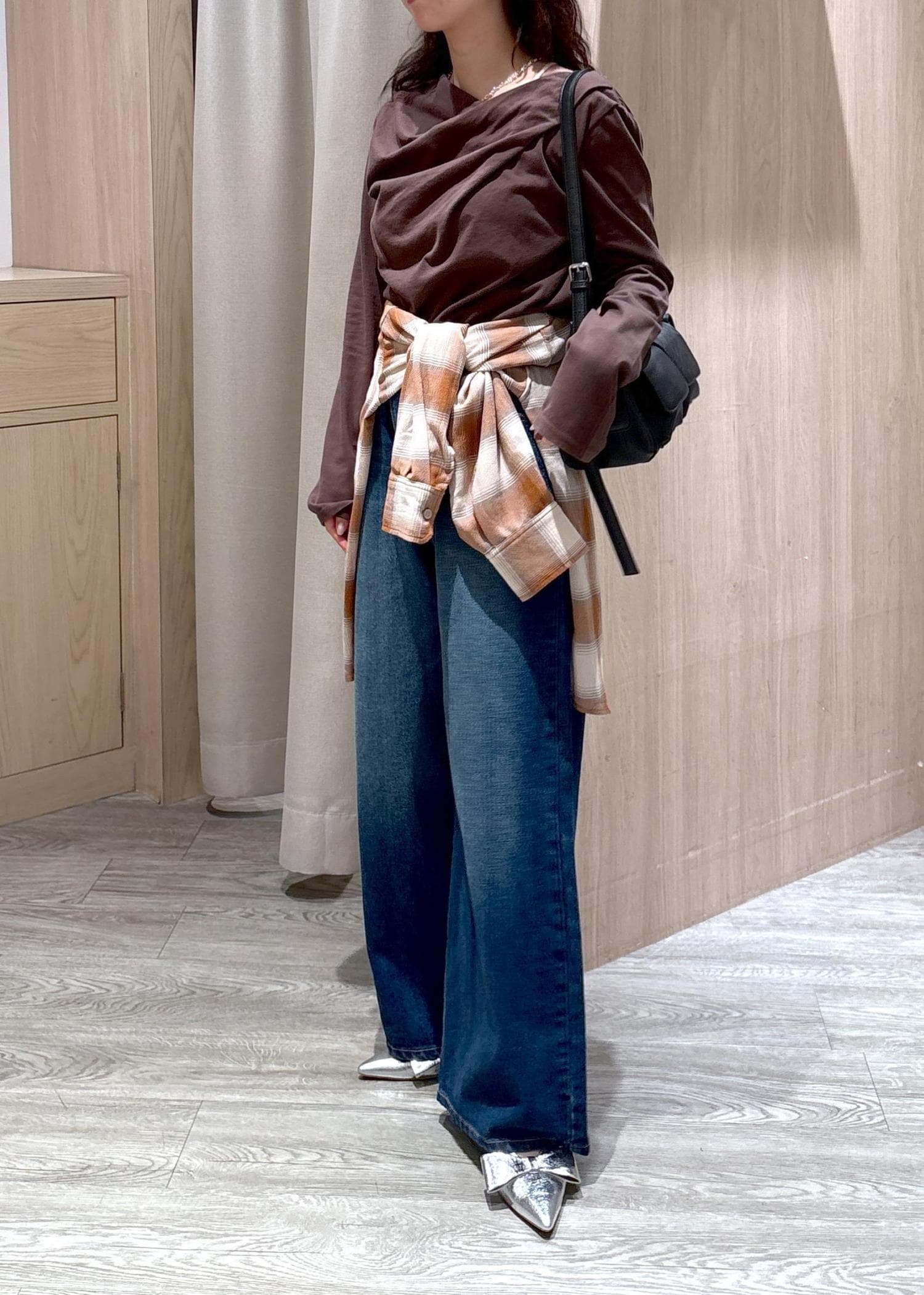 裾にかけてワイドに広がるシルエットで形がとても綺麗です!◎またデニムも程よい柔らかさで履き着心地も◎ -