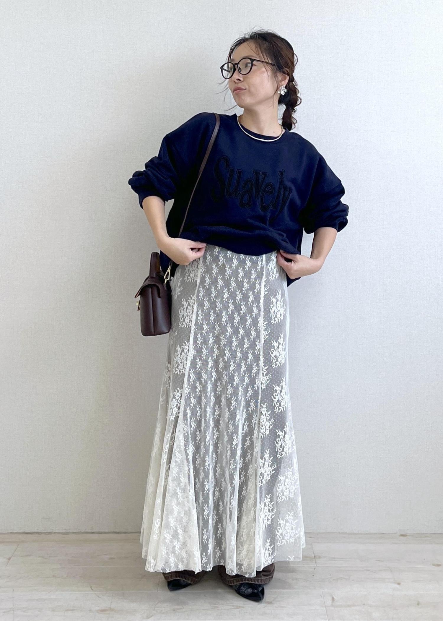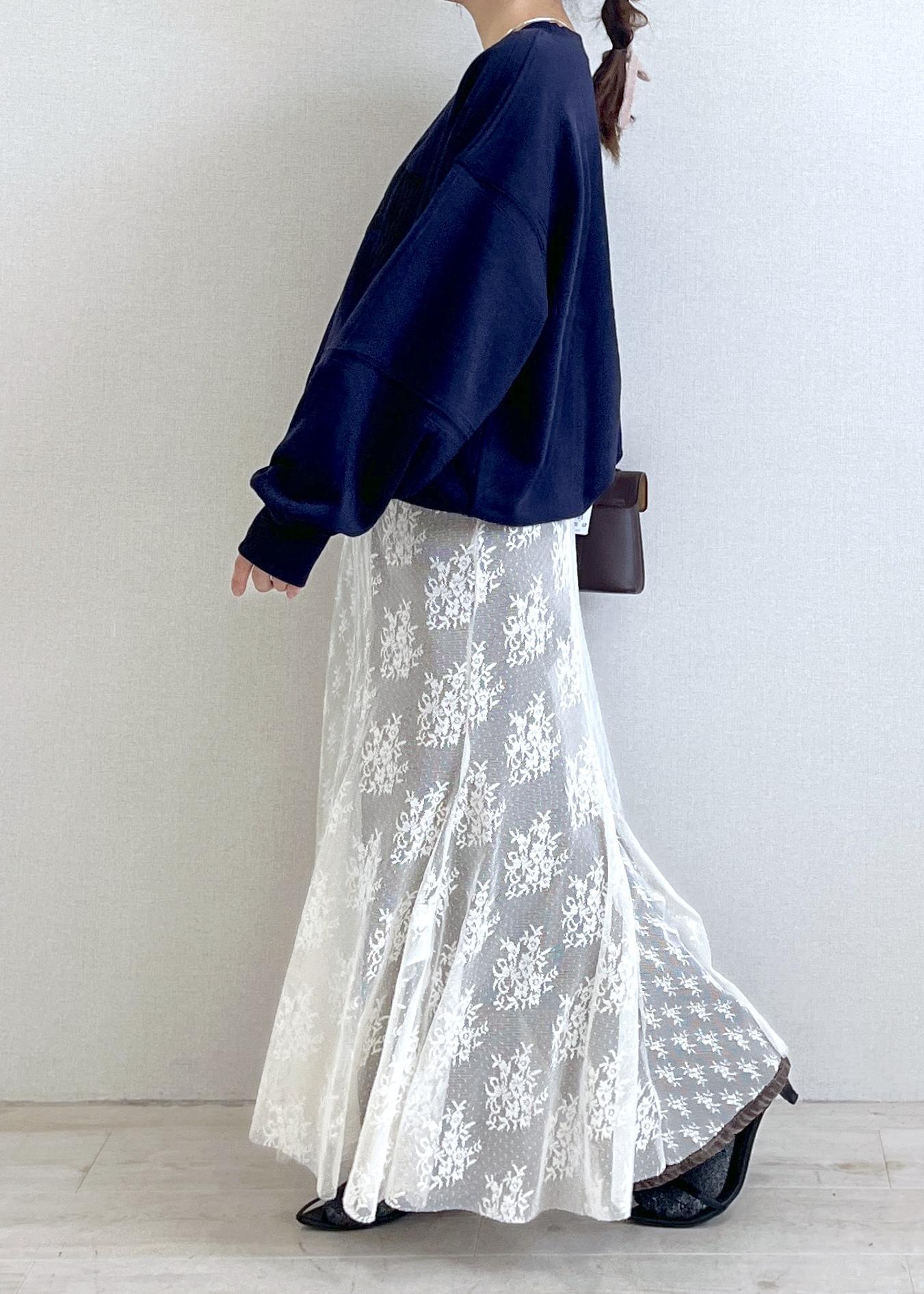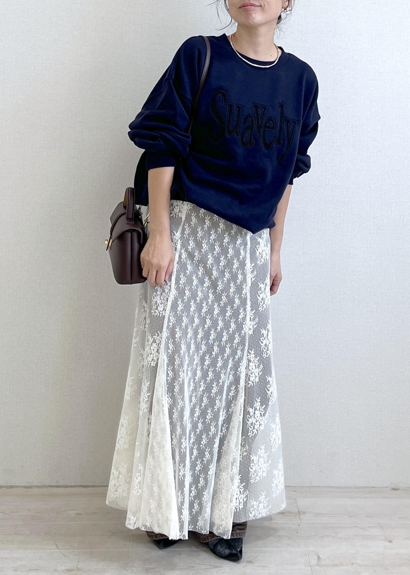 ロゴスウェットにレーススカートを重ねた、ちょっぴりモードなレイヤードスタイル。