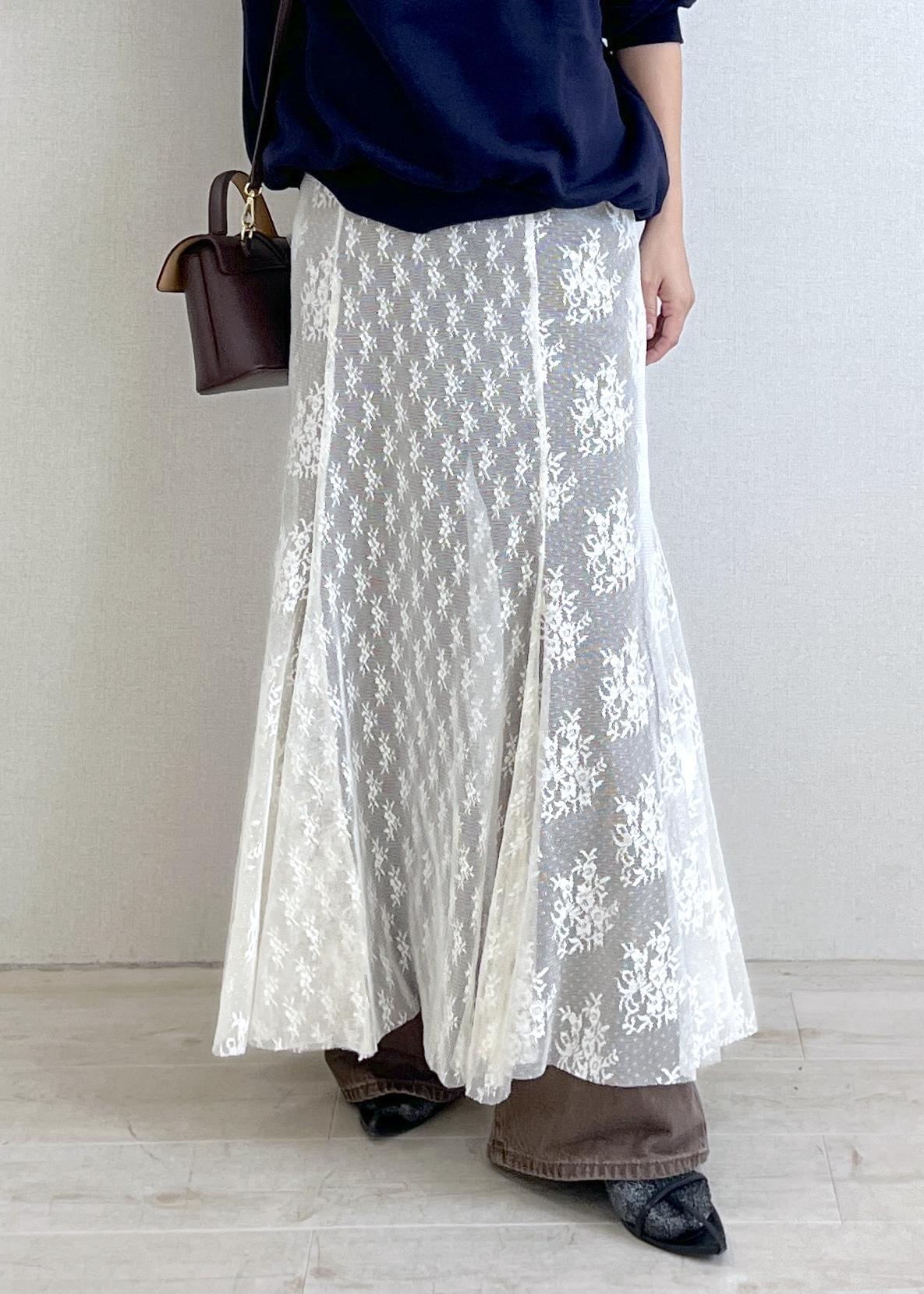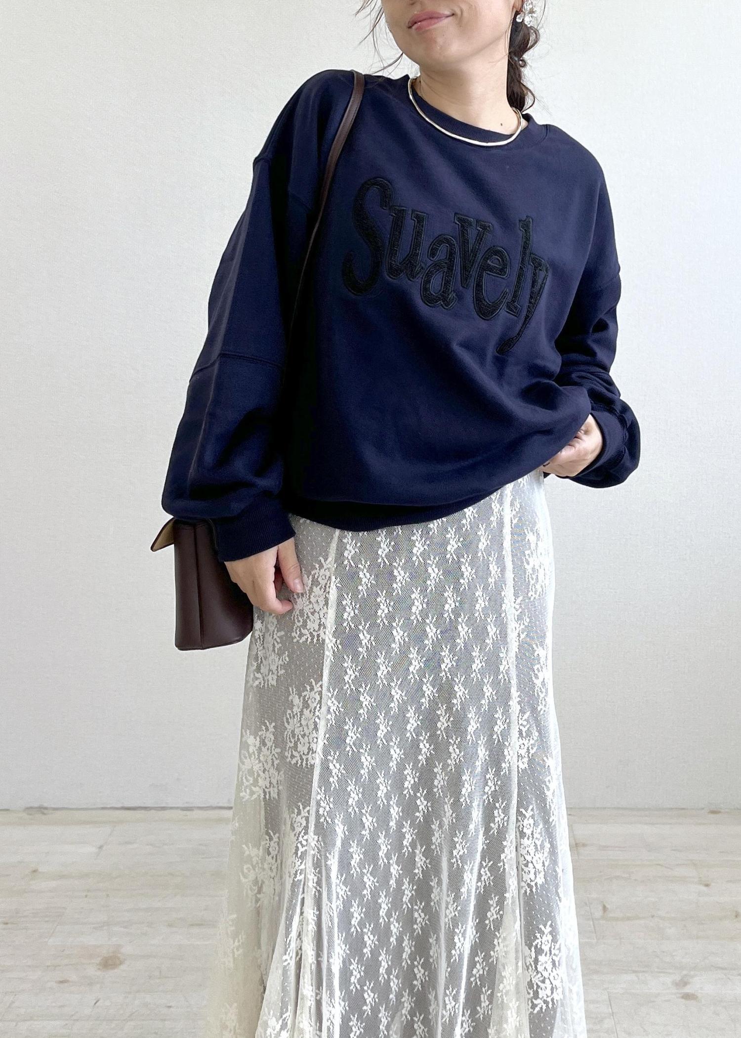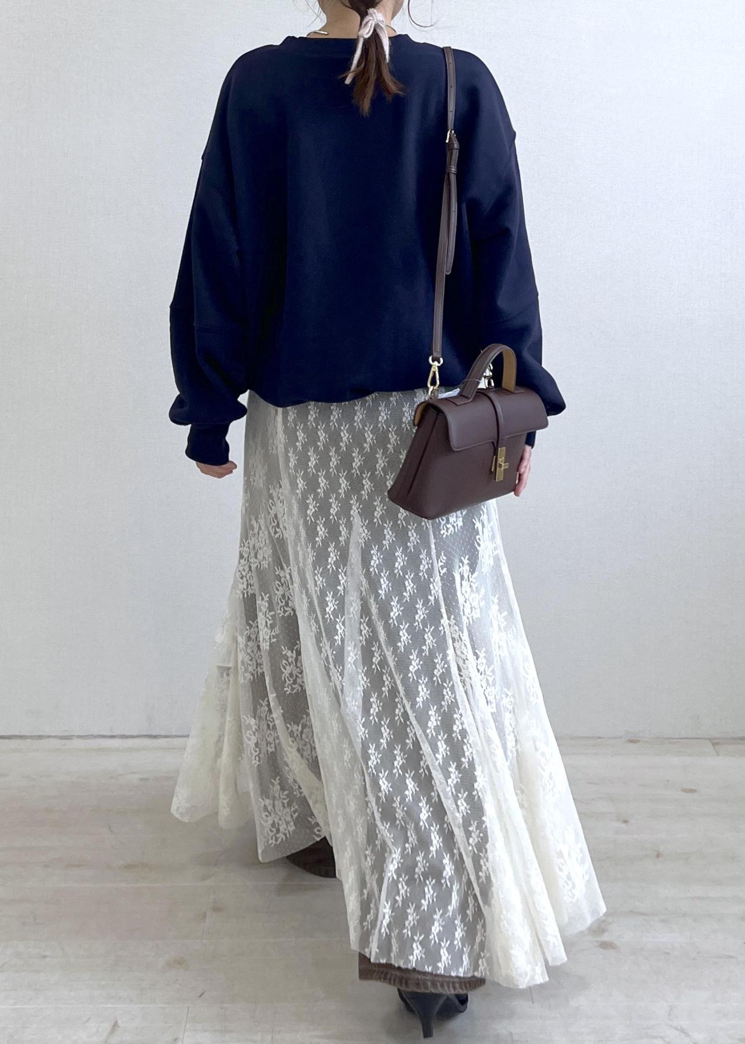 ロゴスウェットにレーススカートを重ねた、ちょっぴりモードなレイヤードスタイル。