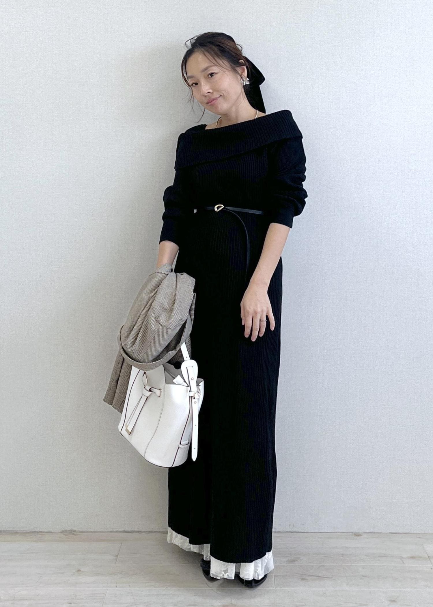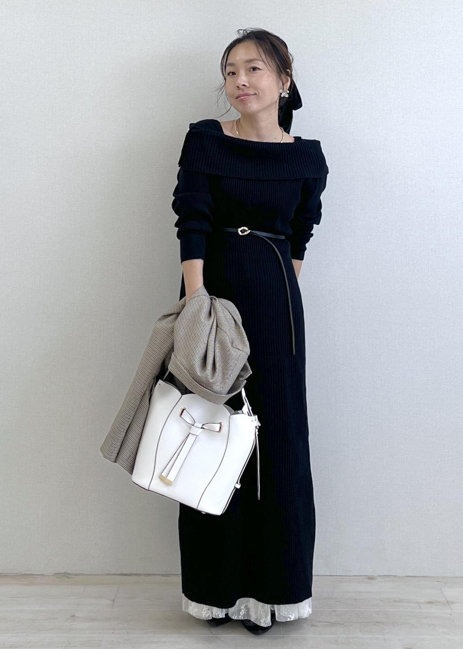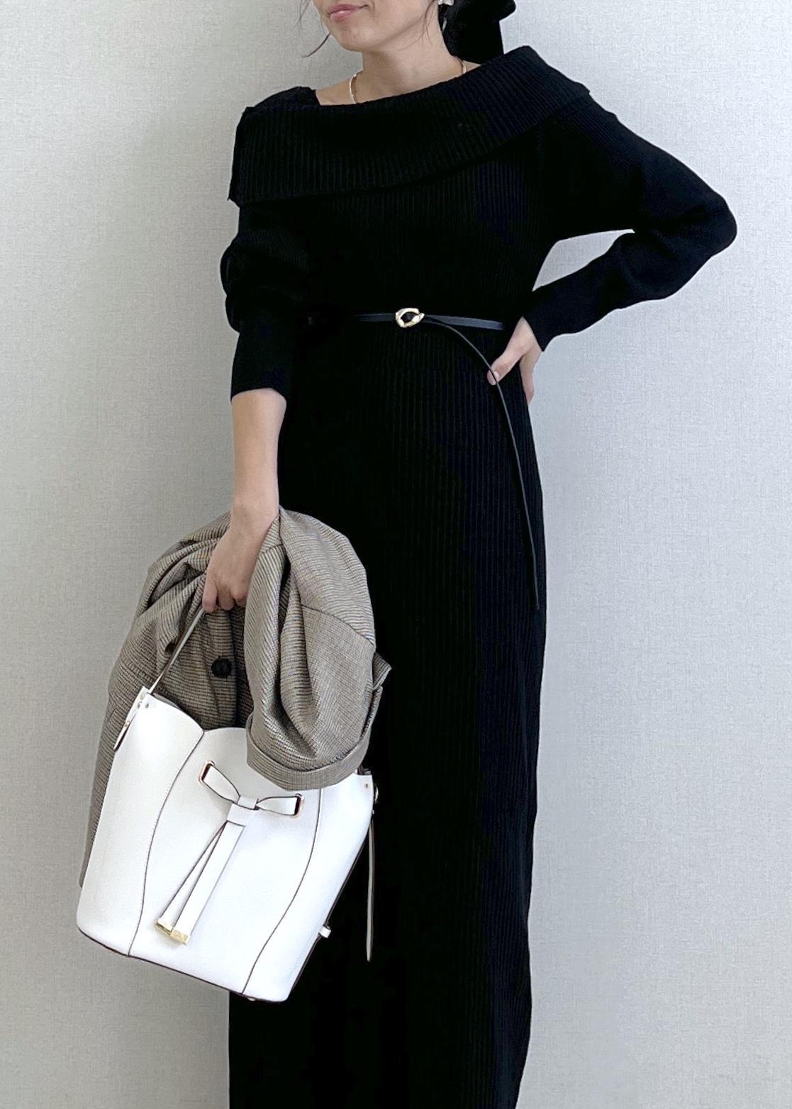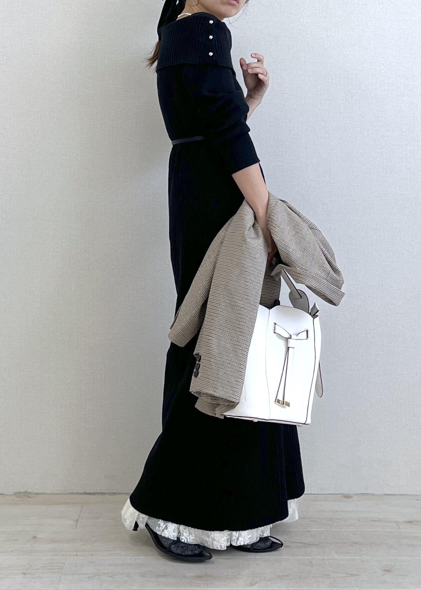 小物は白バッグで抜け感を出して、重くなりがちな秋の黒コーデを軽やかに仕上げました。