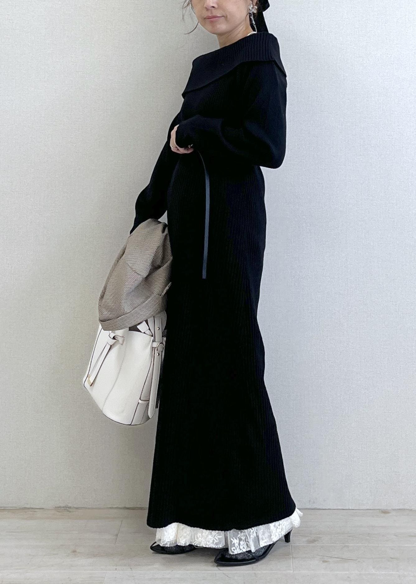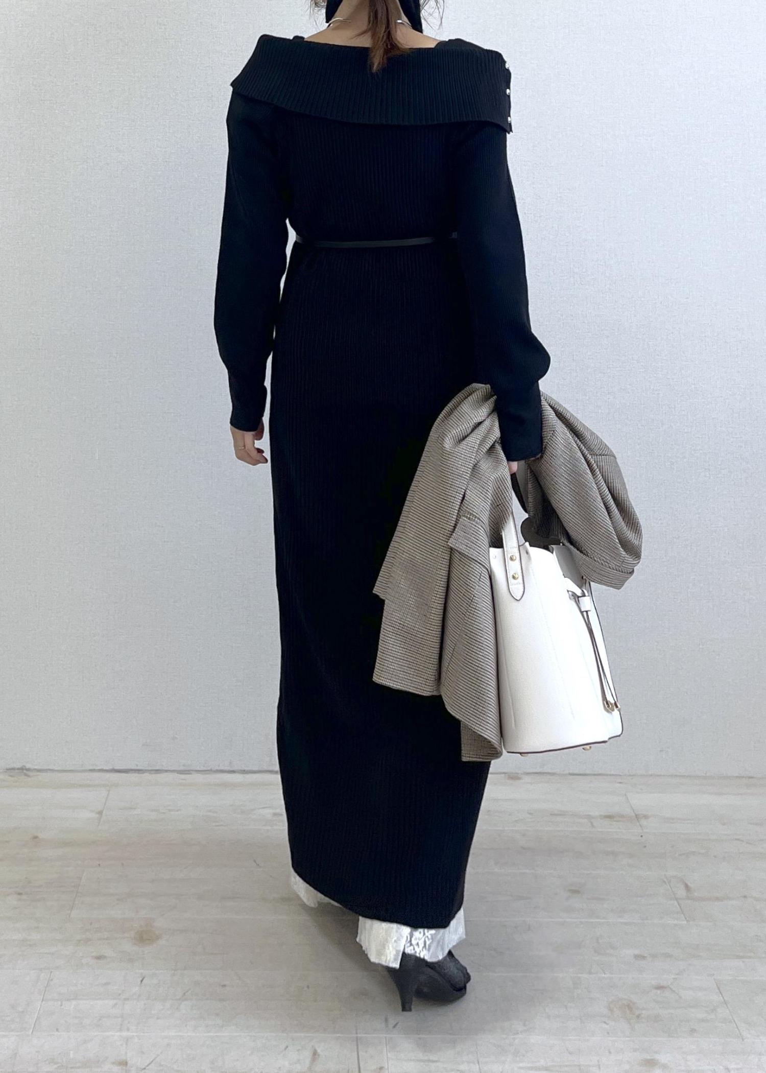 オフショル風のリブニットワンピにレースを重ねて、奥行きのある黒スタイルに。