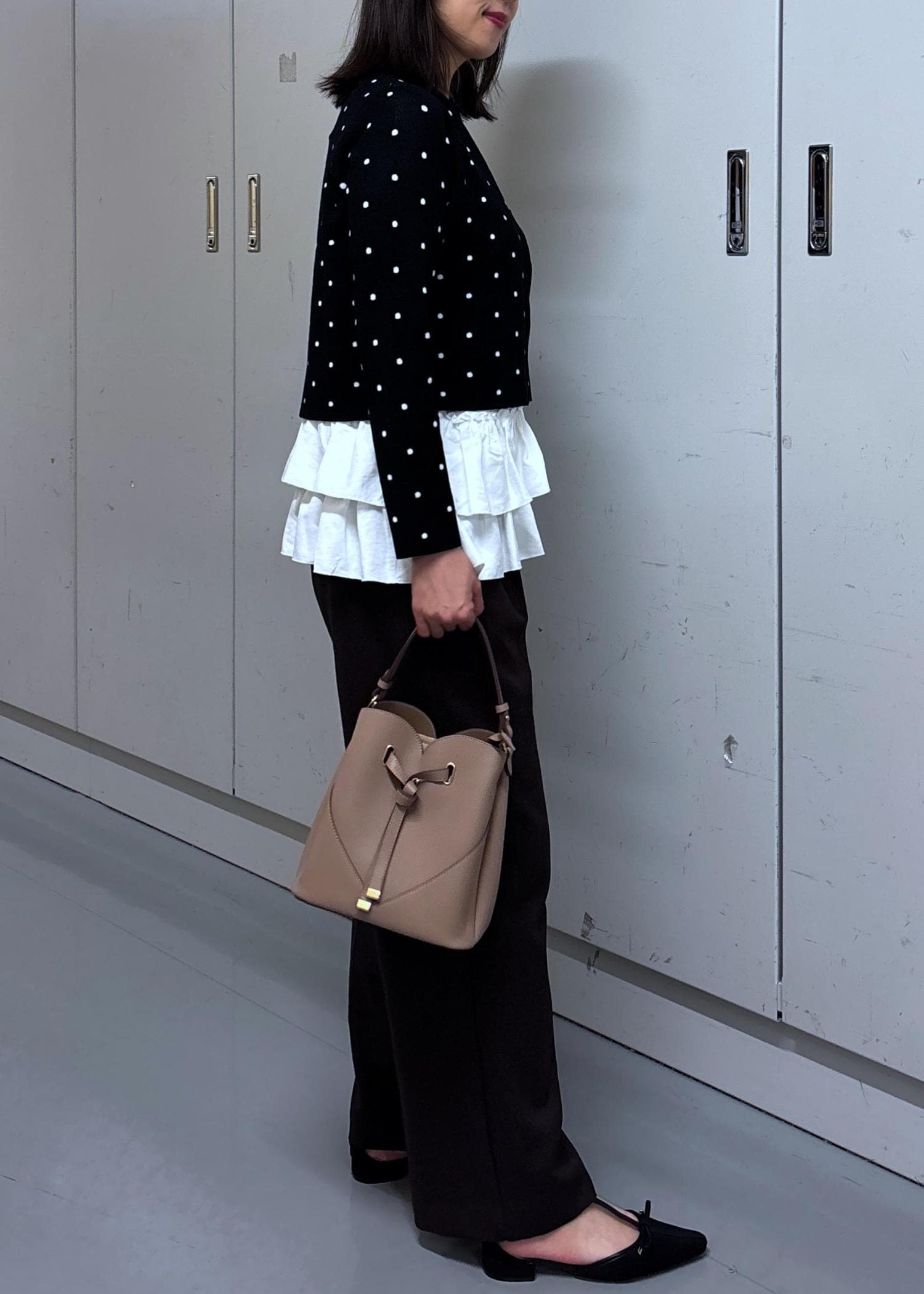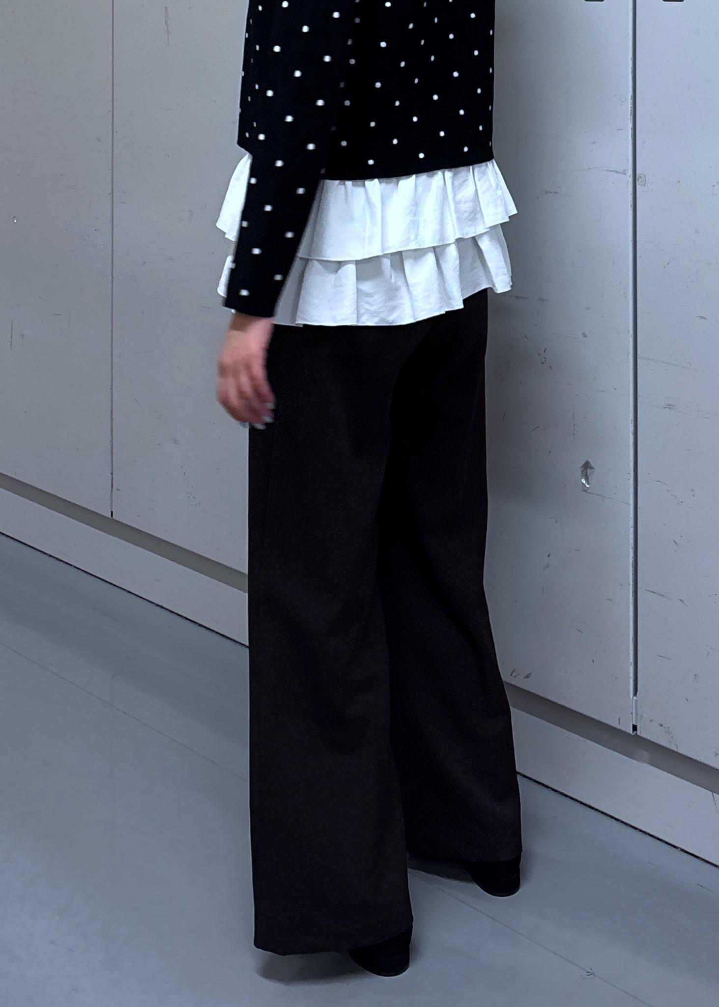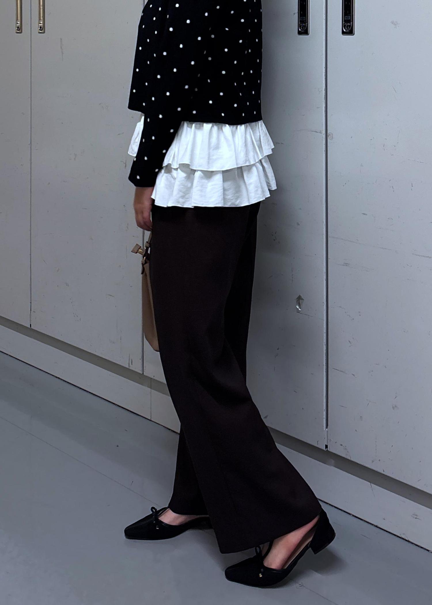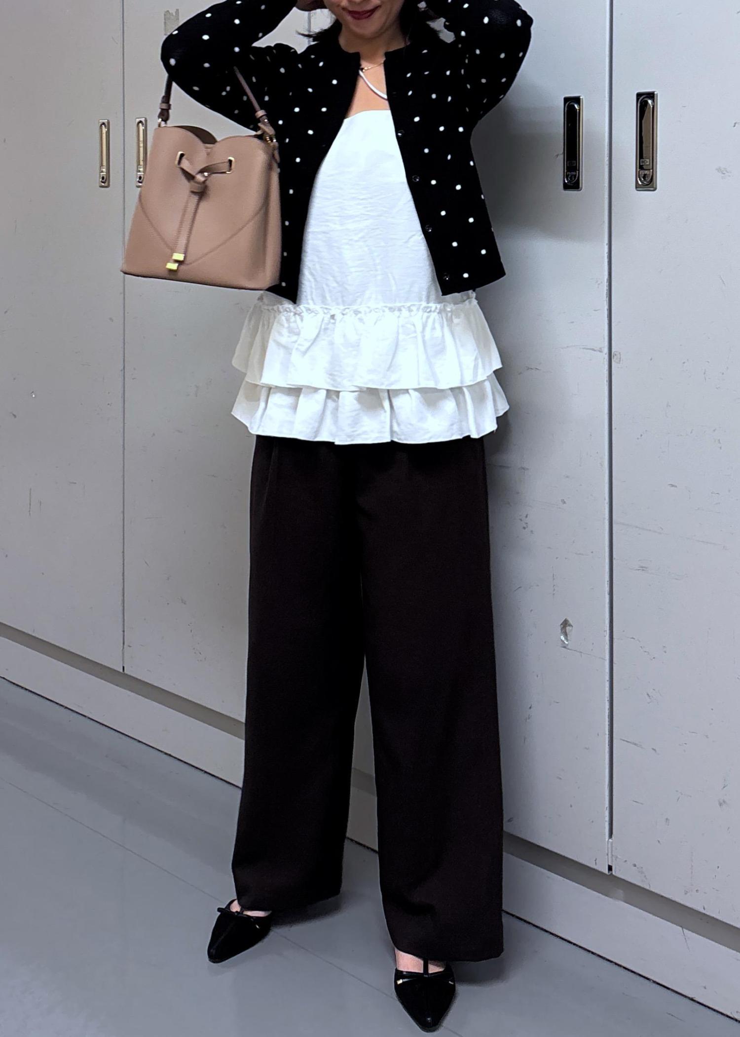 滑らかな肌触りのニットです。ドットが可愛いので、フェミニンな雰囲気のスタイリングが好きな方はオススメです。腰かかるくらいの着丈でした。