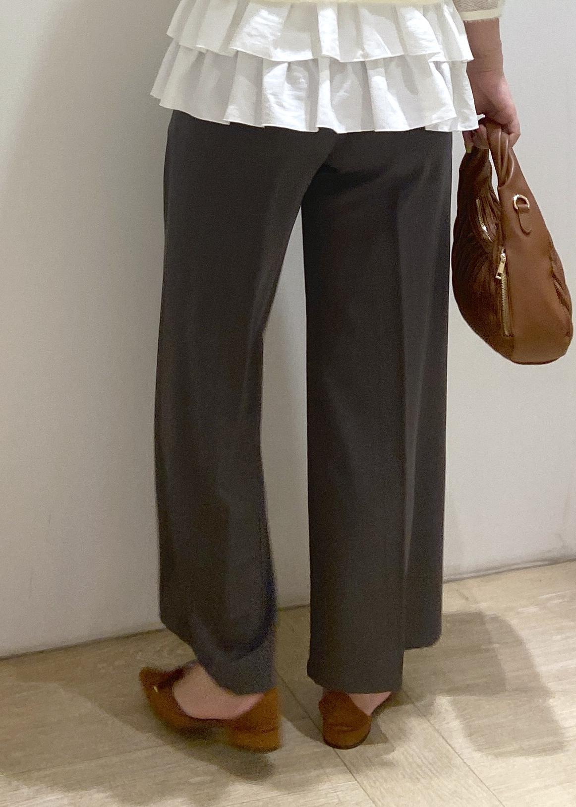 脚のラインを拾いにくいワイドシルエットですが、タックが入っていることでスッキリと見えやすいです。 -