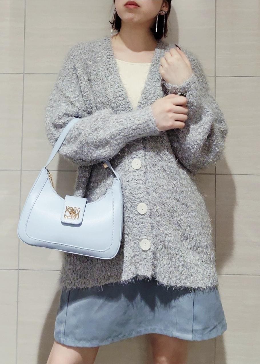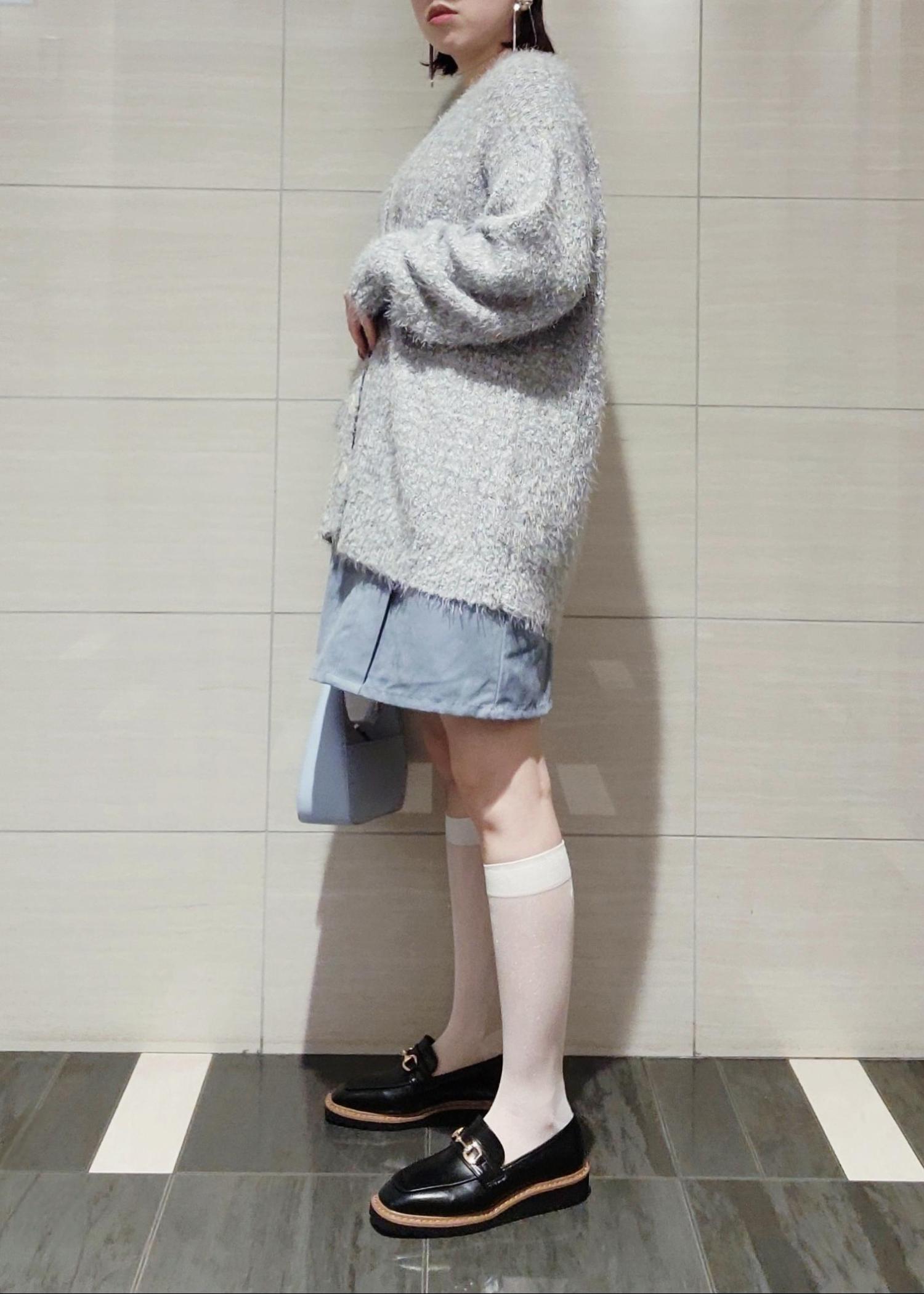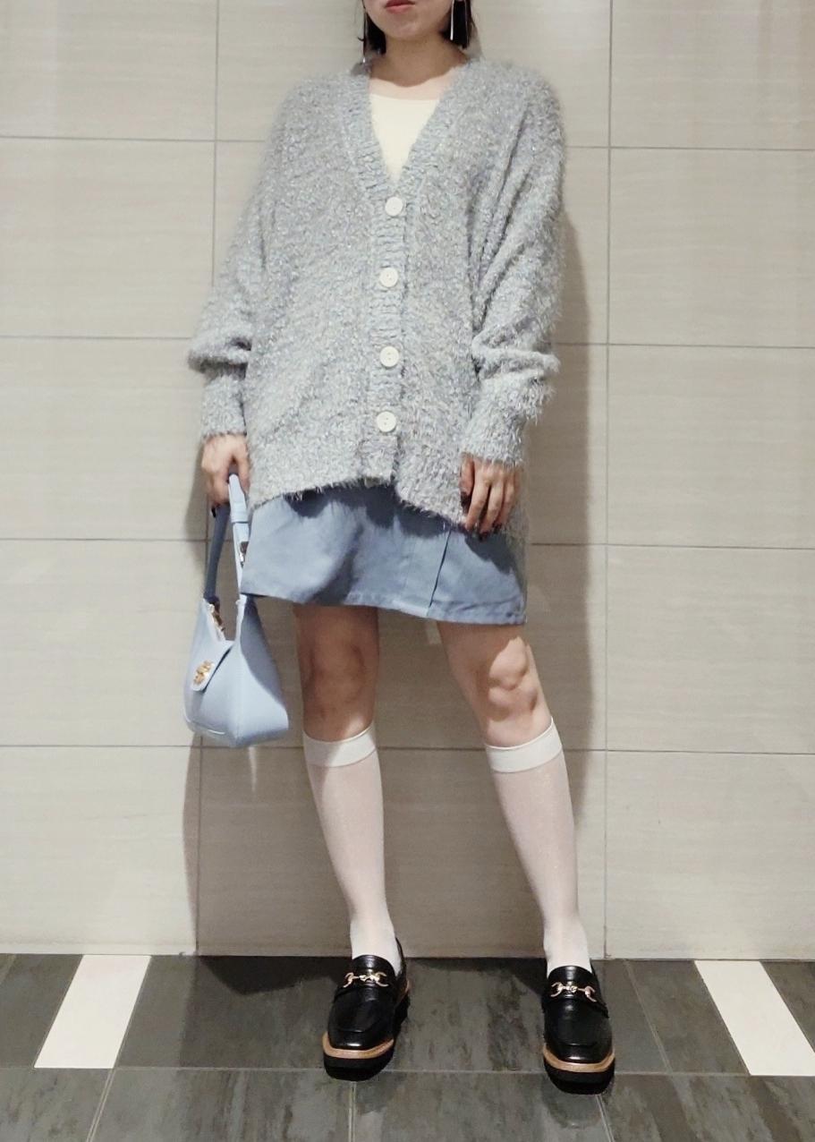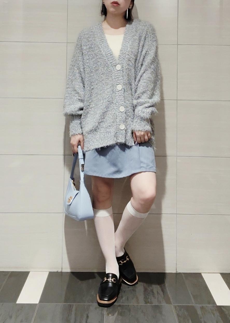 ゆったりめのカーディガンにミニスカを合わせて甘すぎないカジュアルめのコーディネートにしました。