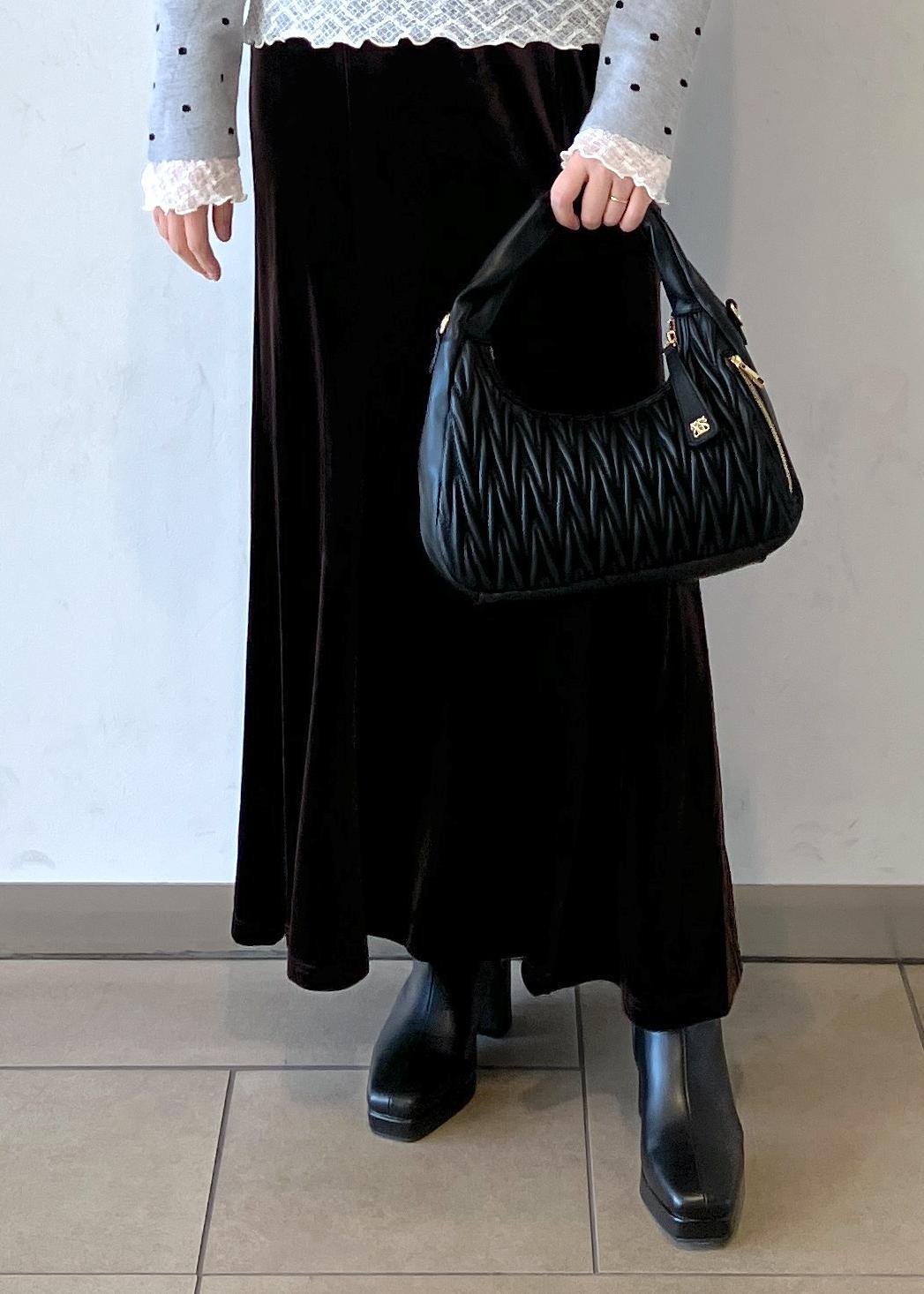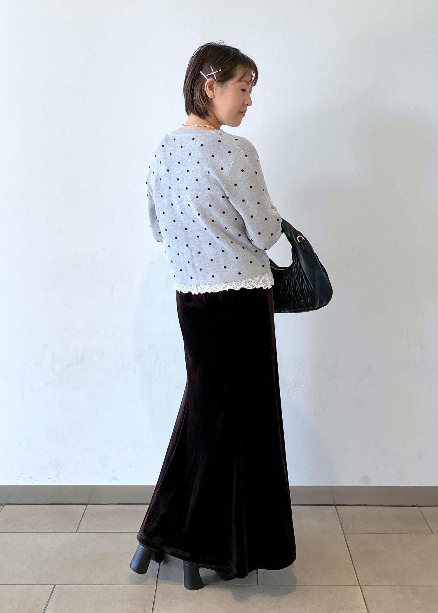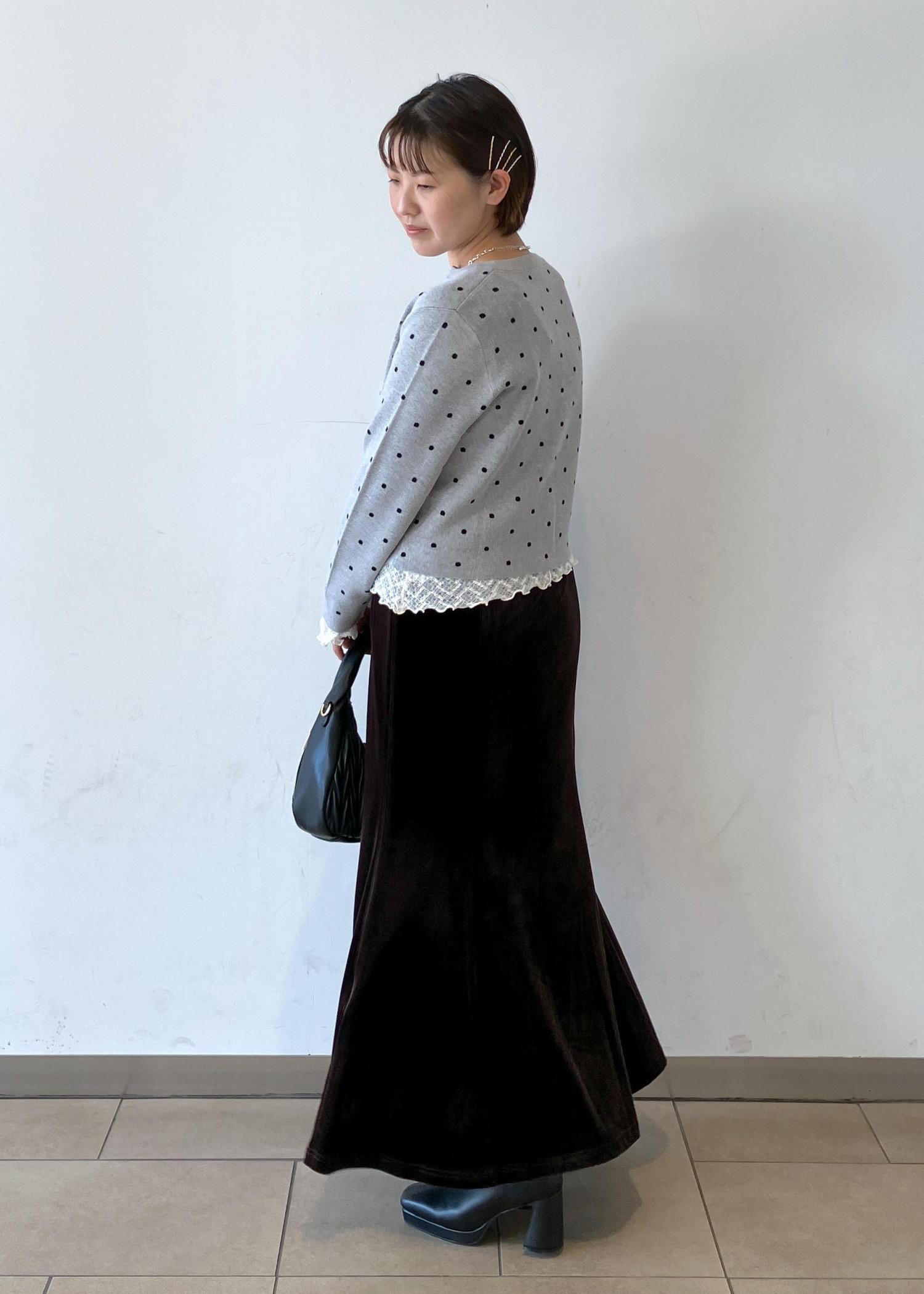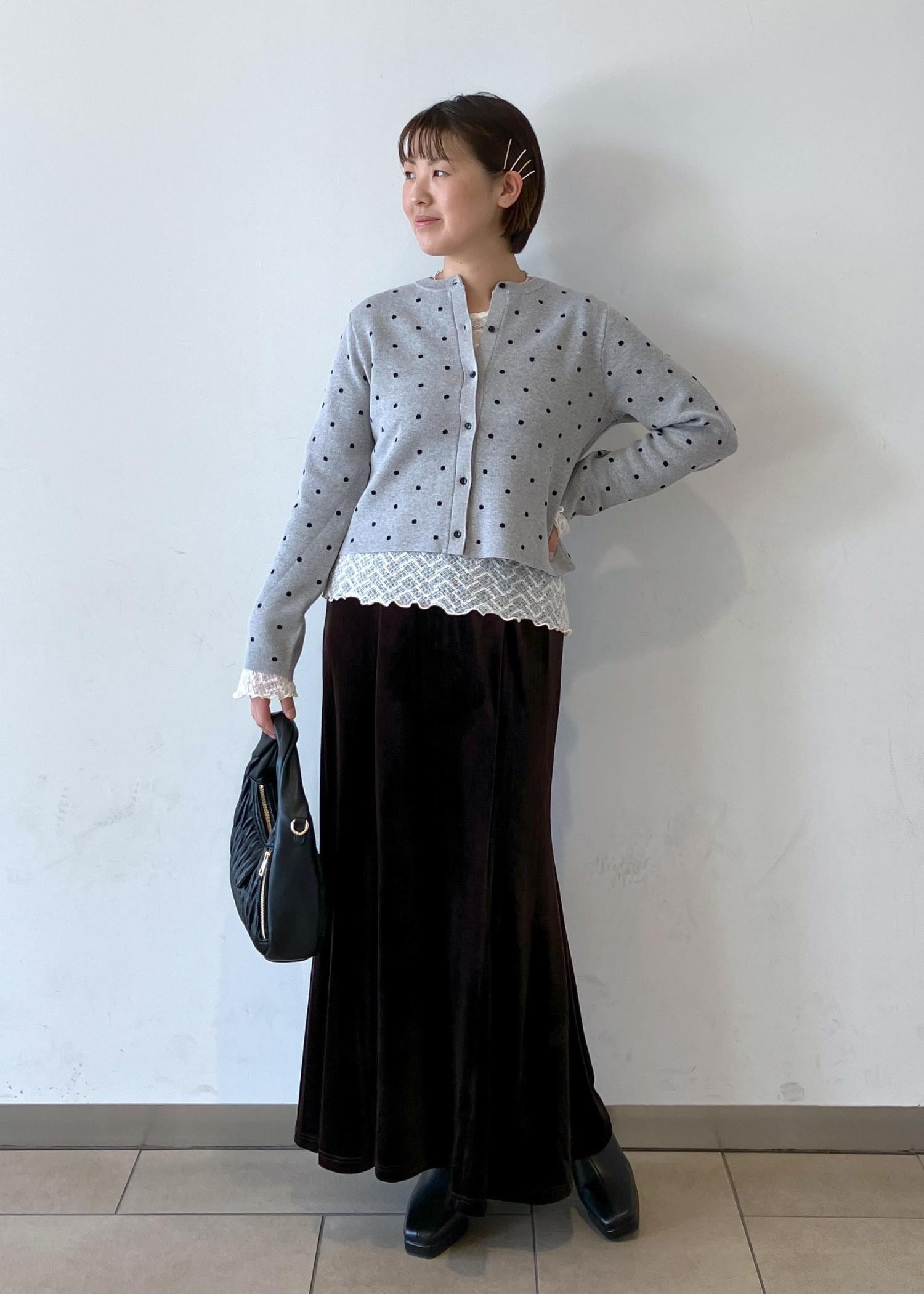スカートのベロア素材が秋の季節感を感じさせてくれます!取り入れるだけで秋の装いが完成!カーディガンにレースのインナーを重ねて裾からレースをチラ見せ!コーディネートのアクセントにおすすめです!