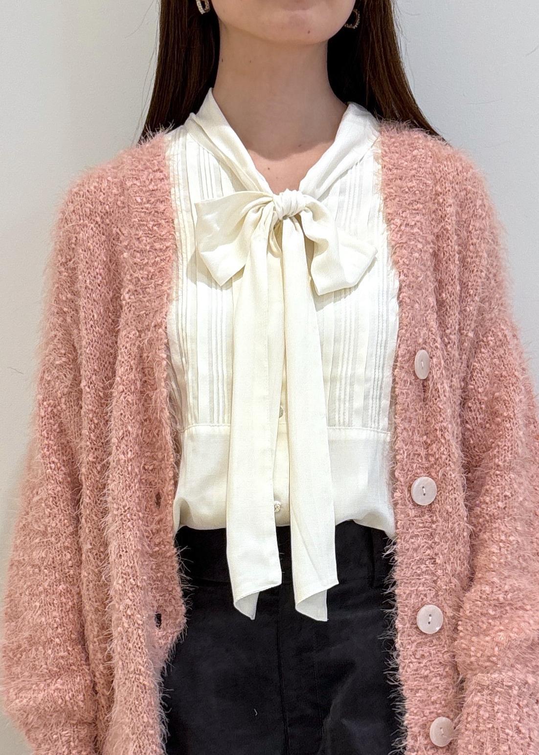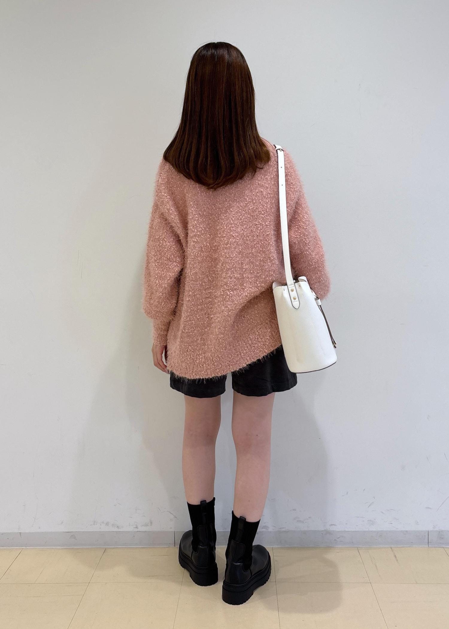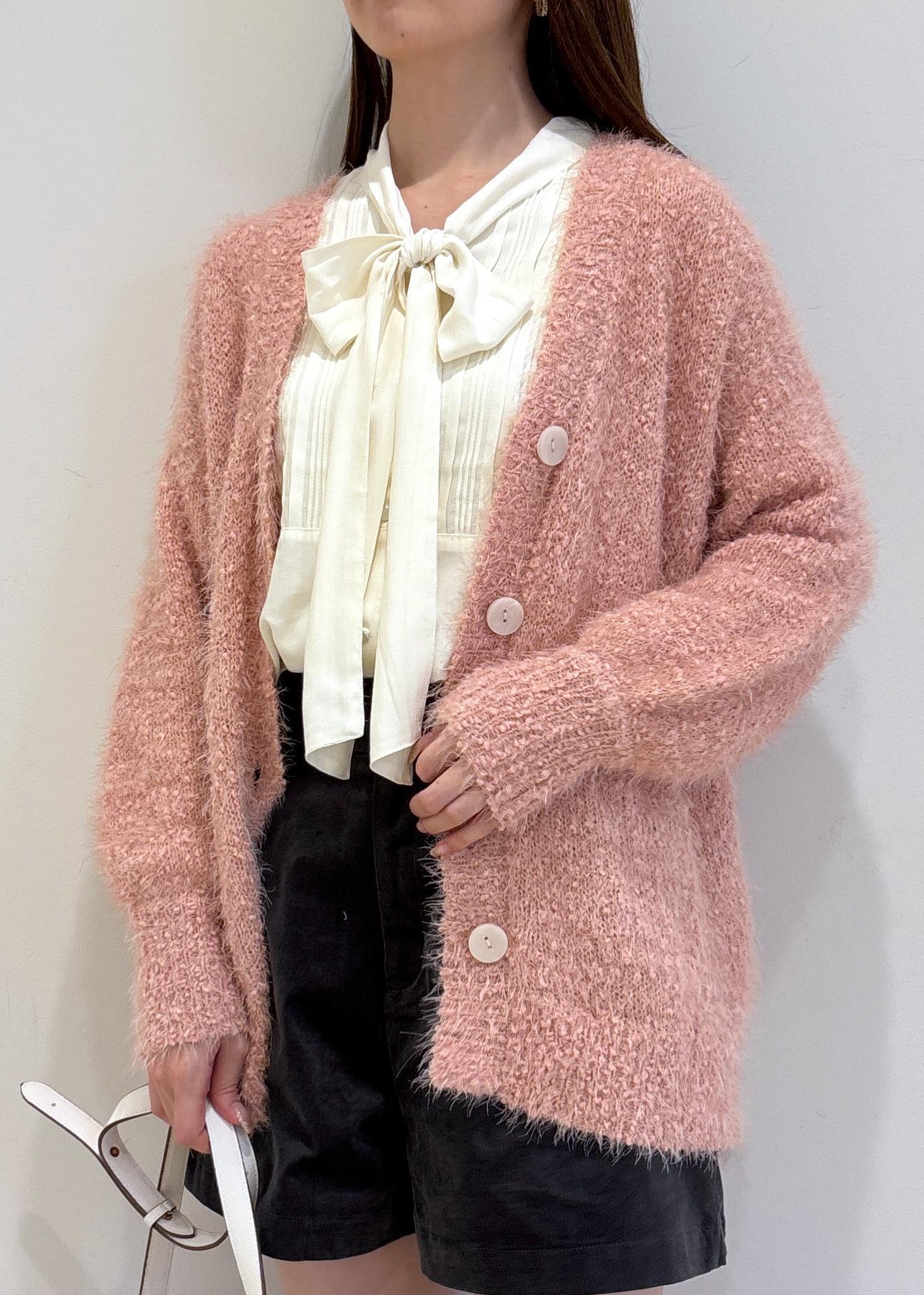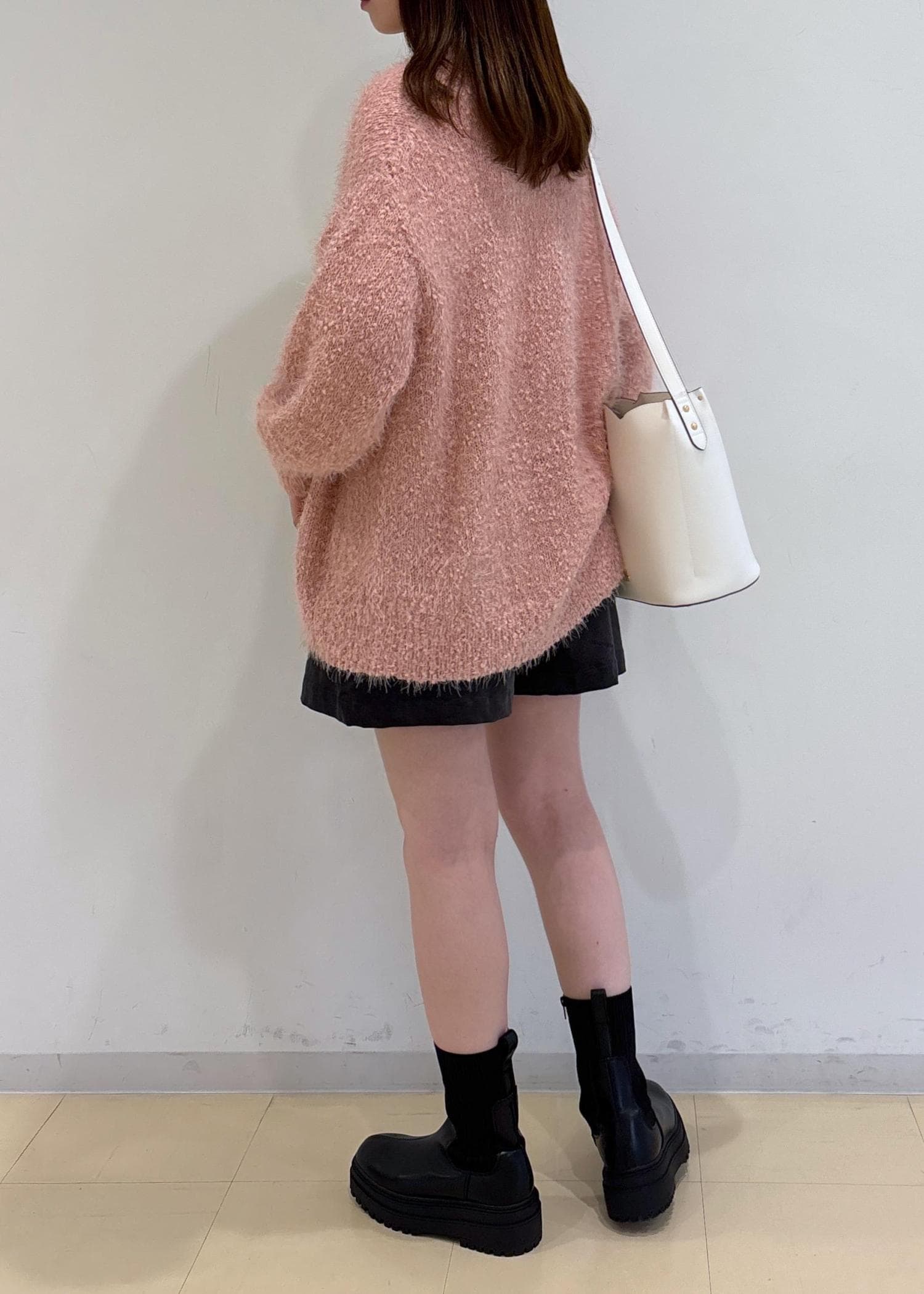 ゆるっとしたサイズ感のカーディガンが可愛い!ピンクカラーが目を惹きます。