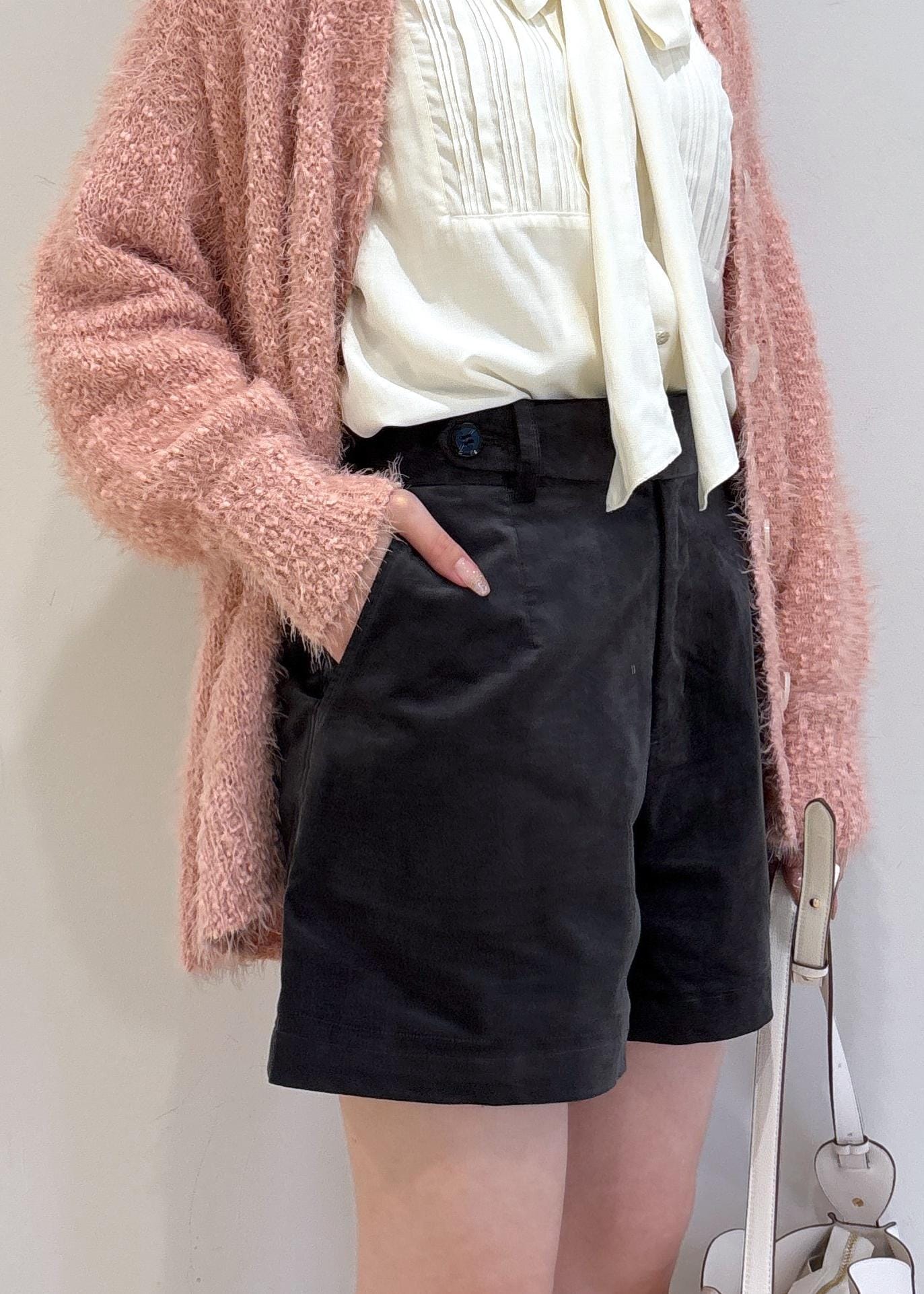 ショートパンツの色をチャコールにしたり、カジュアルめな厚底ブーツと合わせることで甘さが抑えられます◎
