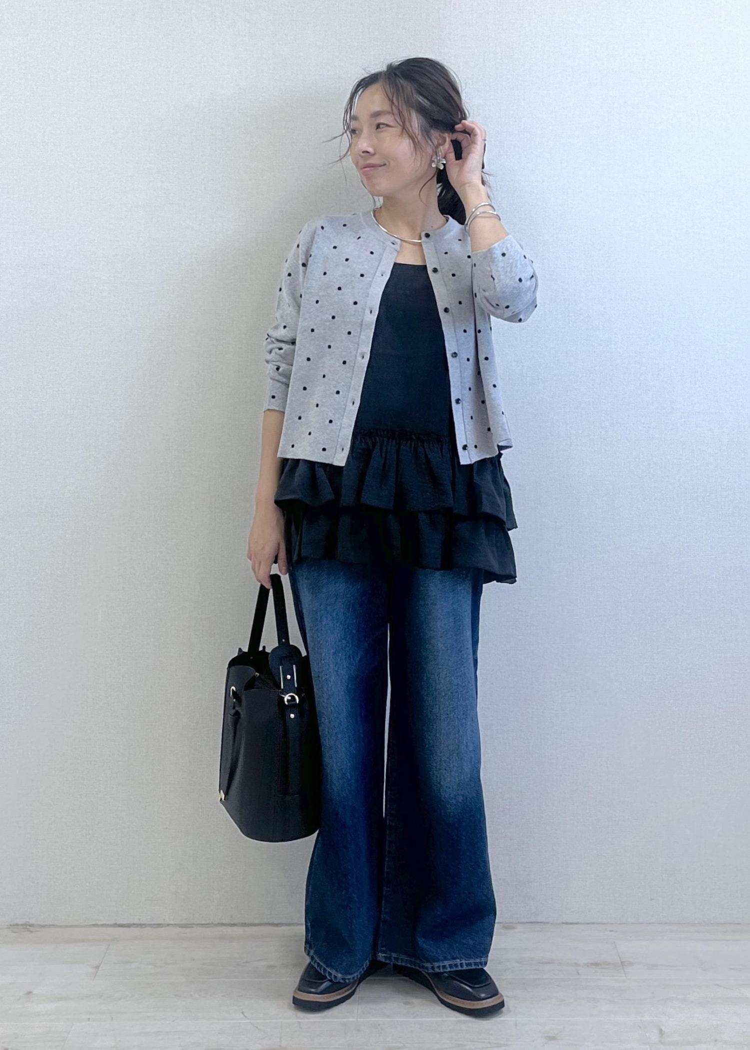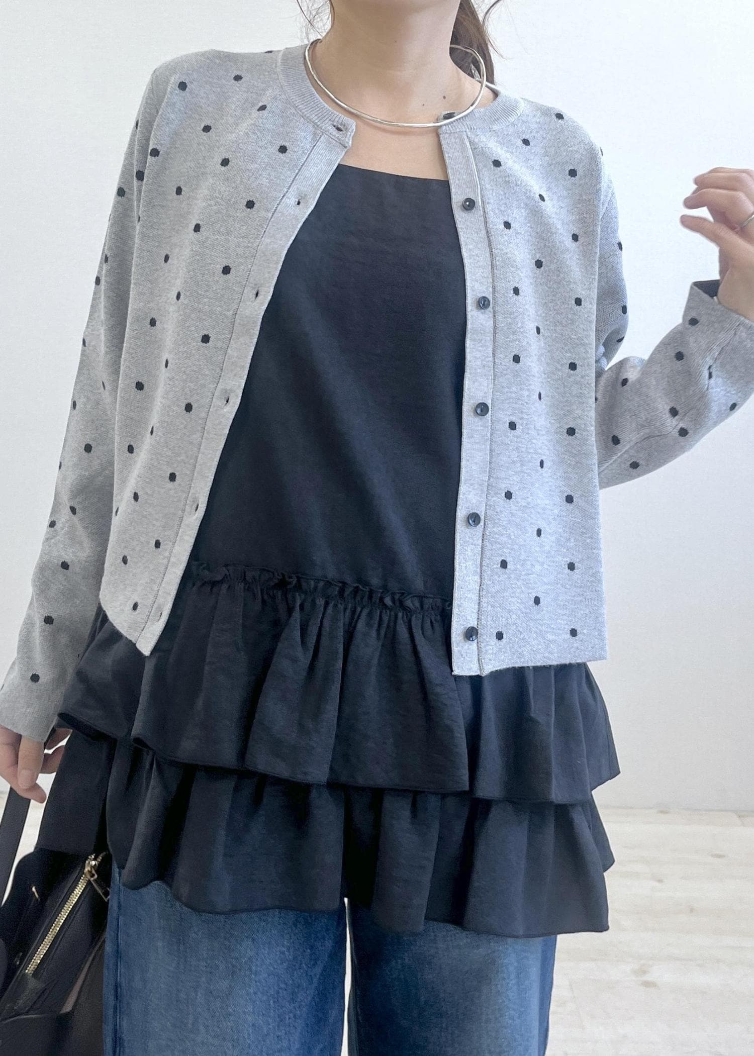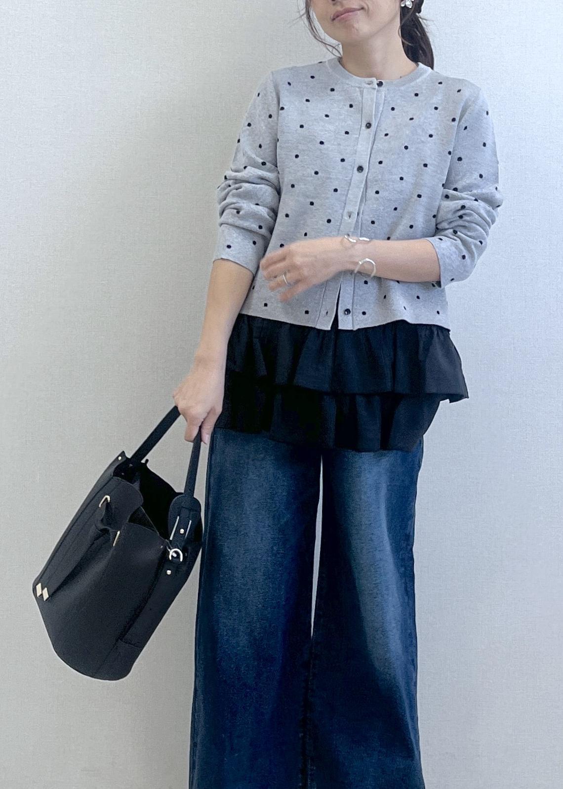 ドット柄でもモノトーンでまとめると大人っぽく着られるカーディガン。