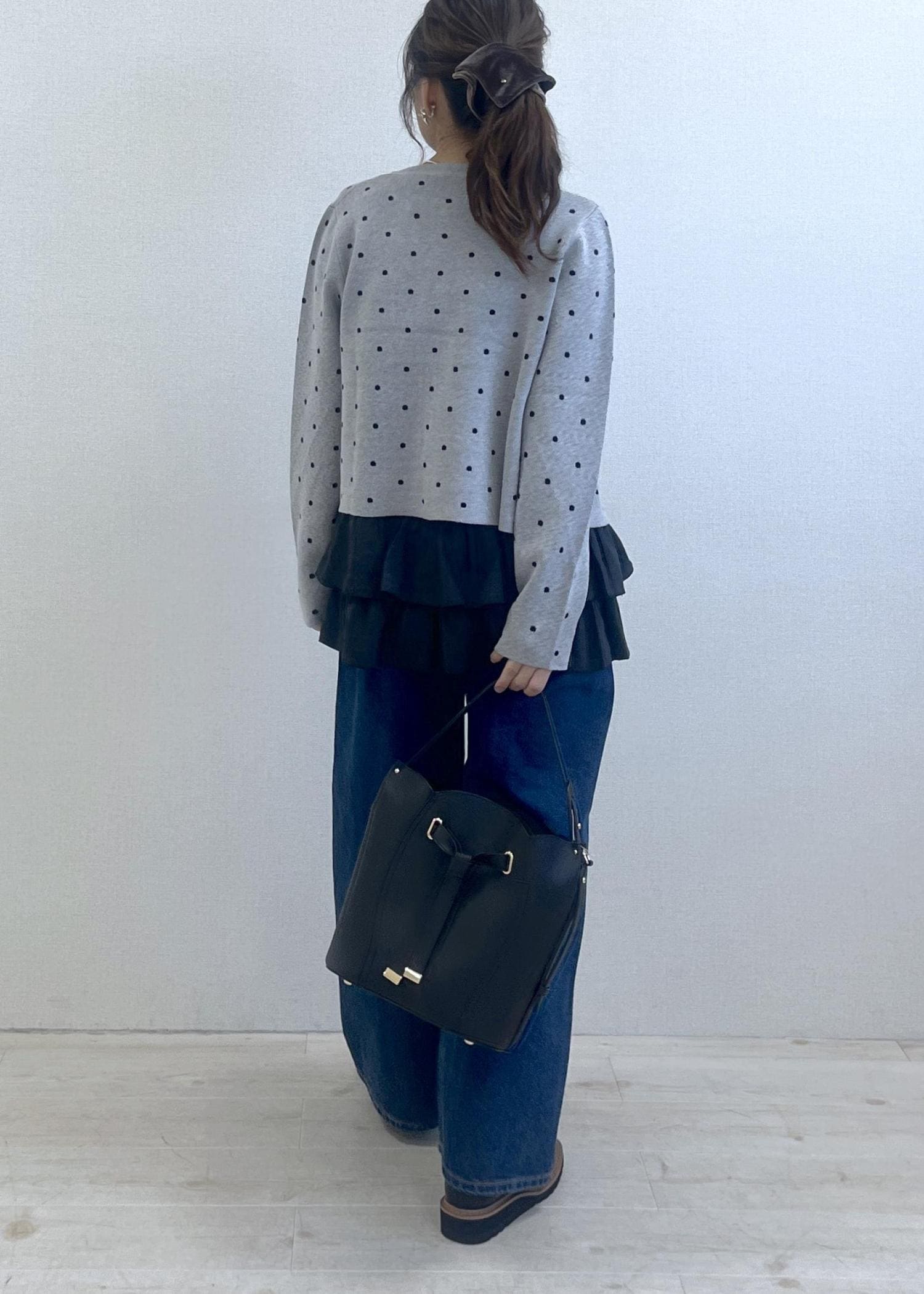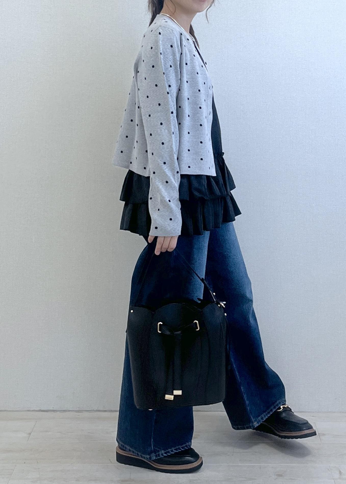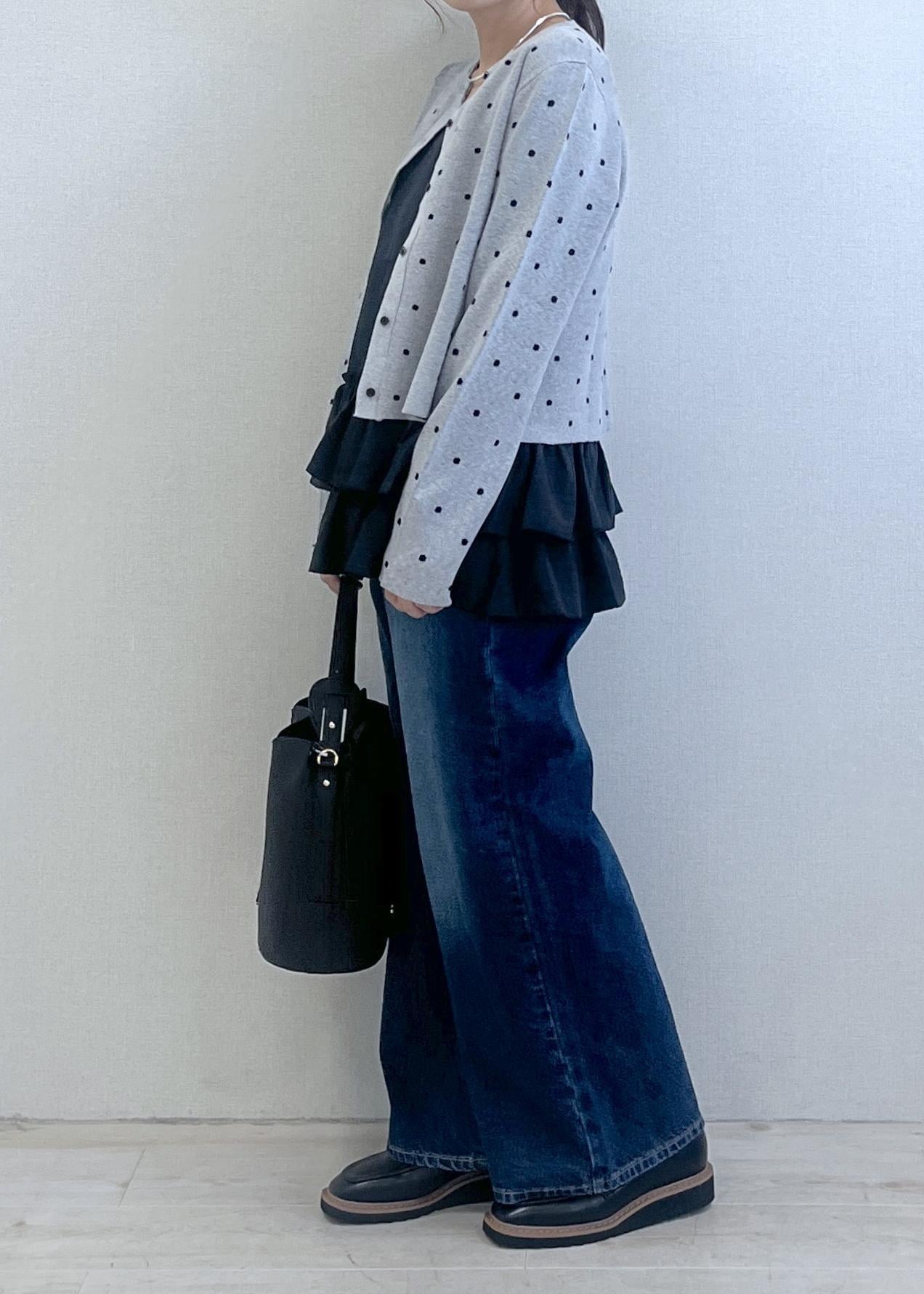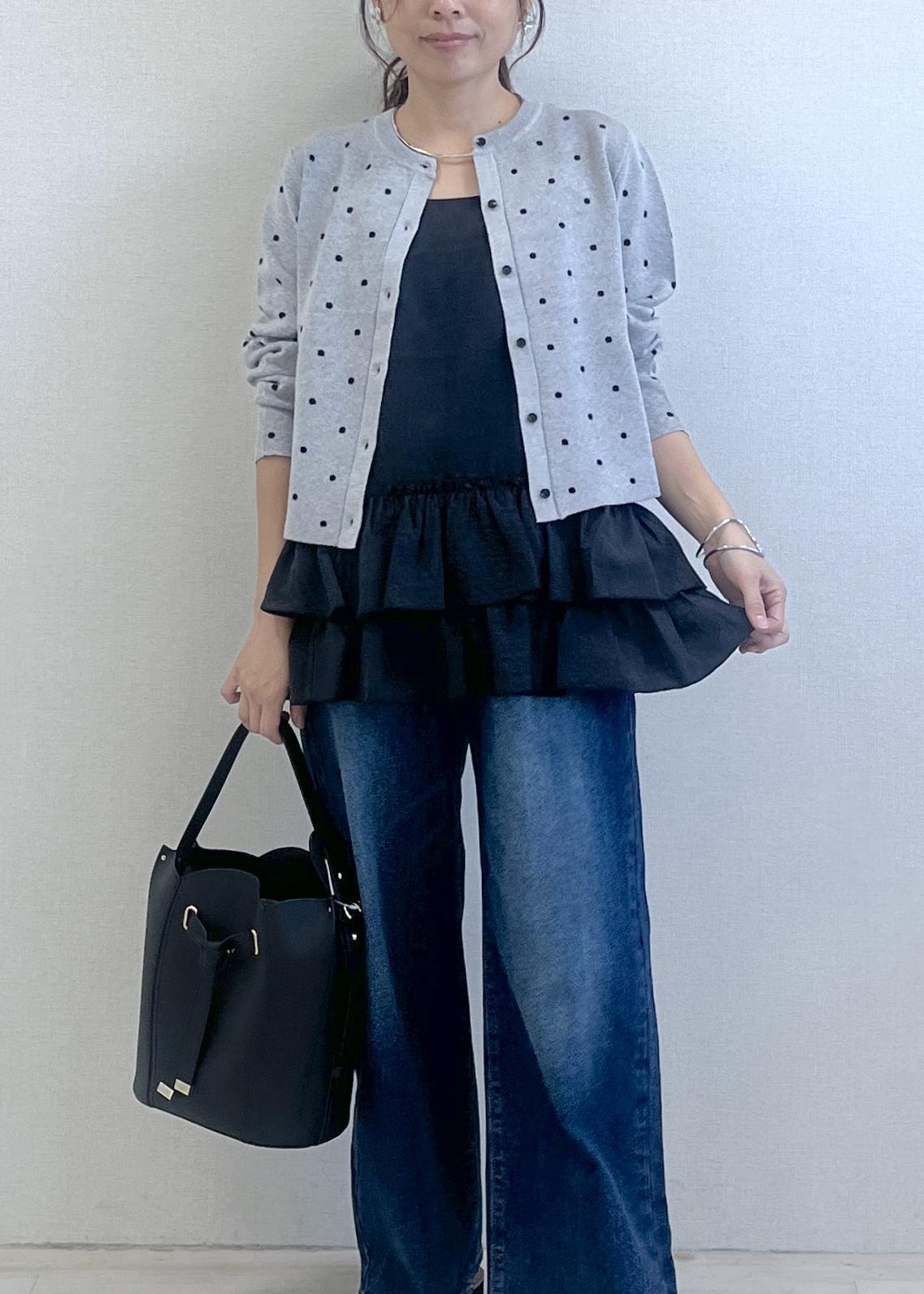 ドット柄でもモノトーンでまとめると大人っぽく着られるカーディガン。