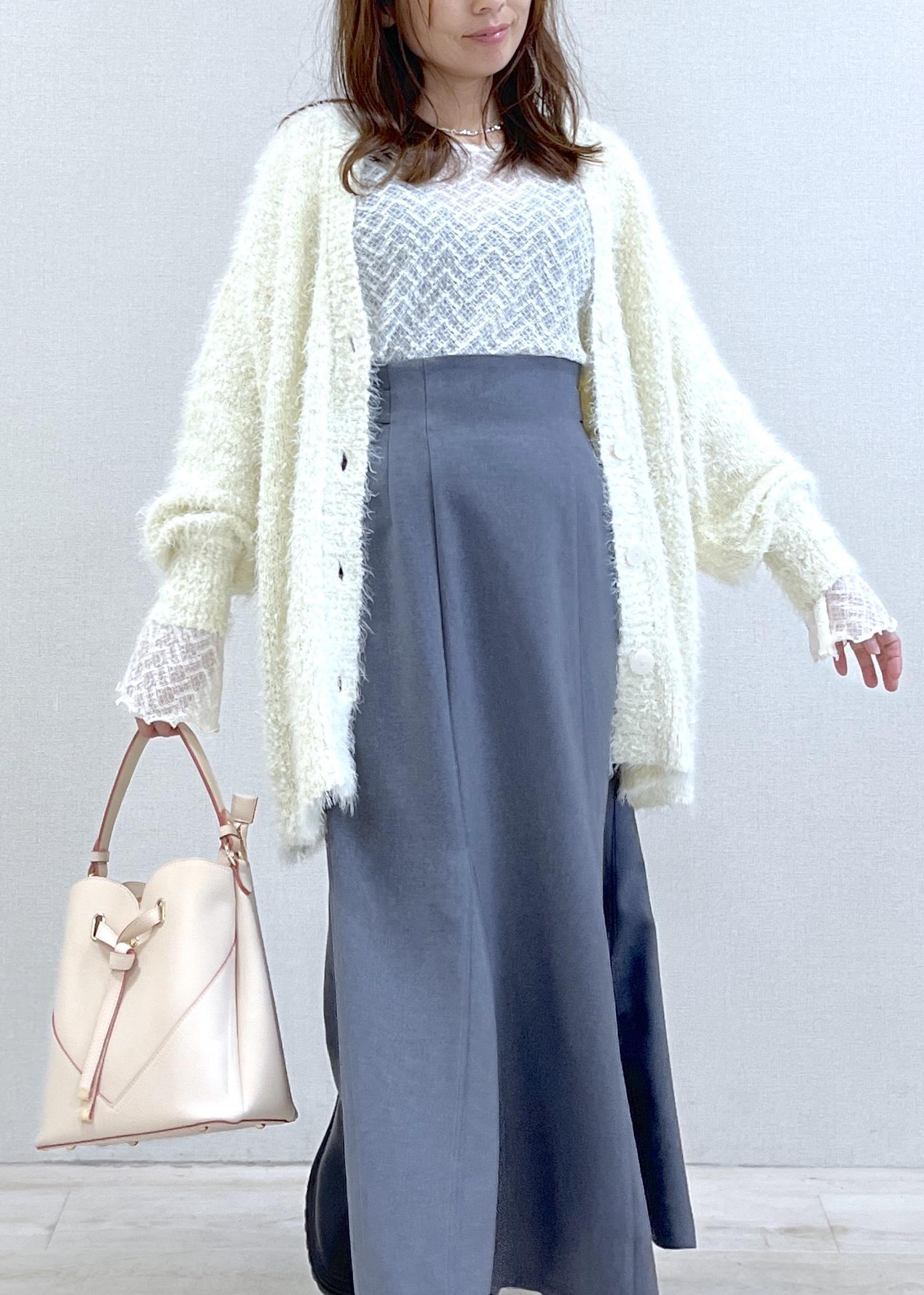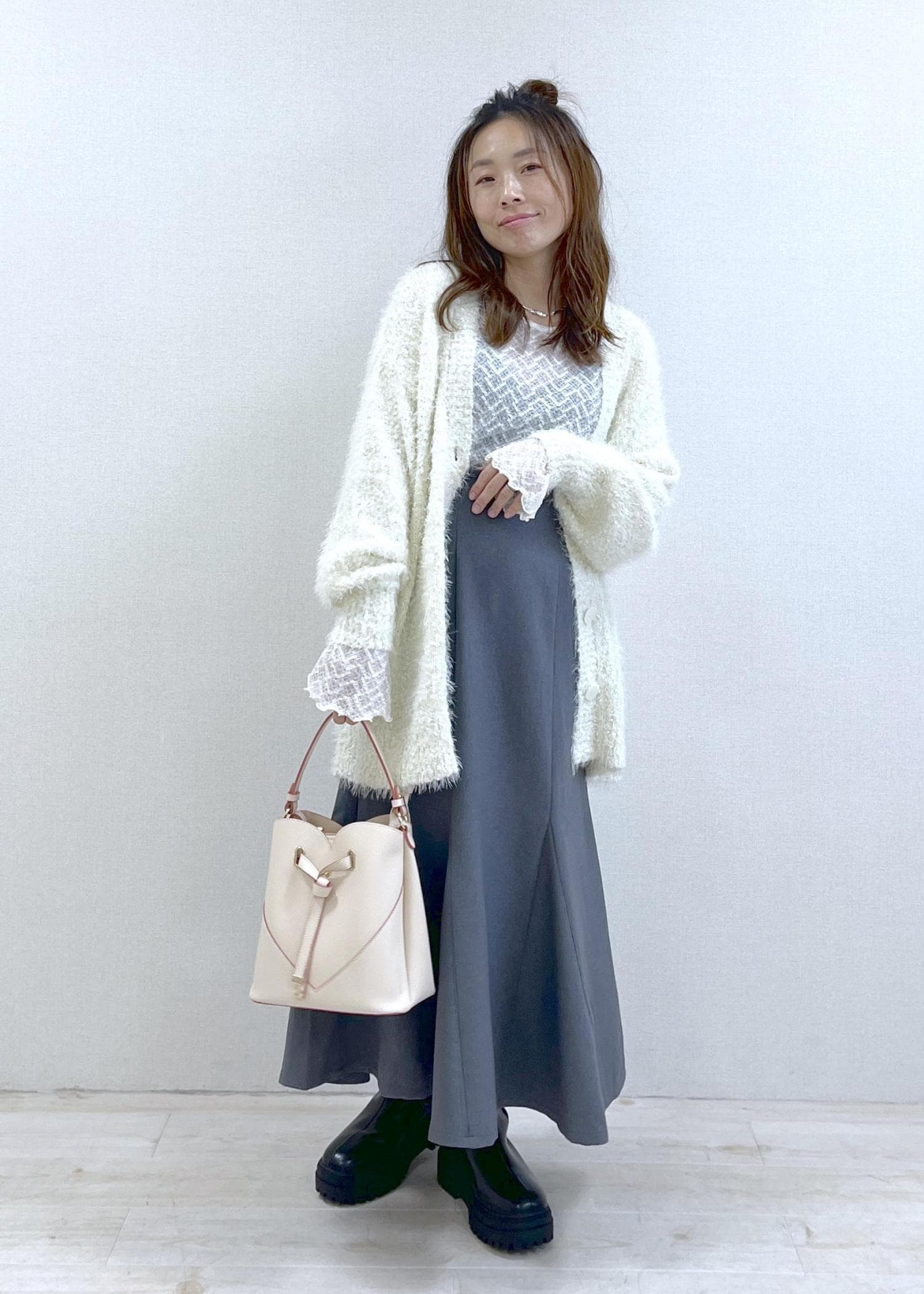 ふんわり素材のカーディガンにレーストップスを合わせて、やさしいムードに。