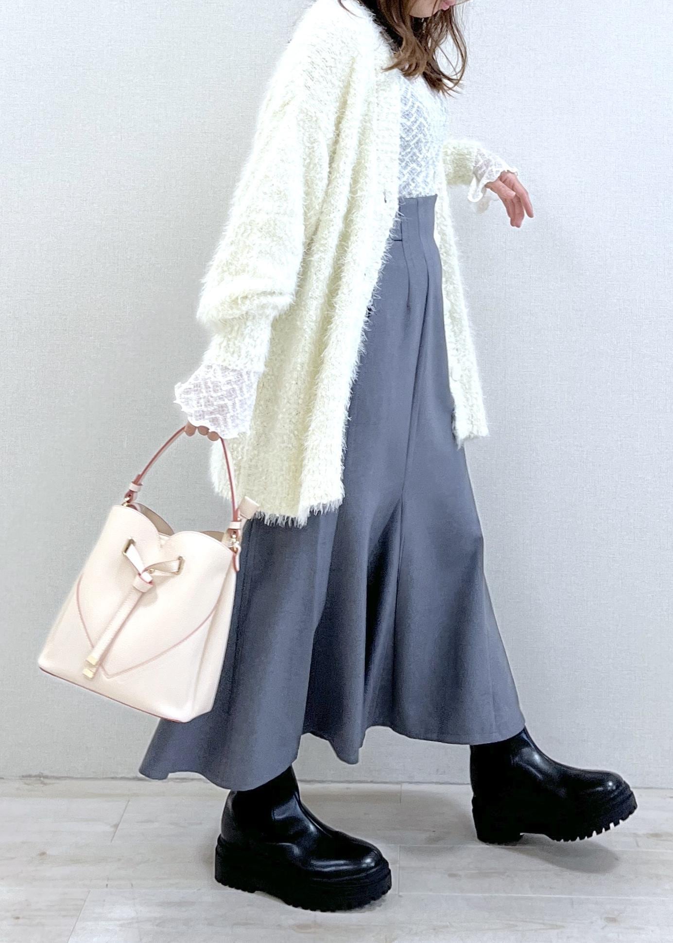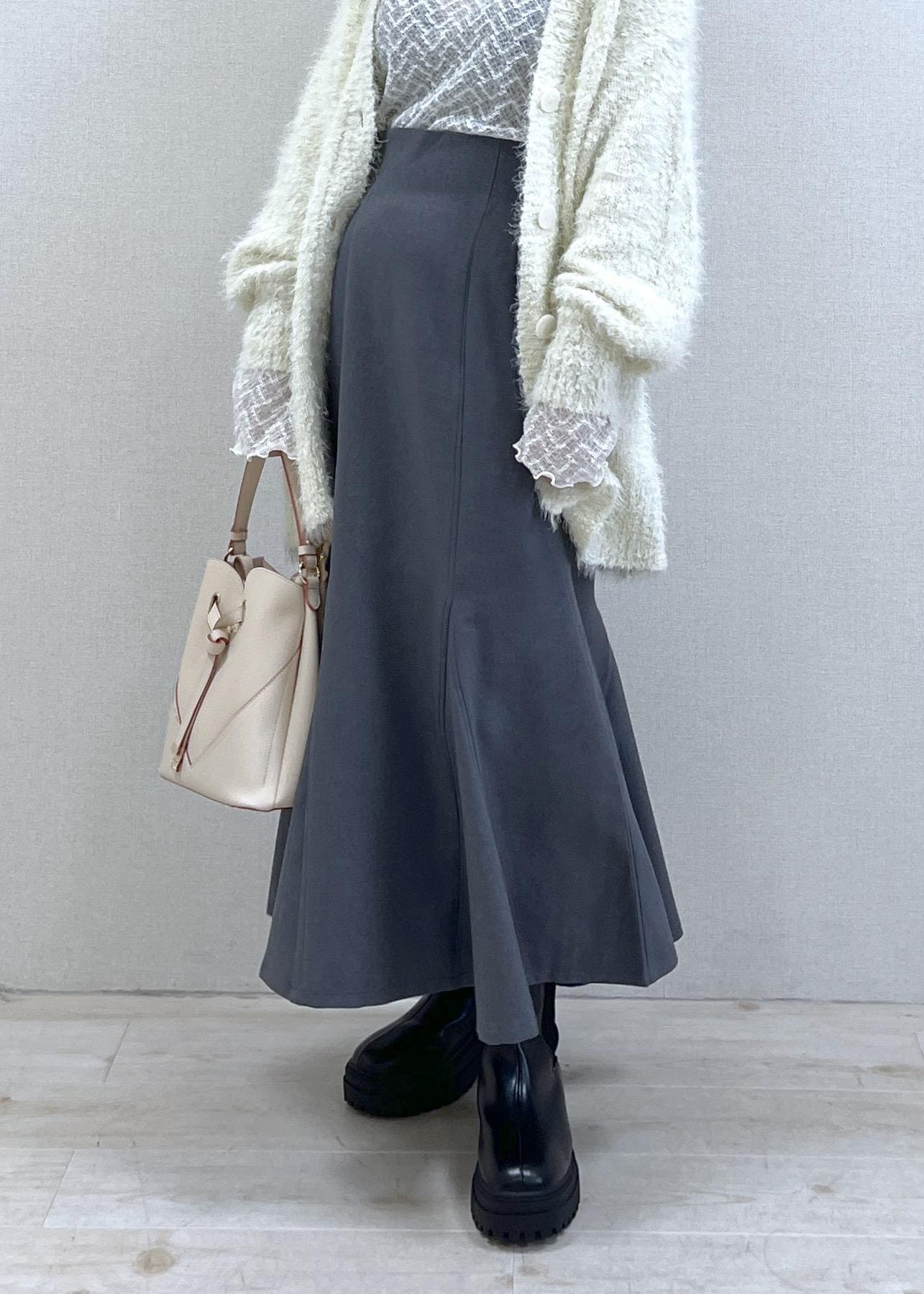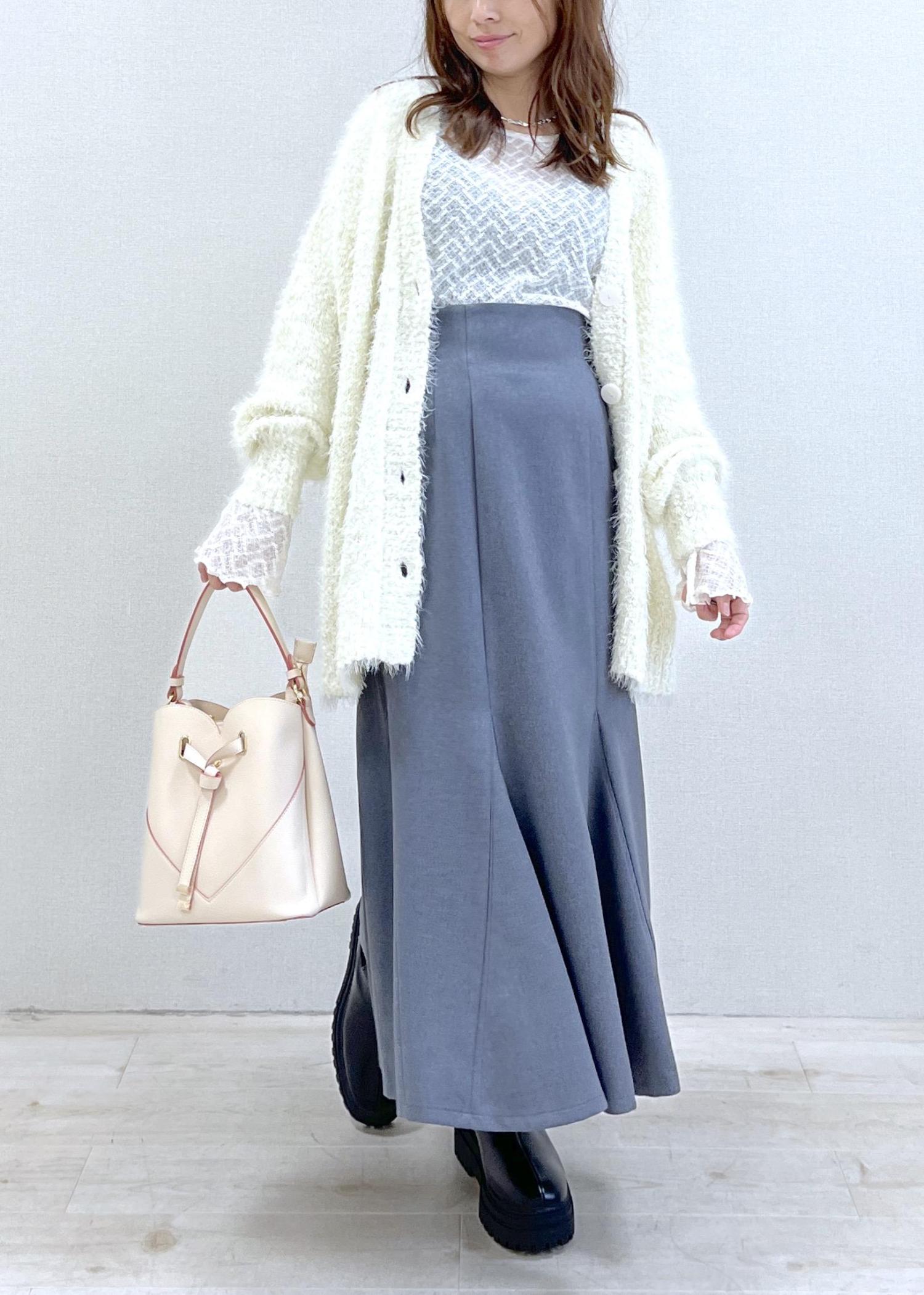 グレーのマーメイドスカートで甘さをほどよく引き締めました。