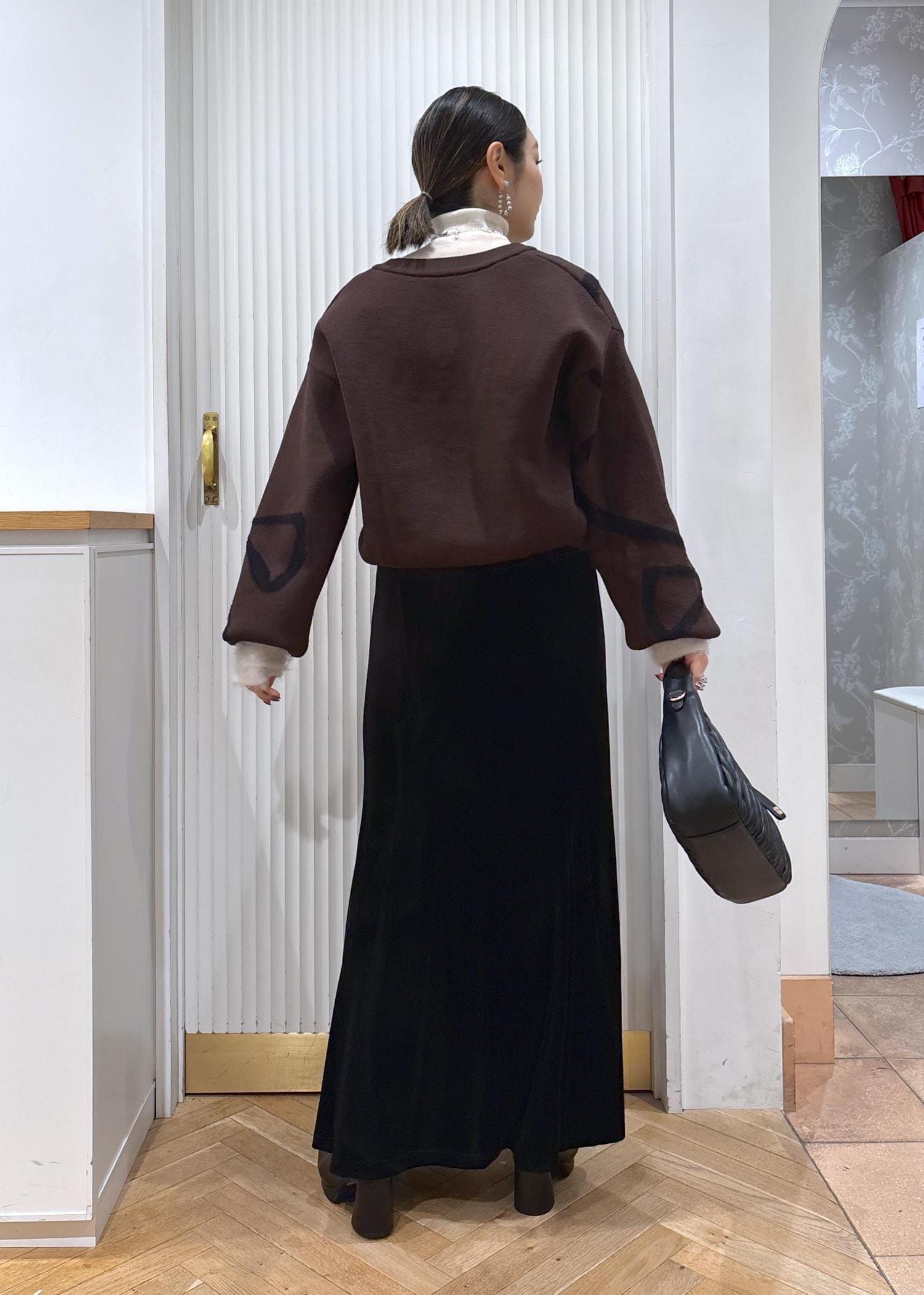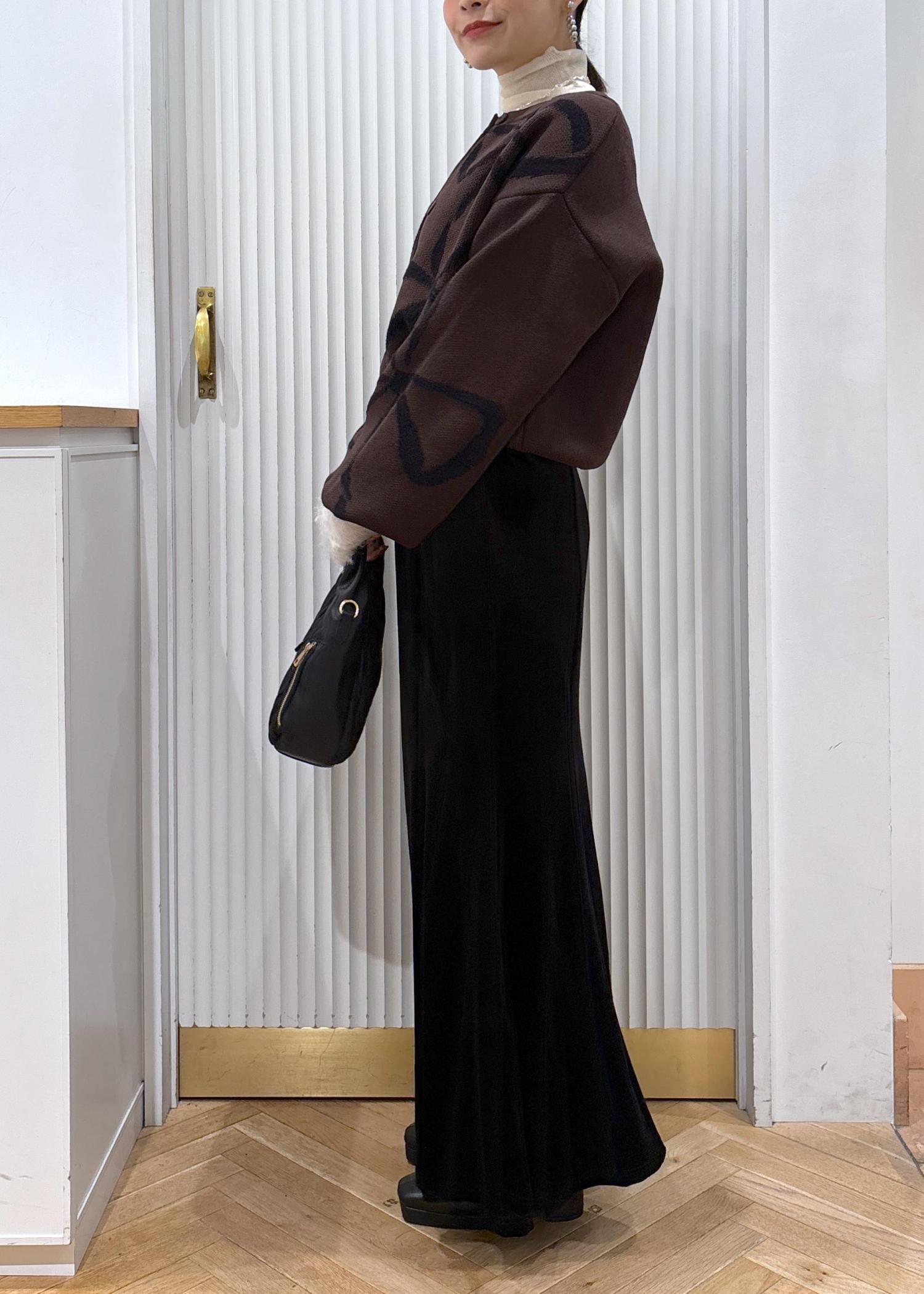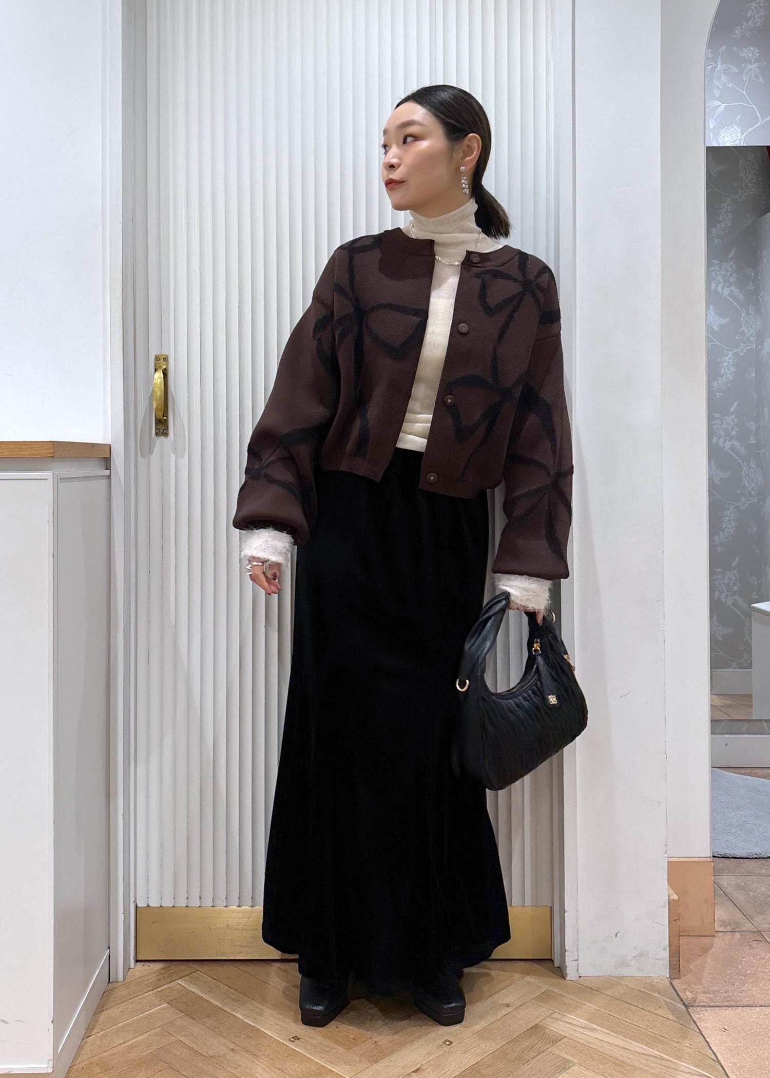 キャッチーなデザイン性のあるカーディガンとベロアスカートの大人可愛いコーディネート♡