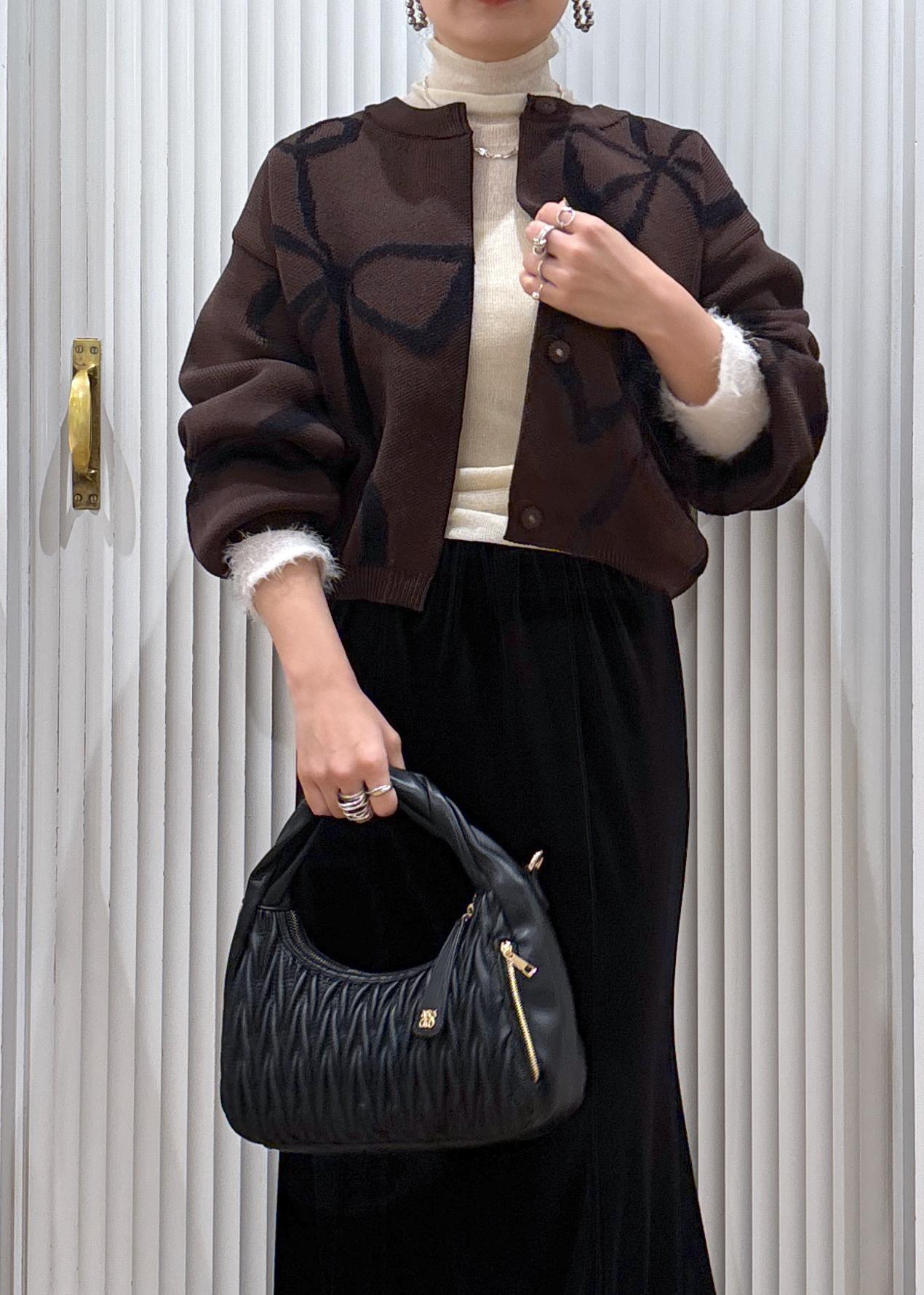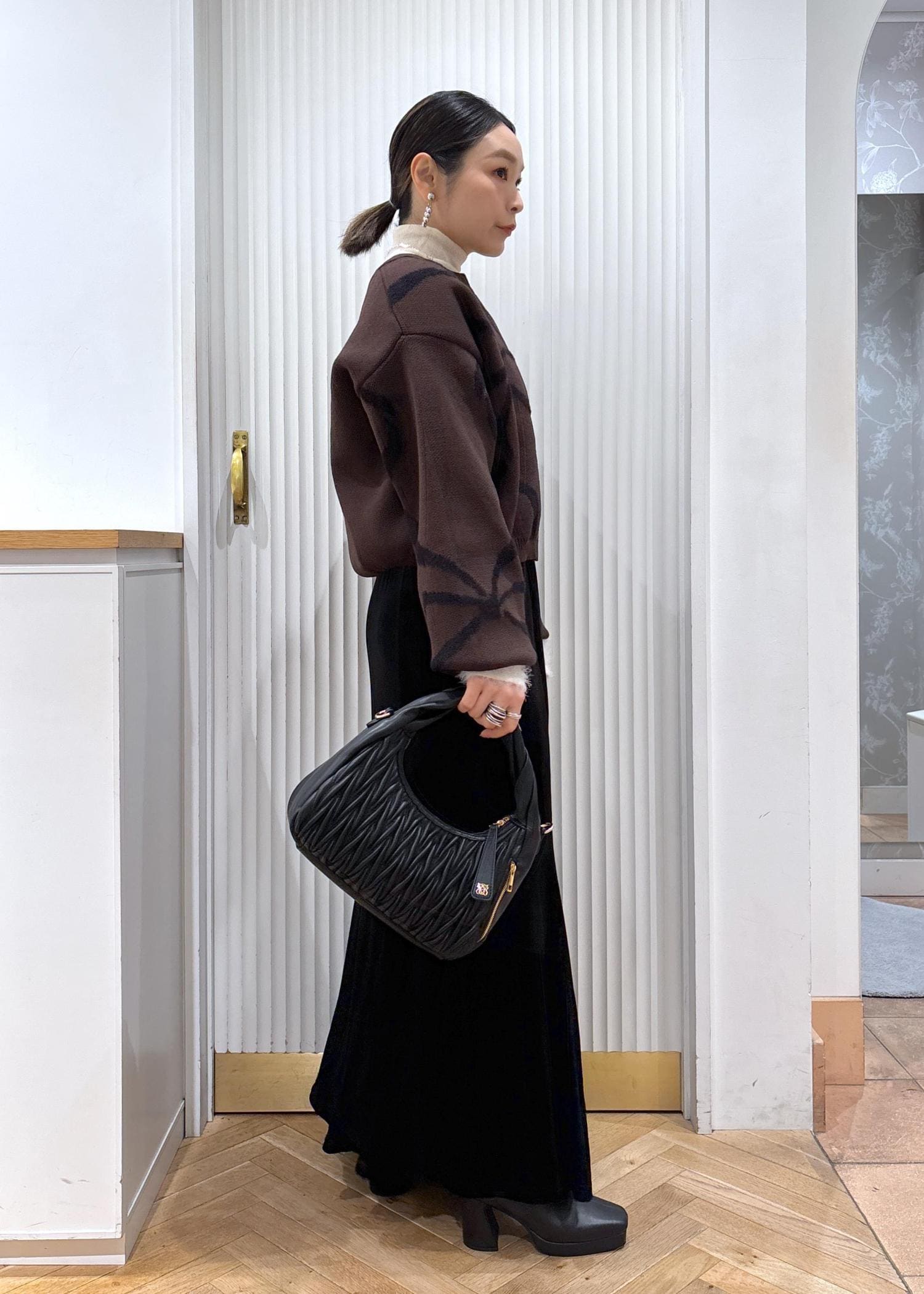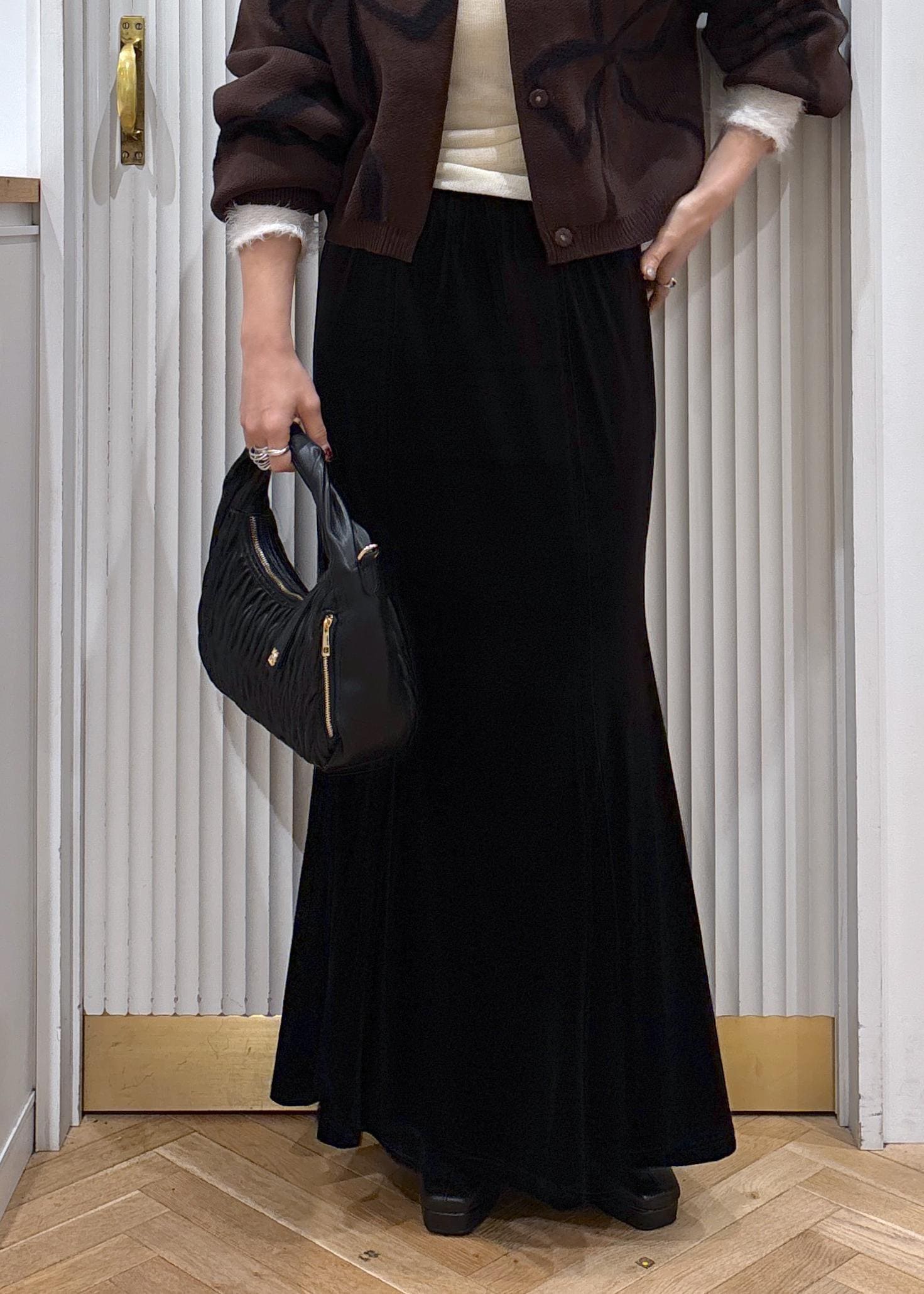 キャッチーなデザイン性のあるカーディガンとベロアスカートの大人可愛いコーディネート♡