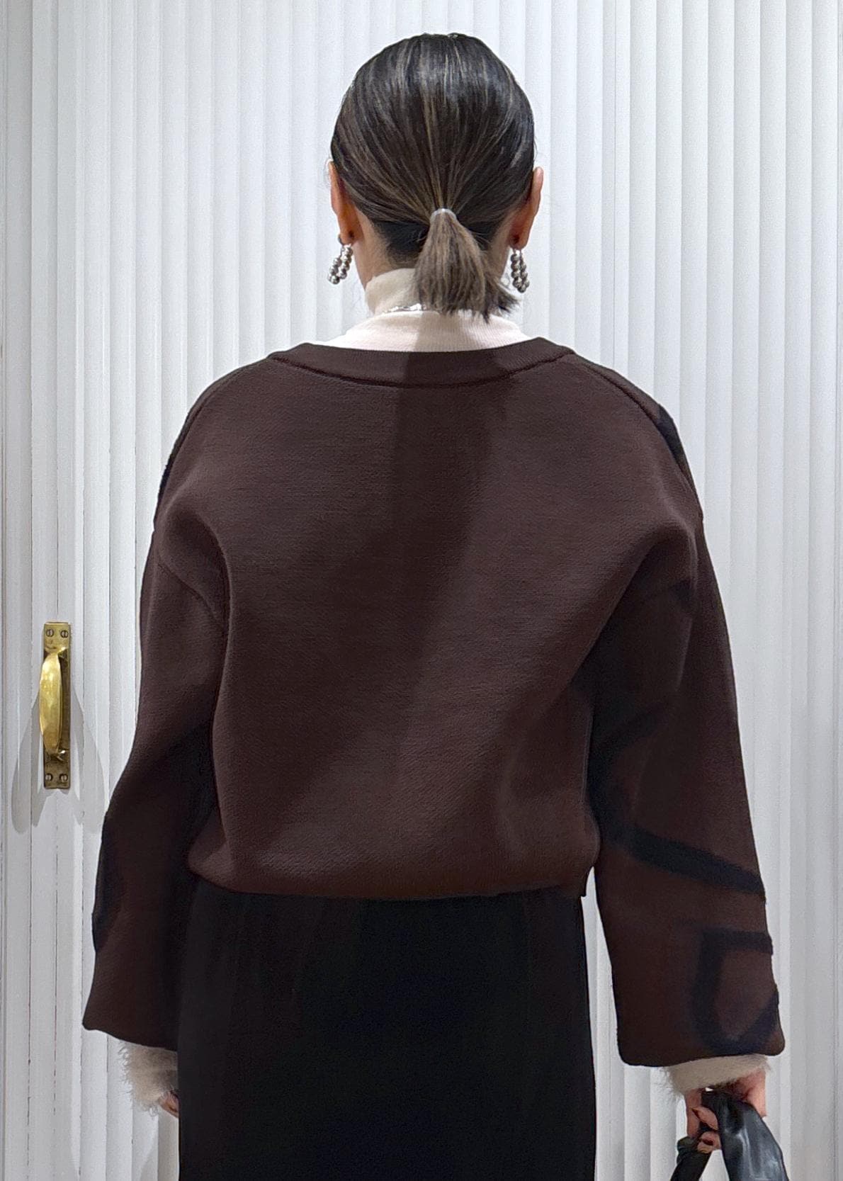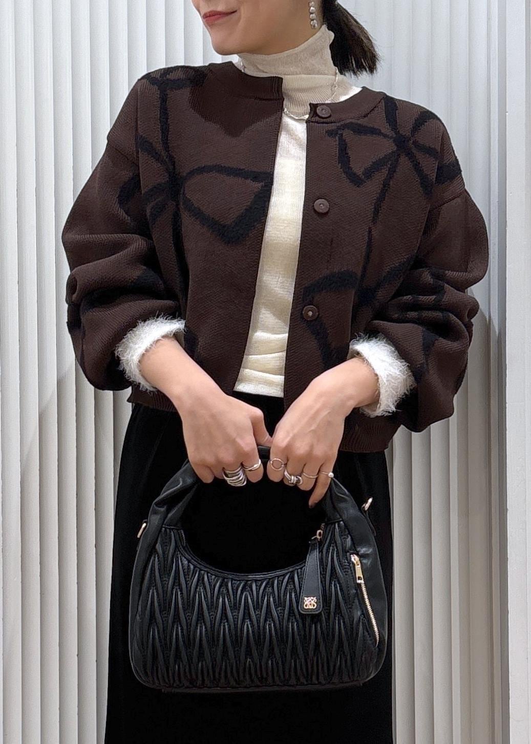 VISリボンモチーフジャガードカーディガン/イージーケアダークブラウン / F¥6,919レビュー着丈はスッキリとスカートにも合わせやすい長さです。157cmで腰下辺りでした。柔らかくもっちりとしたニット素材でアームや身幅にもたっぷりとした余裕のあるサイズ感。デザイン性があり、着映えするのでシンプルなボトムとの相性◎