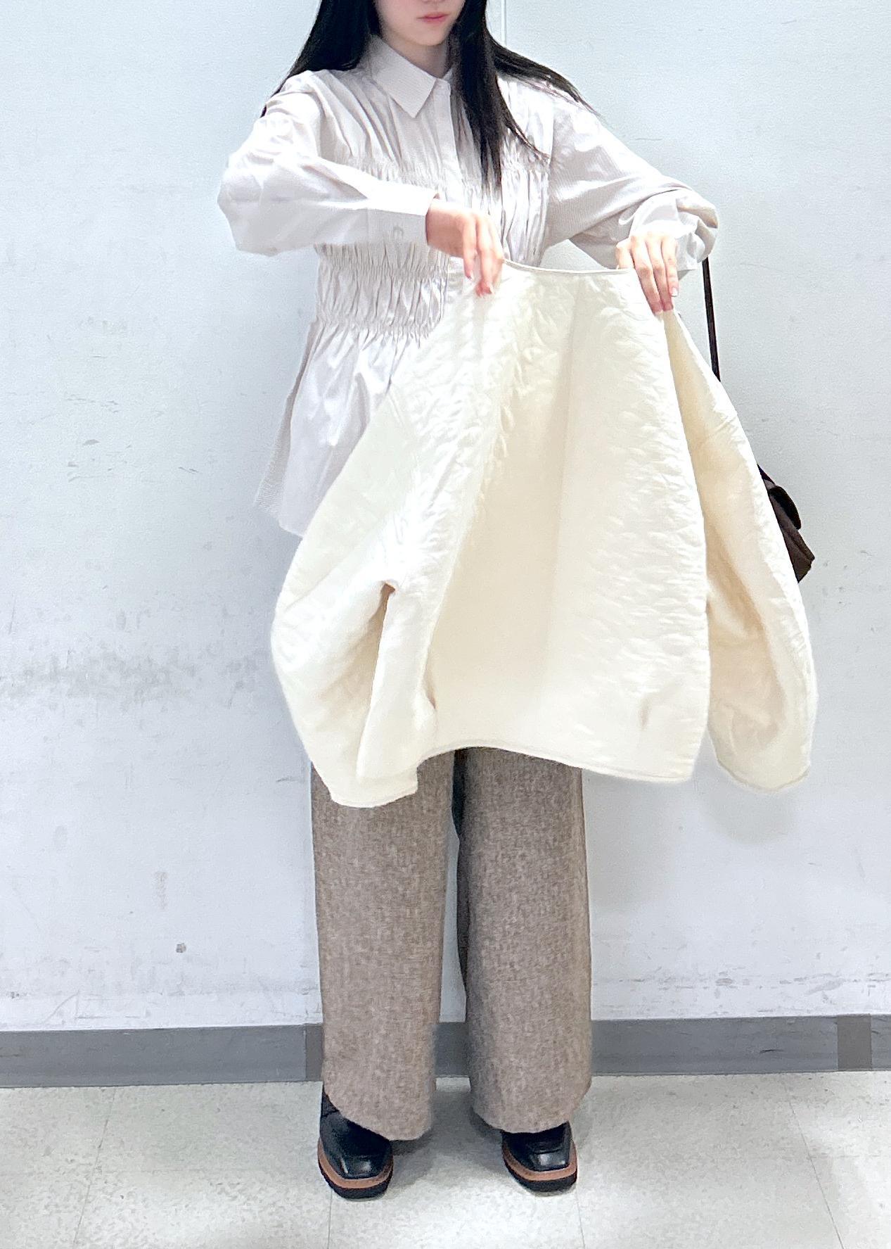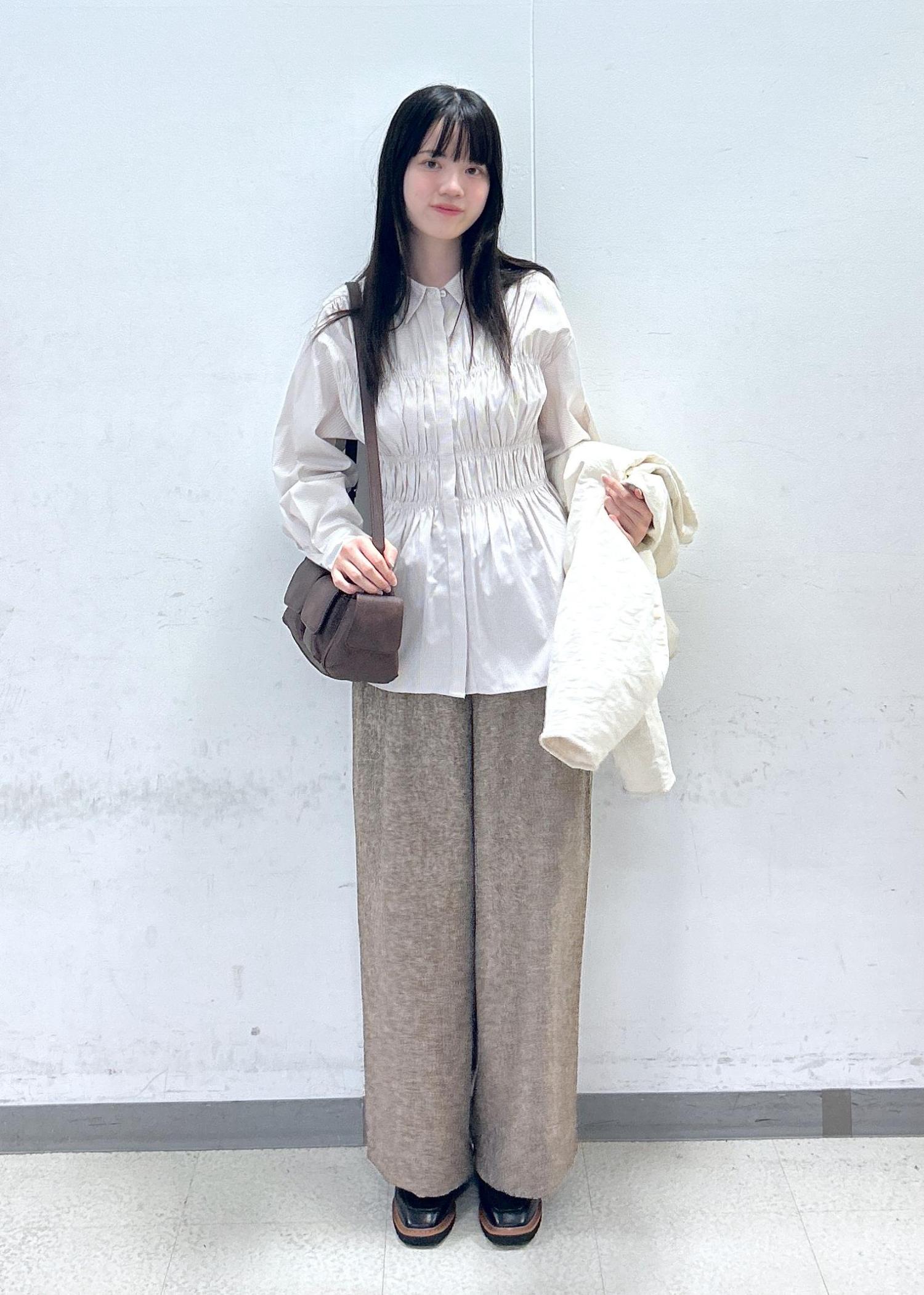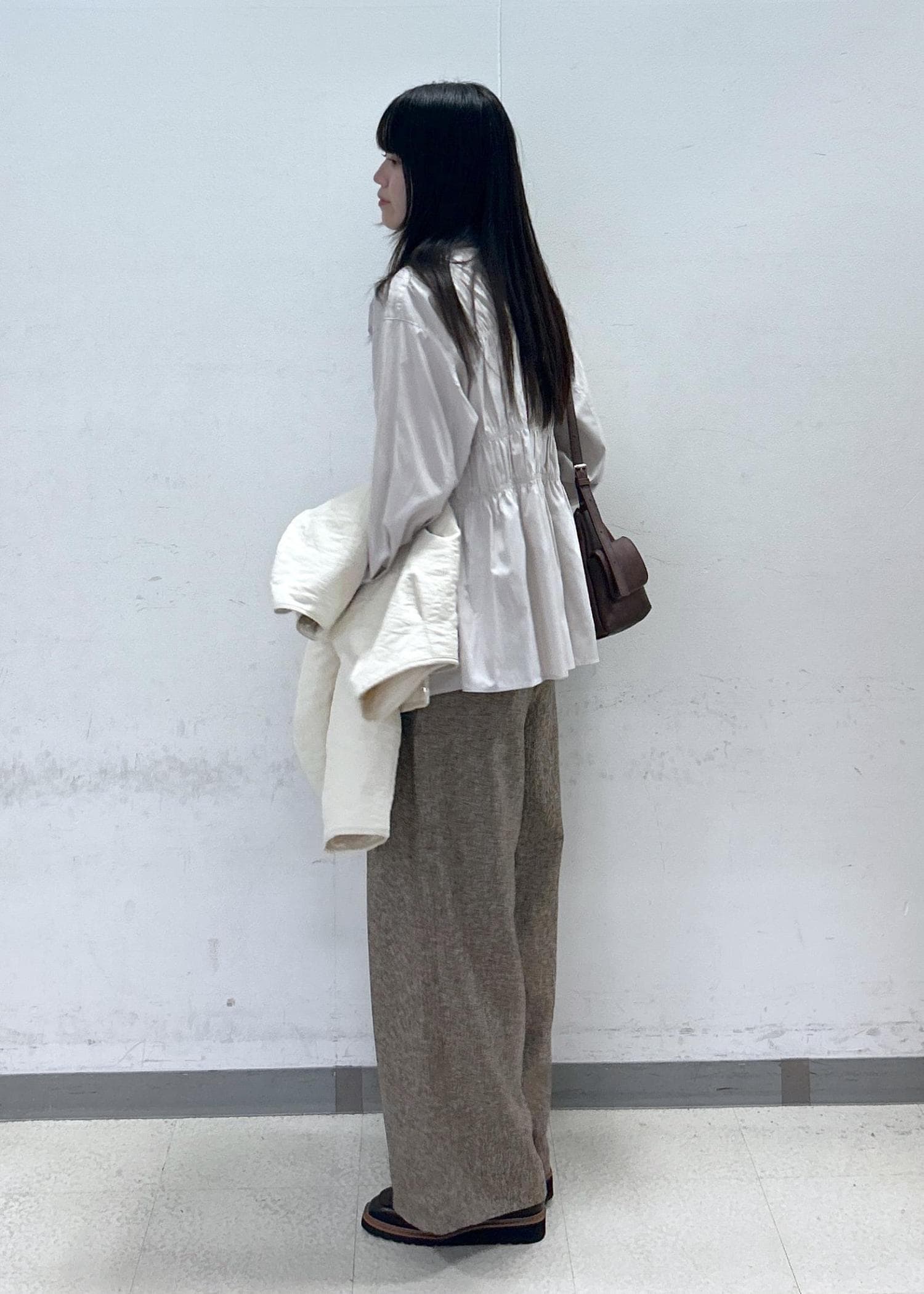 シャーリングがウエストの高い位置にあるのでスタイルアップ効果があり、ボタンが見えない仕様になっているのでごちゃつかず、程よくスッキリ見せてくれます。パンツとの相性◎ -