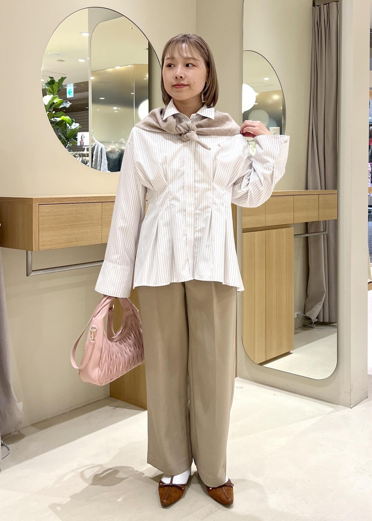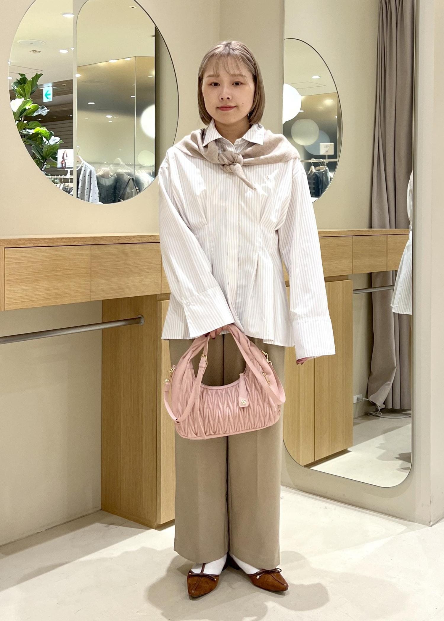 全体的にブラウンで統一して、差し色にくすみピンクのバッグを合わせました!