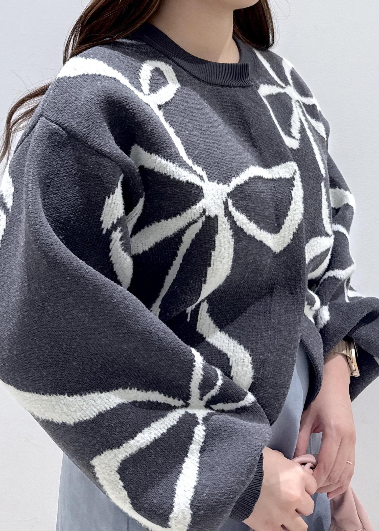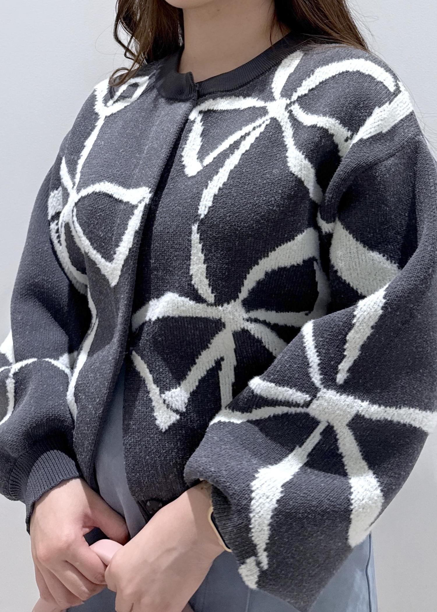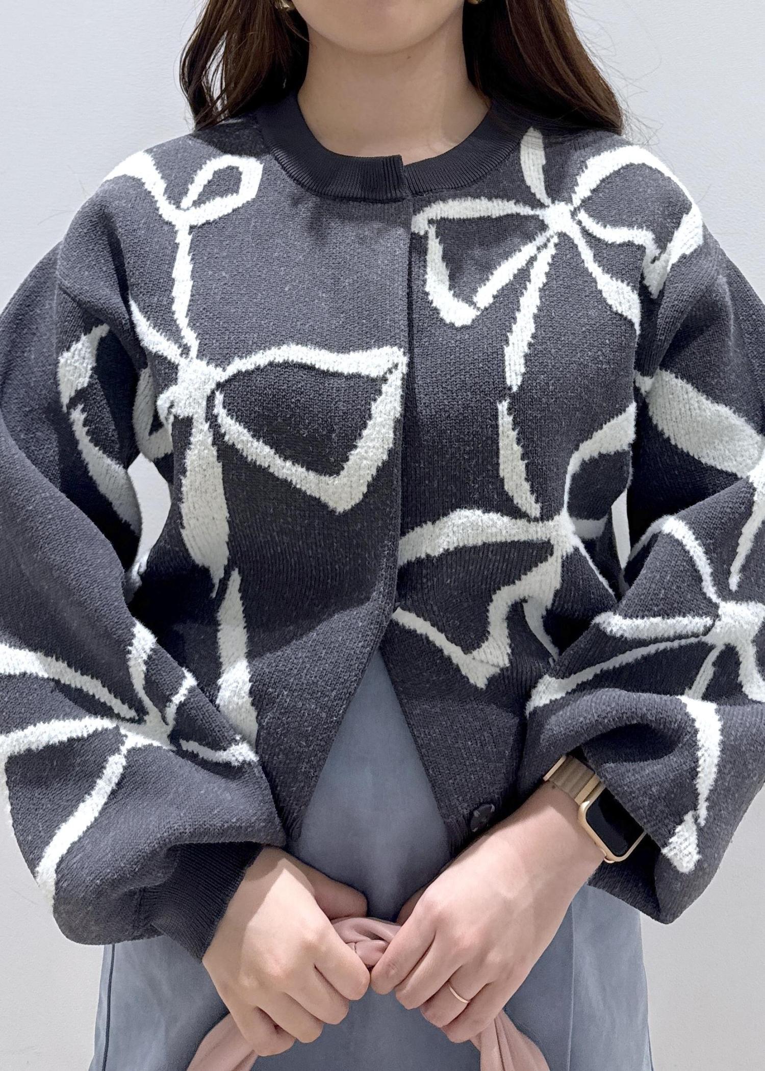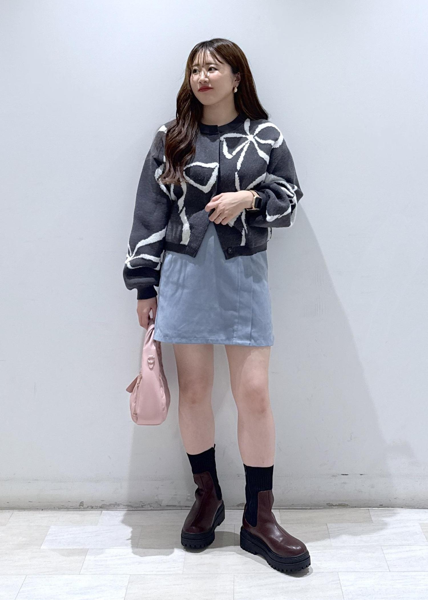 今回は新作で入荷しました大きなリボン柄のニットカーディガンに、サックスブルーのミニスカートと合わせて甘めなスタイルにしてみました♪