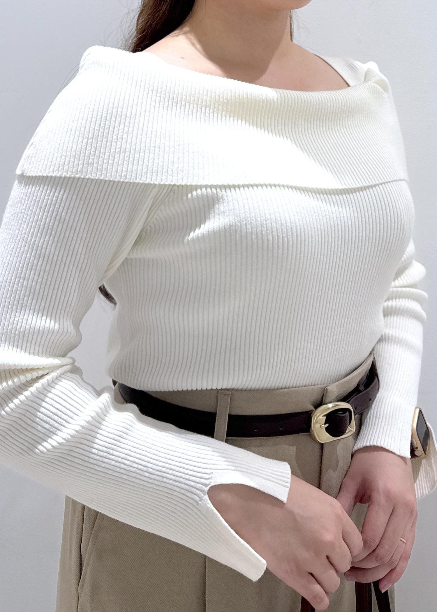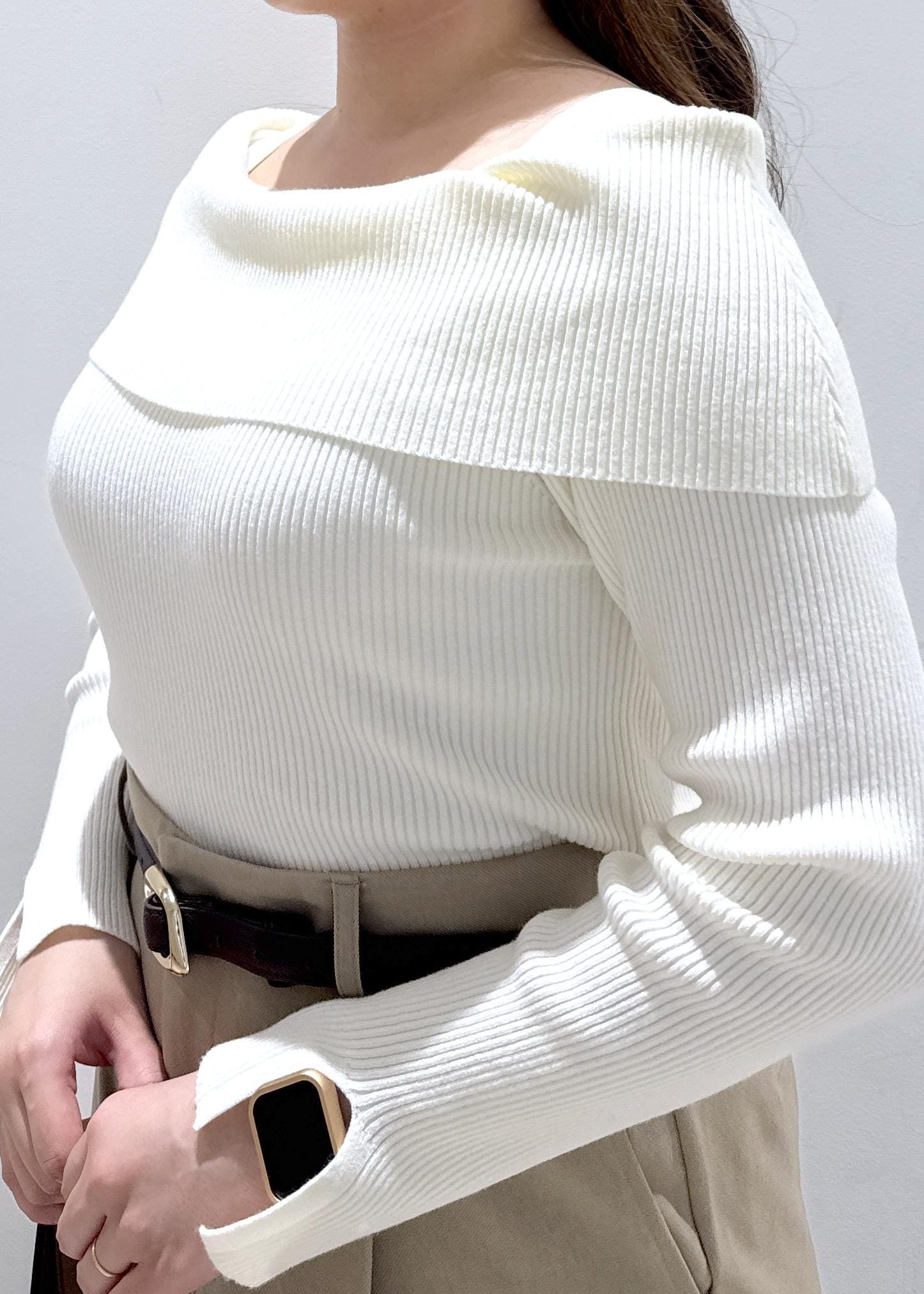 人気なオフショル風ニットトップスは私もお気に入りで、オフショルに見えるけど肩がズレ落ちることもなく、下着のラインの紐の部分も見えないのでオススメです。