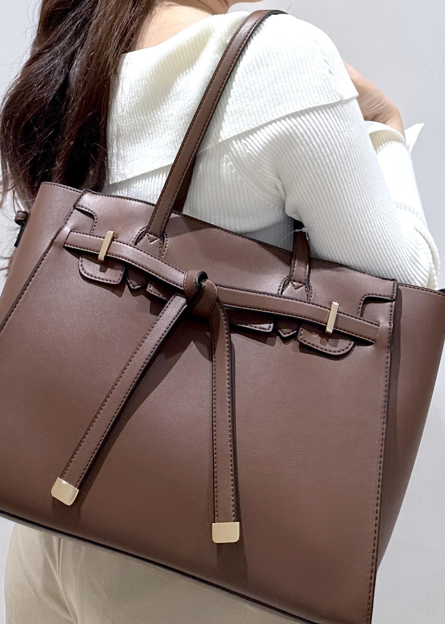 VIS【新色追加】【A4収納】フラップタイトートバッグダークブラウン / F¥7,909レビューリボン付きのトートバッグ⭐︎見た目が可愛いのはもちろん、ファスナー付きのバッグで内側にポケットが付いており、物もたくさん入ります!大きさ的にお仕事用で使えるタイプなので、A4サイズのノートやファイル、13インチのノートパソコンやiPadが入ります。
