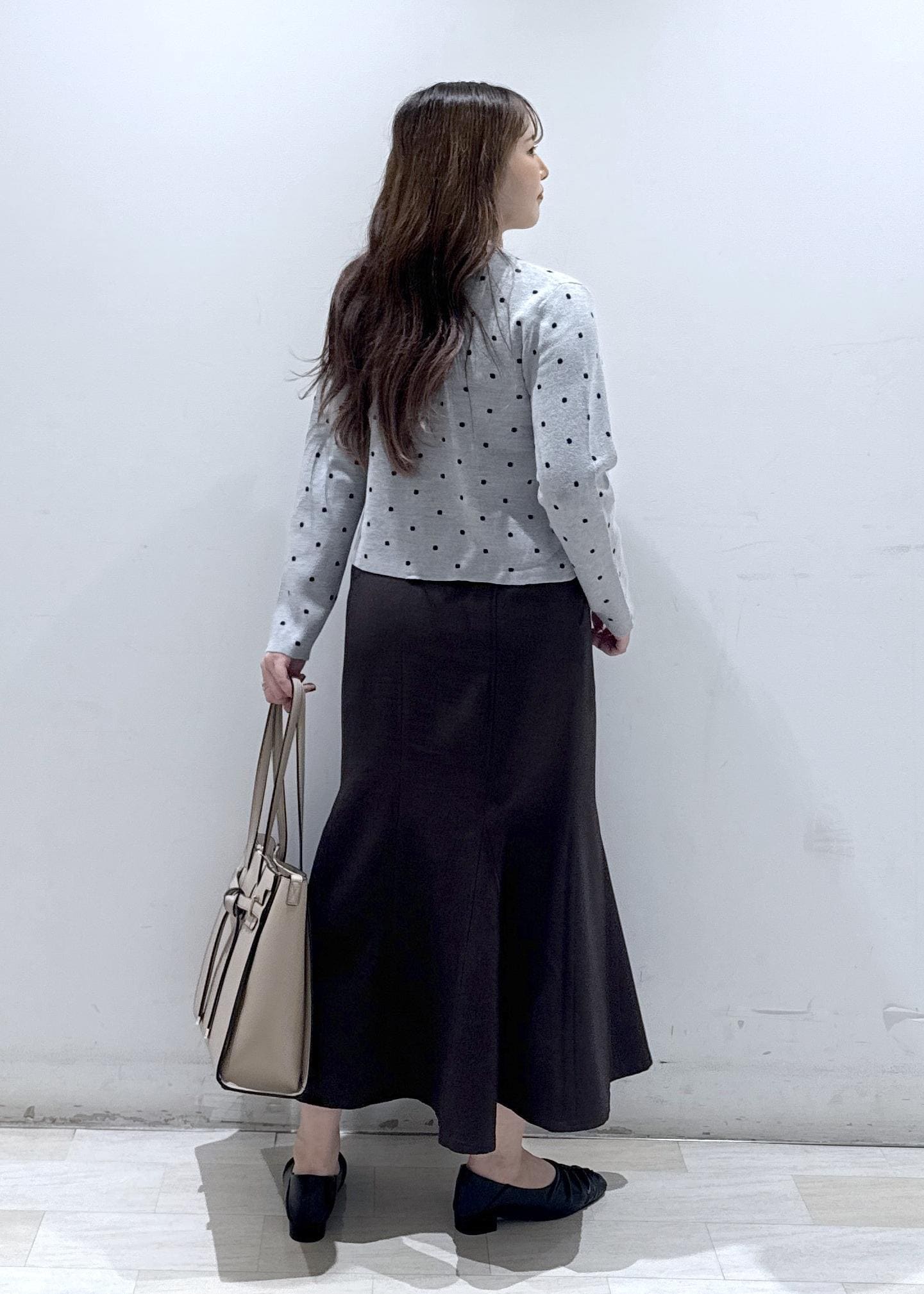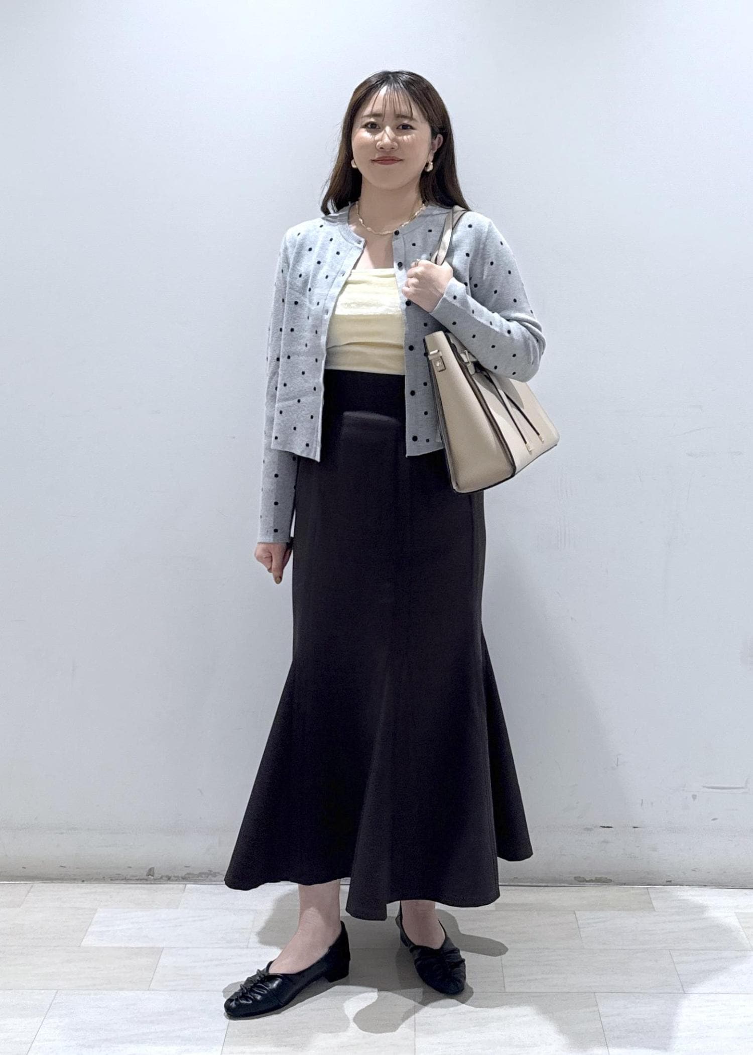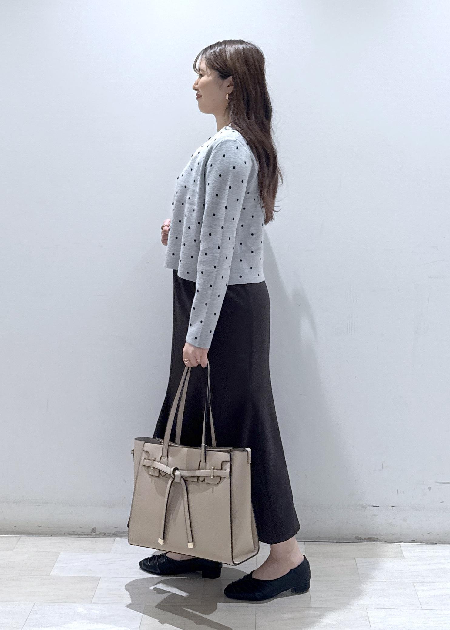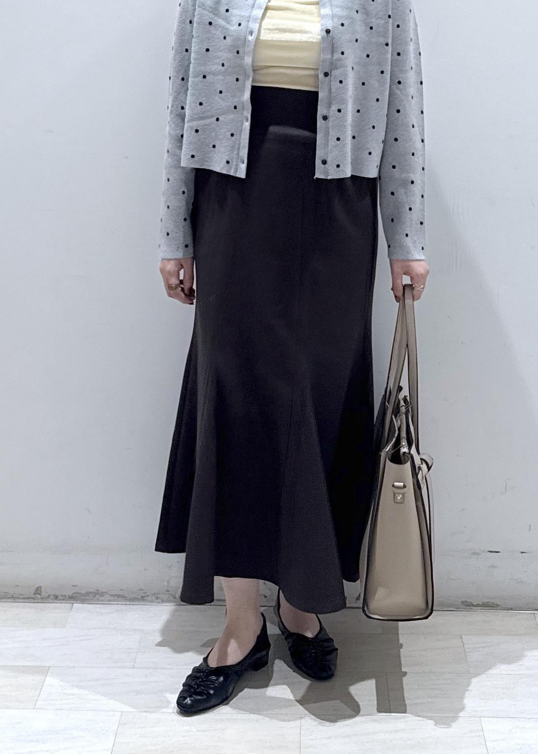 今回は店舗でも大人気のドット柄カーディガンに、マーメイドのスカートを合わせて、お仕事の時でも使える綺麗めなコーディネートにしてみました。