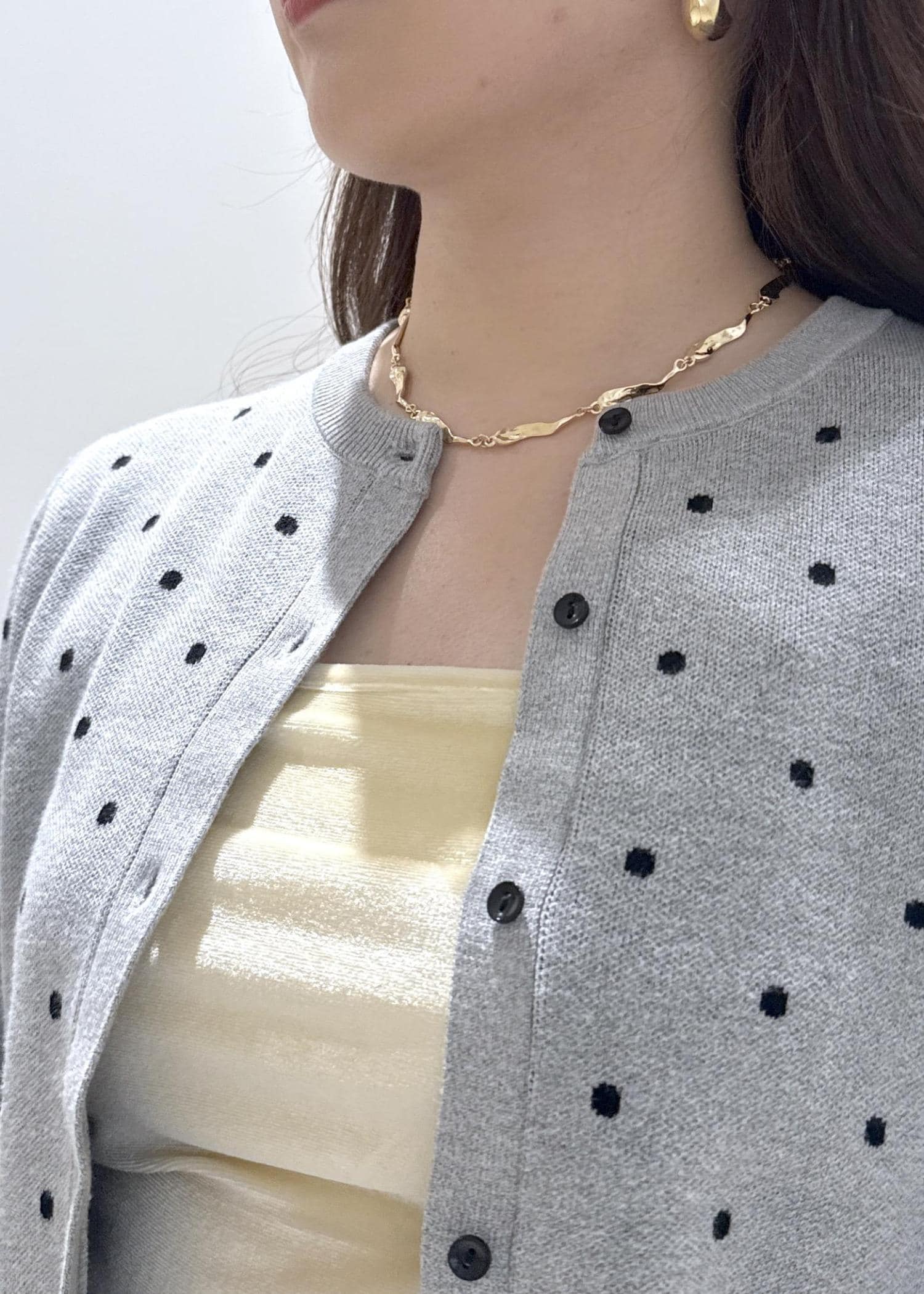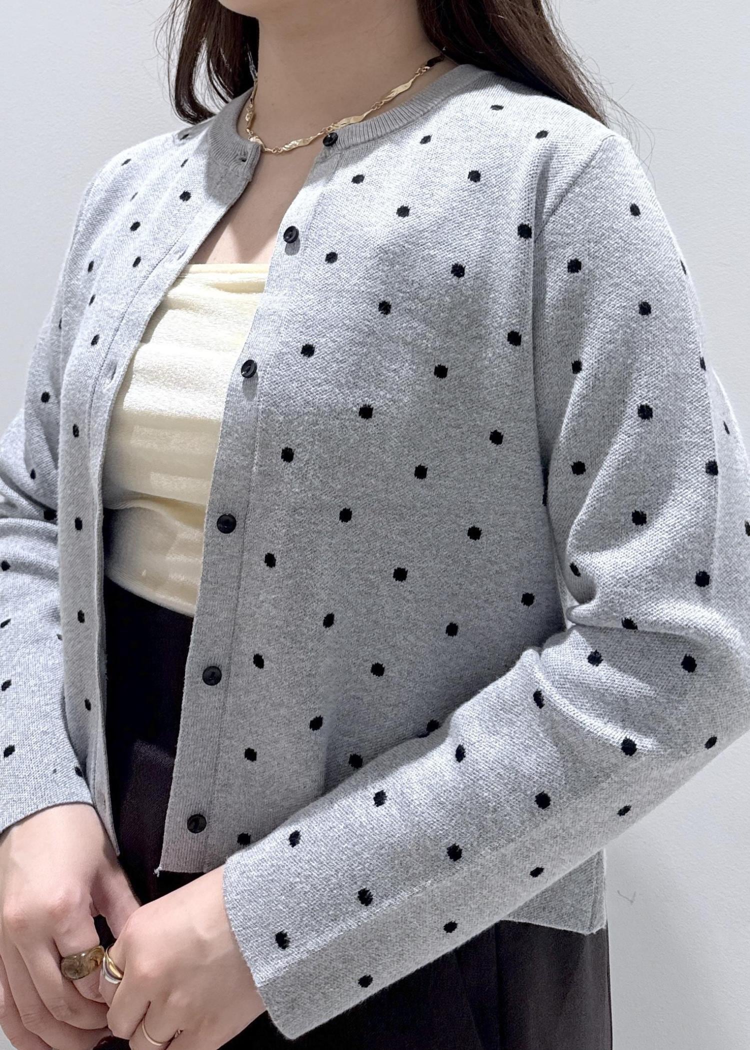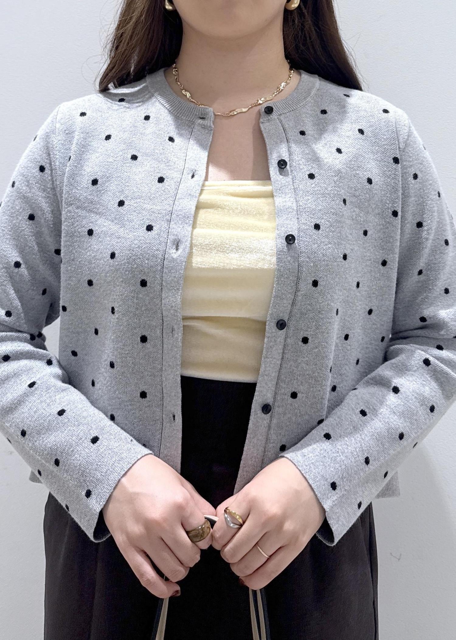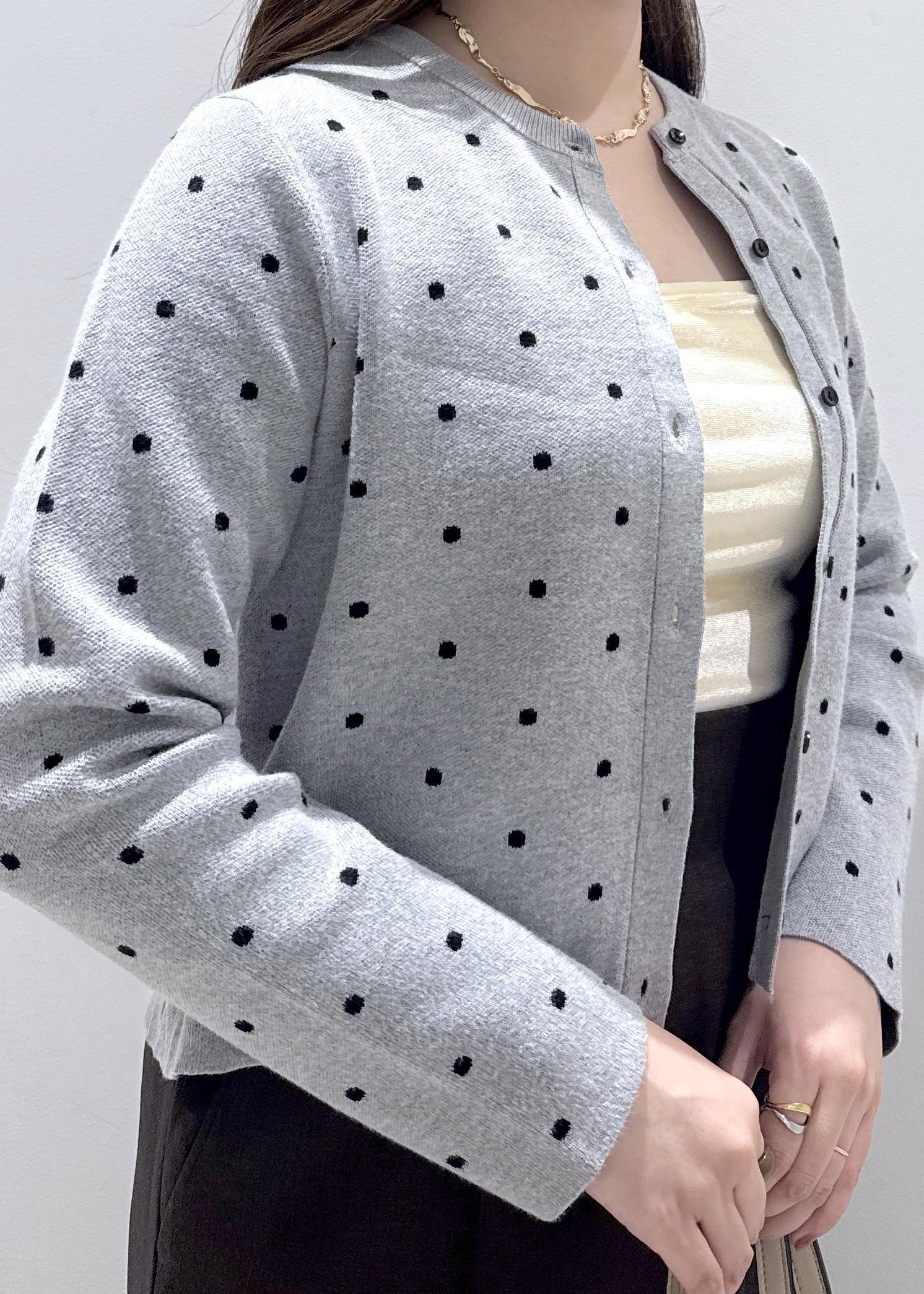 私は骨格ストレートなので、首元がカラーネックのときなカーディガンのボタンを開けて縦を意識して着るようにしています。ドット柄だと甘いイメージがありますが、グレーの色だと甘さを抑えられるのでオススメです!