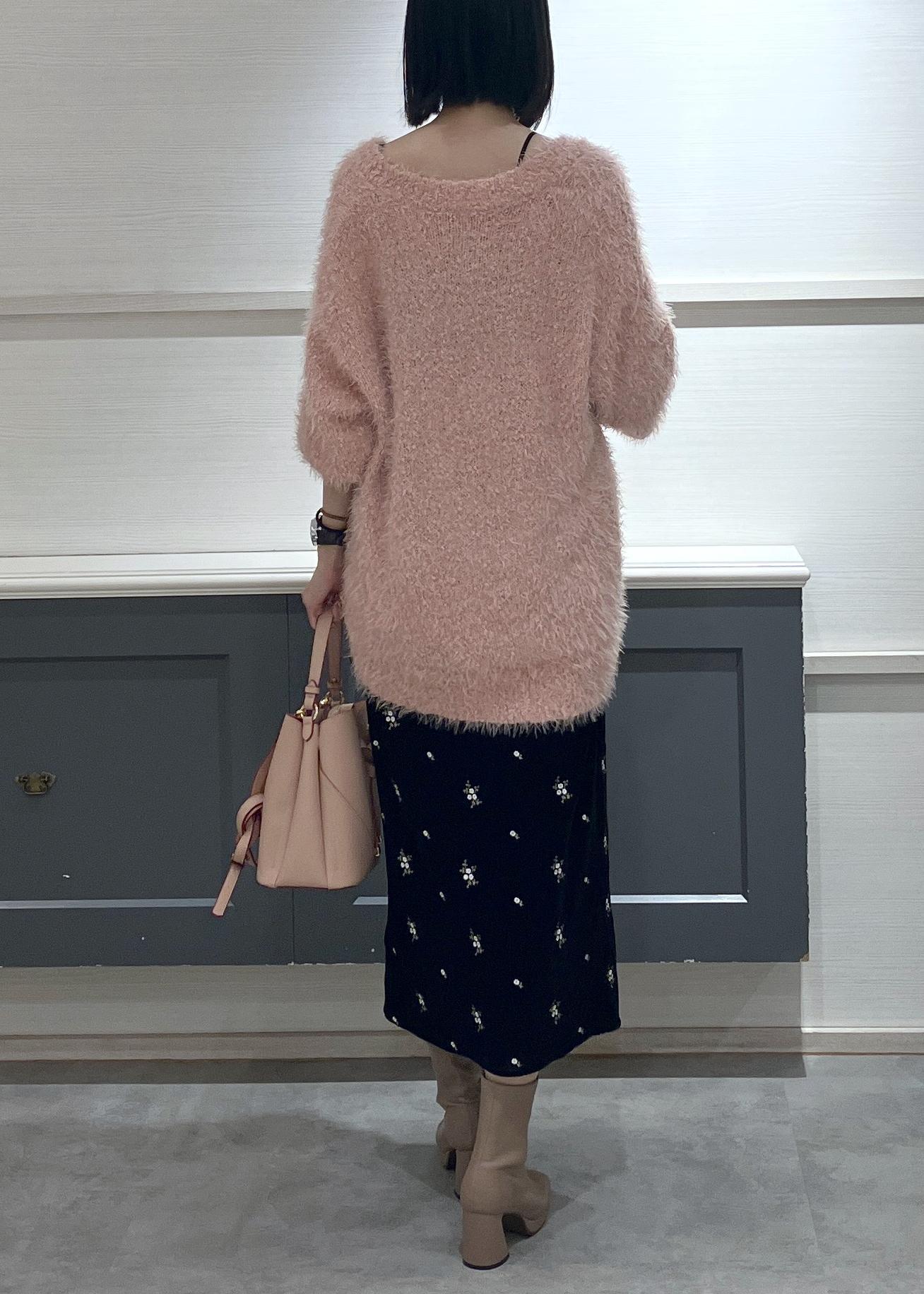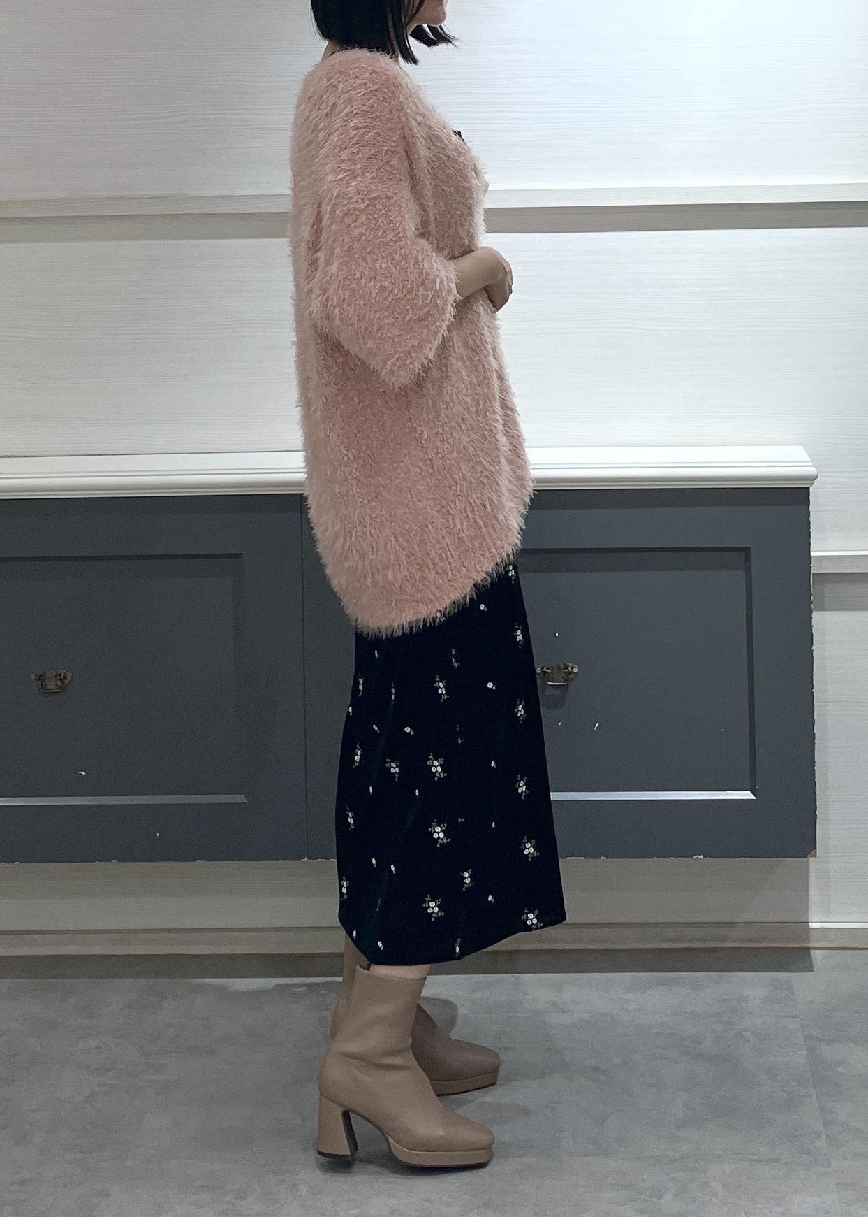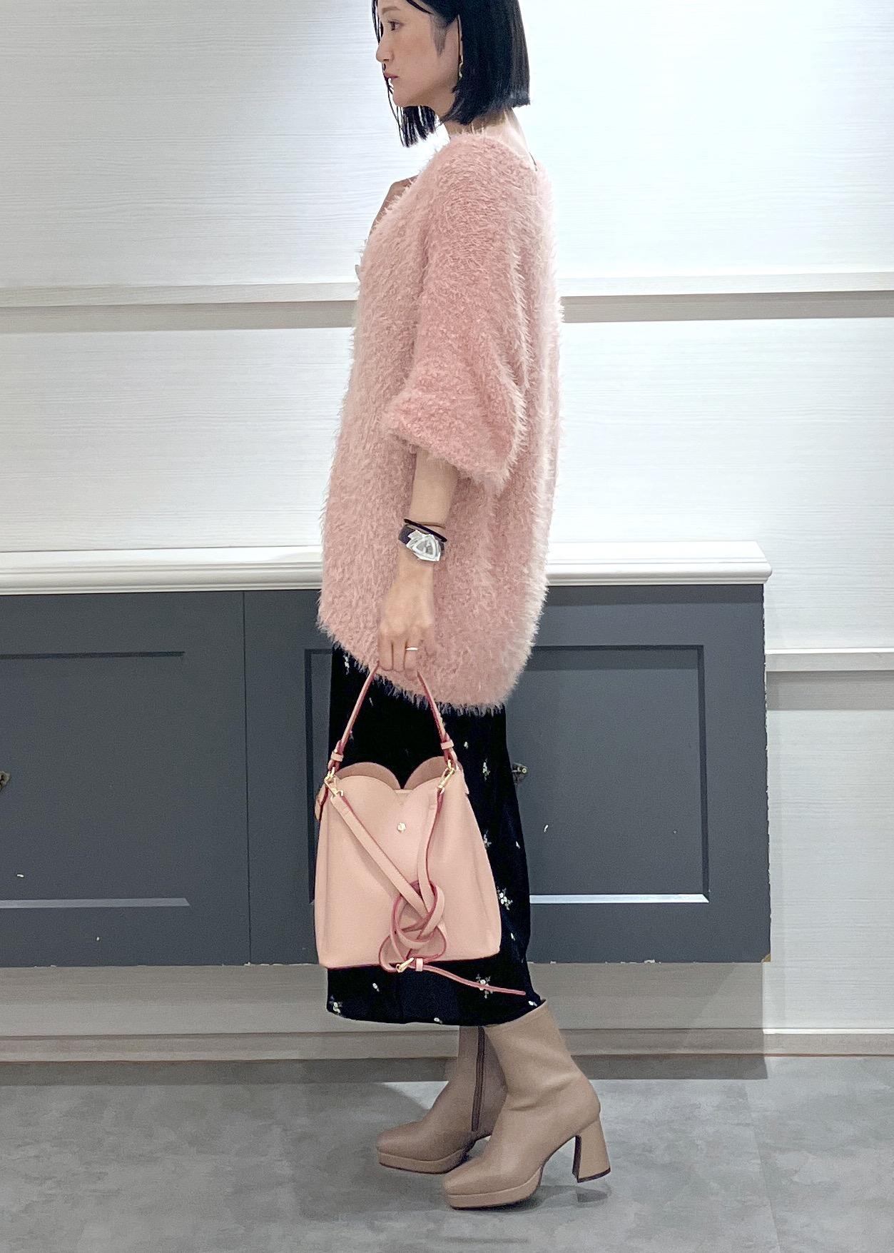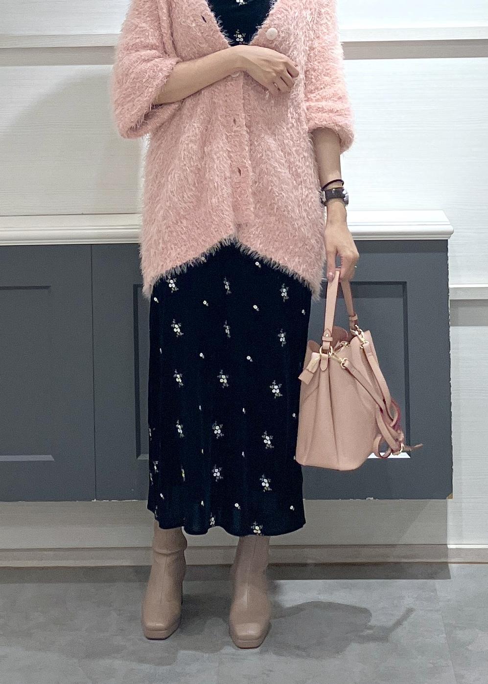 これからの季節に欠かせないモコモコカーディガンにベロアワンピースを合わせて大人でも着れるピンクコーデにしました♡