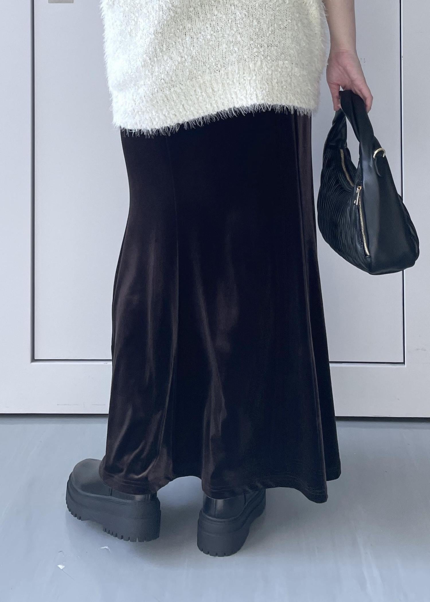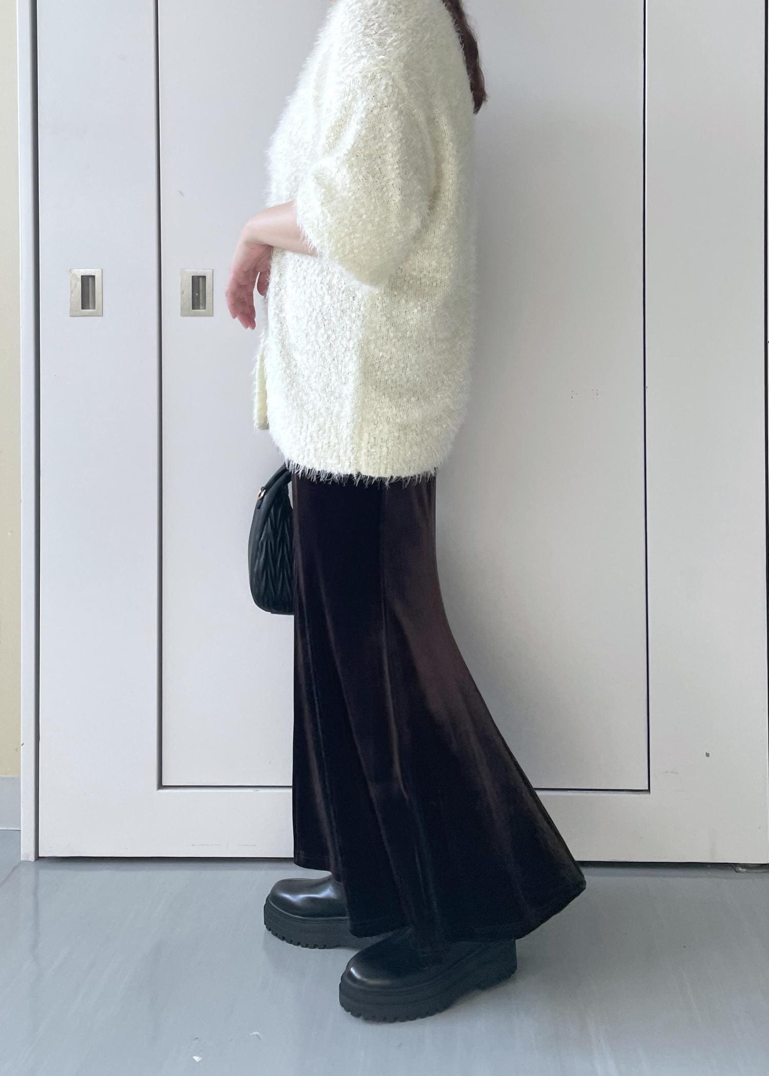 163cm Mサイズ着用でウエスト折り返しせずでくるぶしくらいの丈感です。高身長でも丈感がしっかりあるのでバランスが取りやすいです。柔らかい厚めのベロア生地なので身体のラインを拾わずに気になる腰回りもカバーしてくれます◎