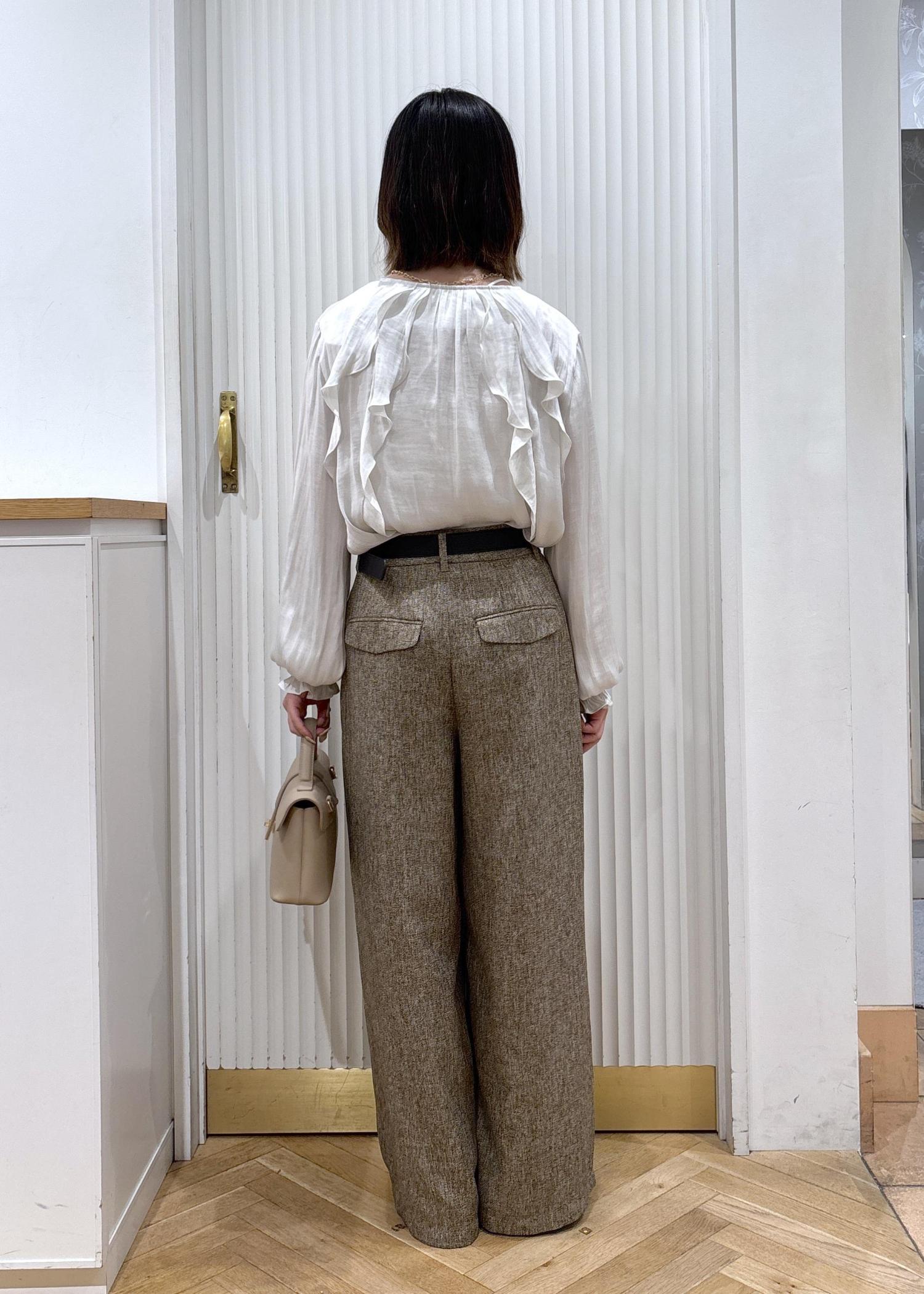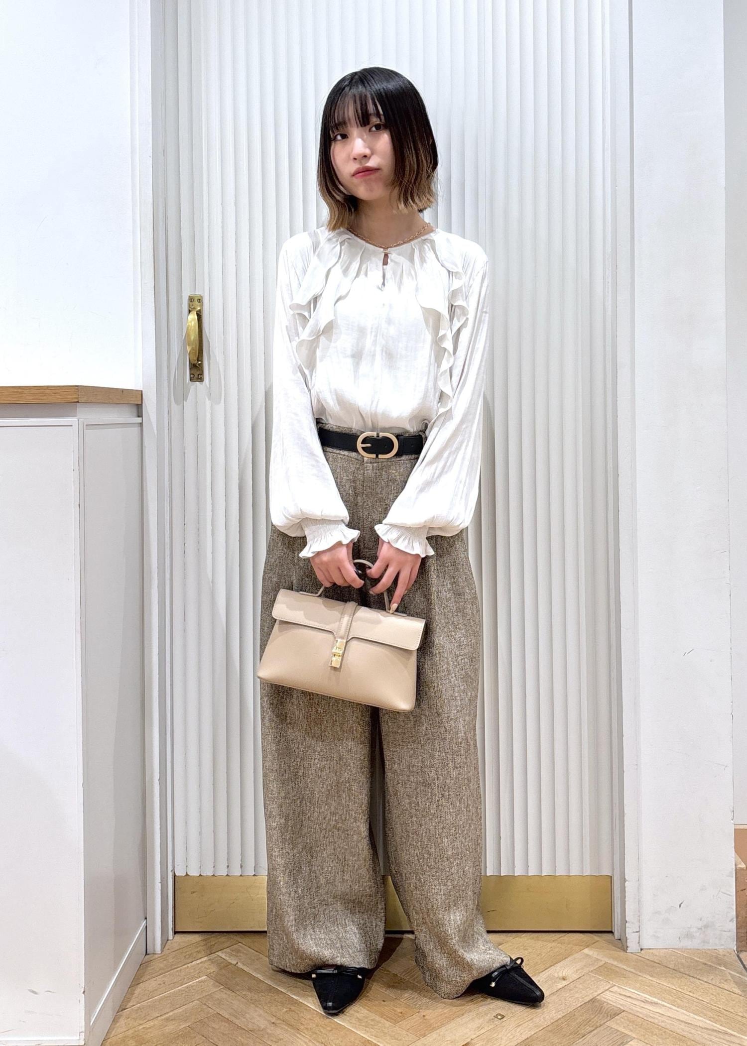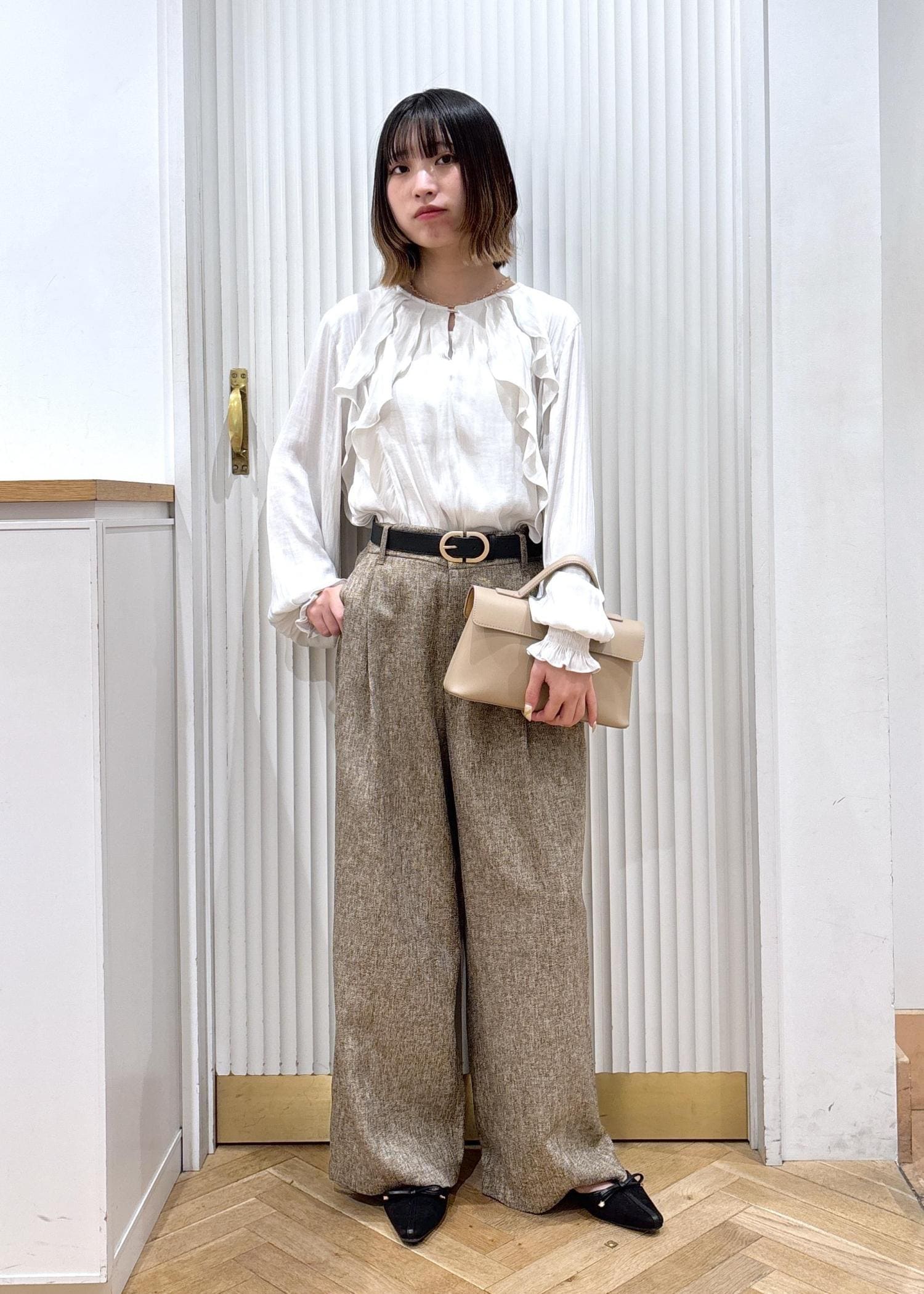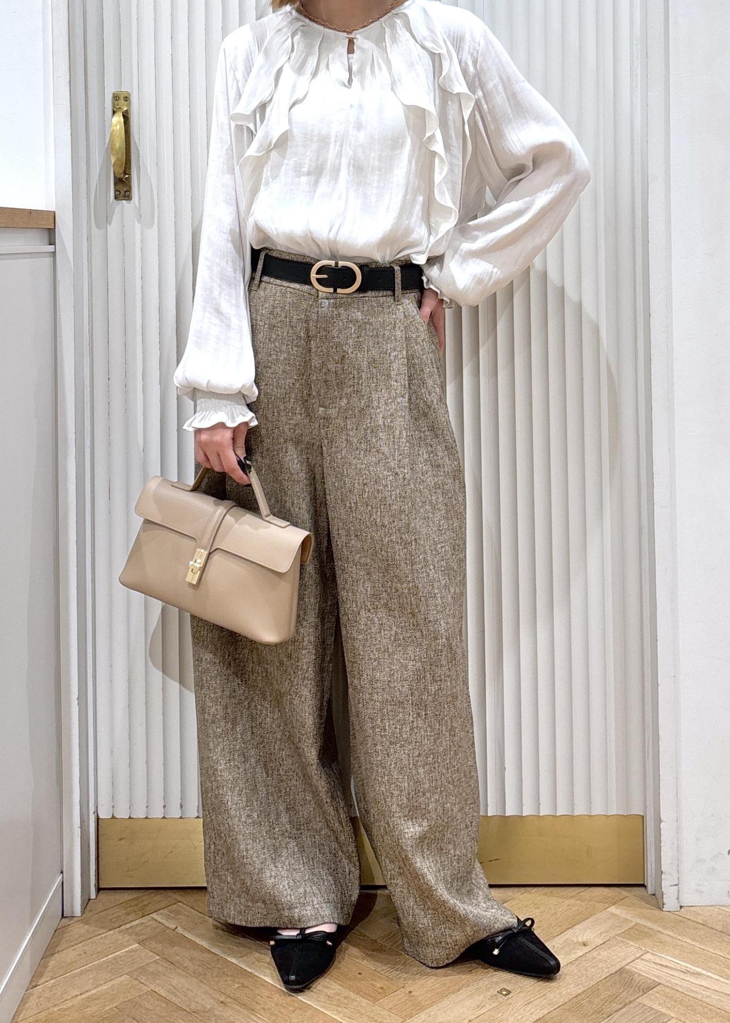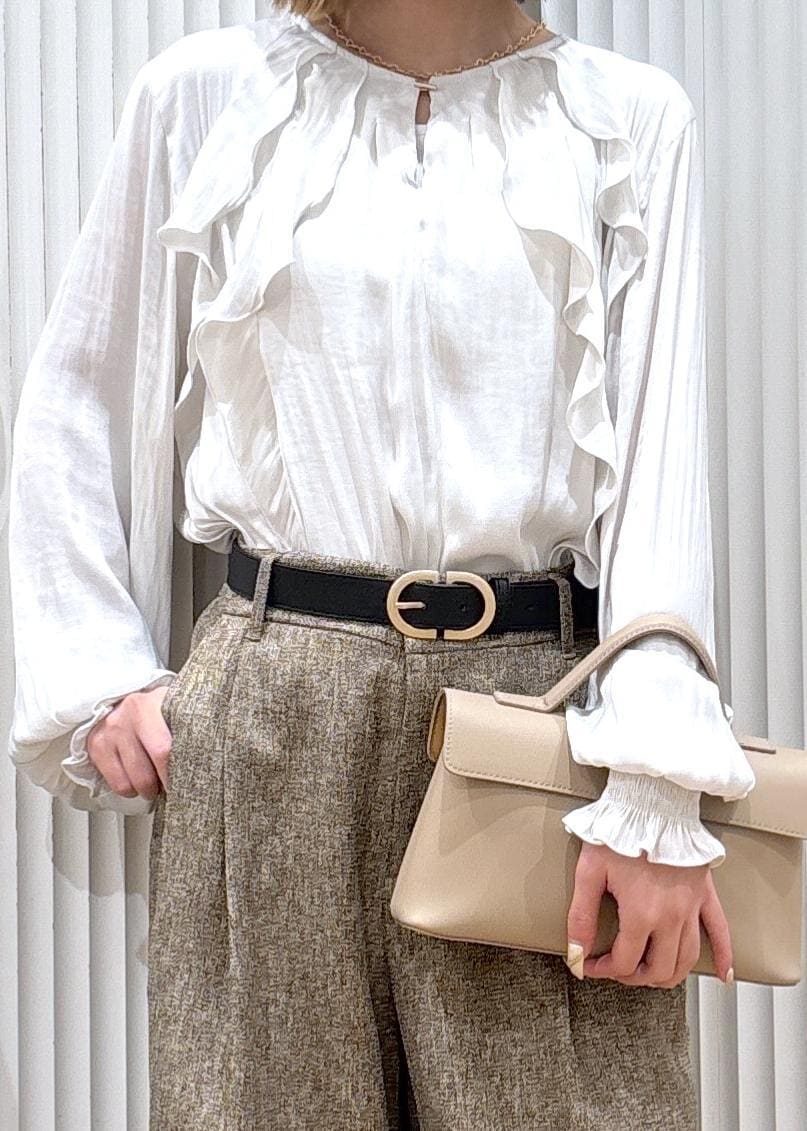 白やベージュを使ったオフィスカジュアルコーデです。ツイードライクにフリルを合わせることで甘さが抑えられつつ女性らしいコーディネートになります。ベルトや足元に黒を持ってくることで膨張しにくく締まって見えます。