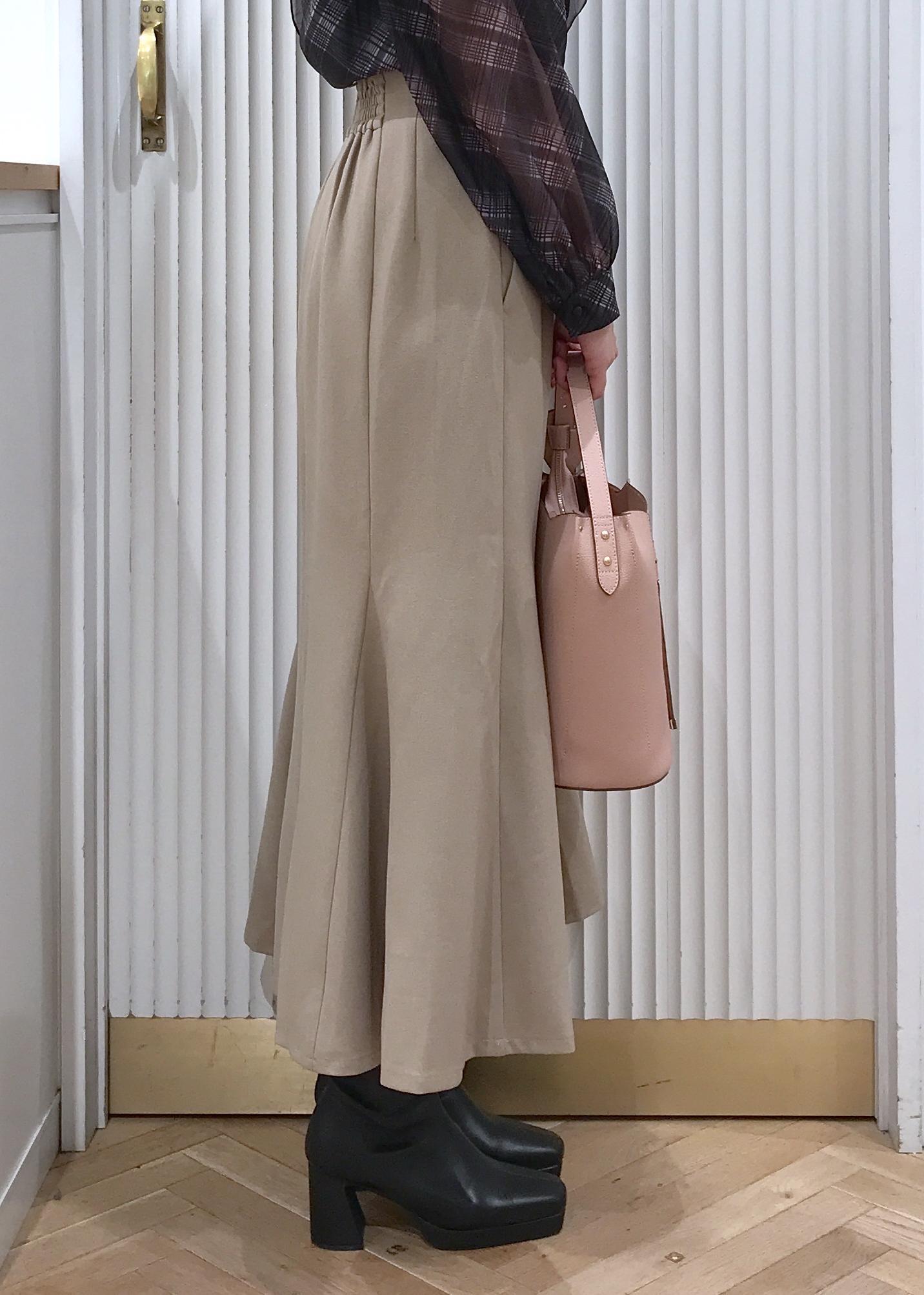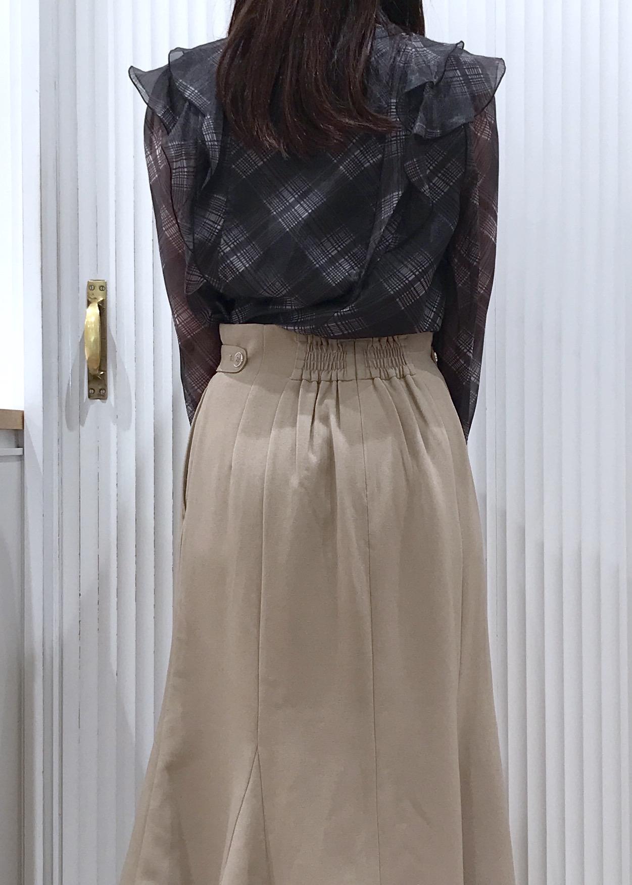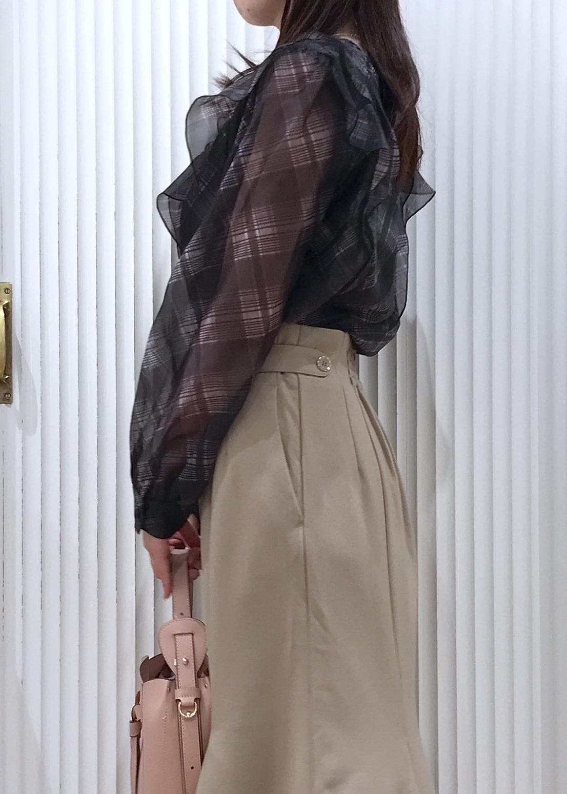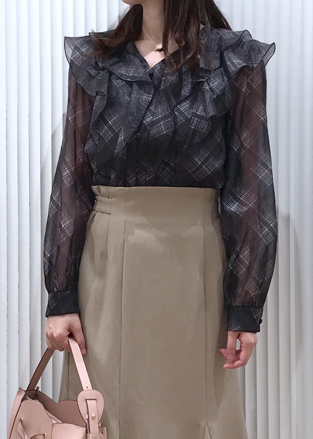 秋らしいチェックフリルブラウスとマーメイドスカートを合わせたフェミニンコーデです。