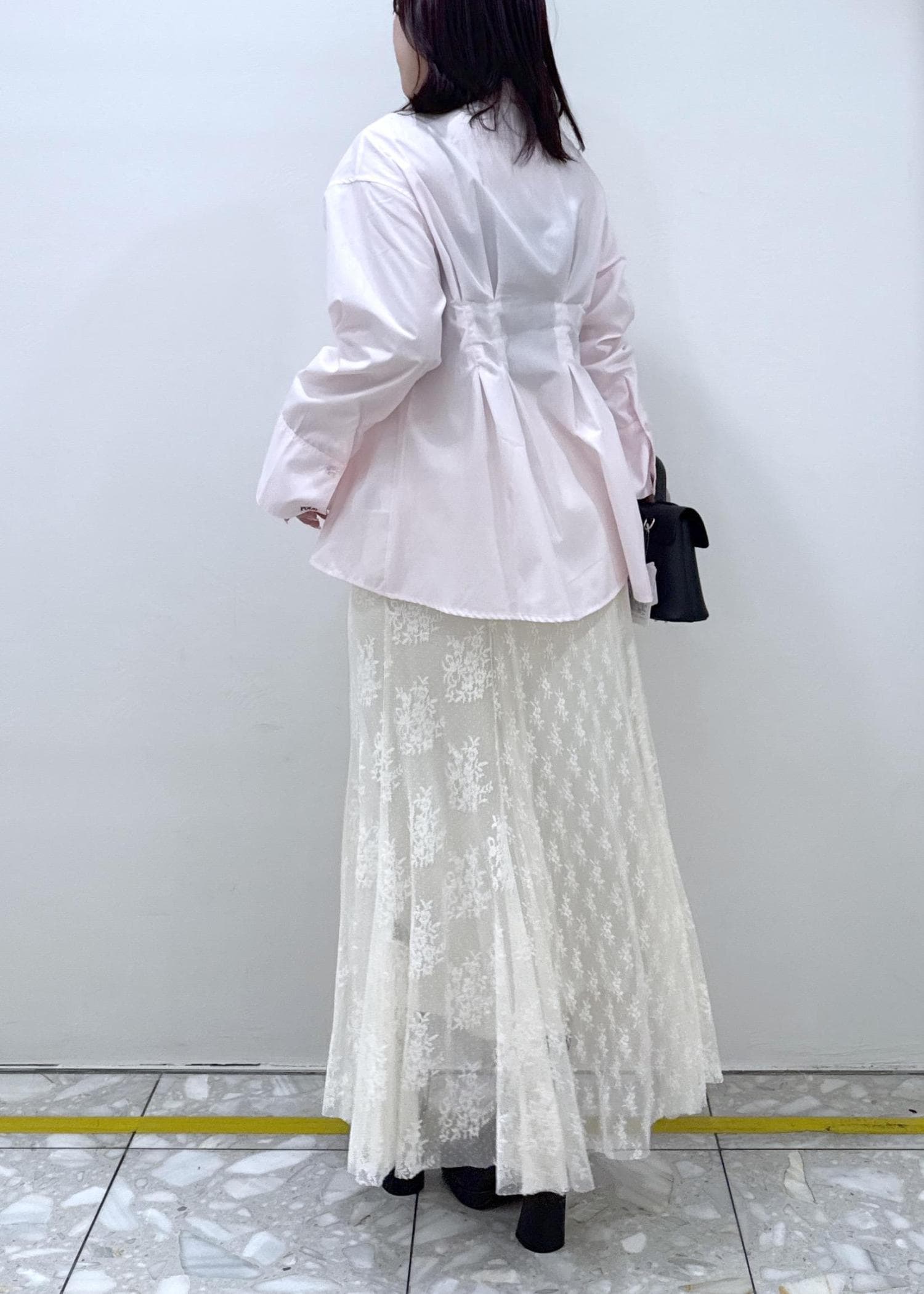 ピンクのPOLOシャツにレーススカートを合わせた女性らしいコーデ!