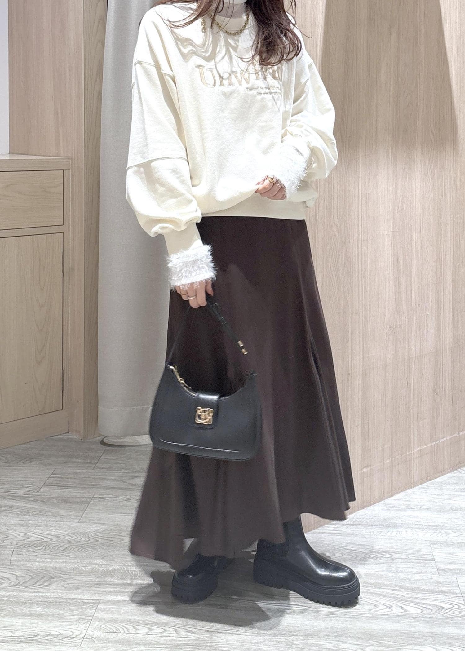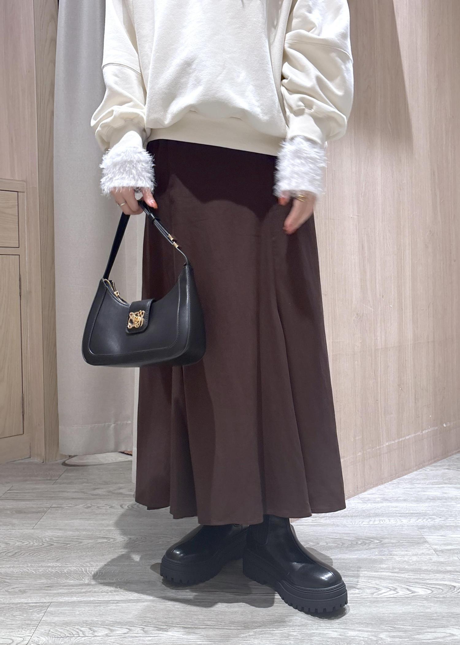 流行りのブラウンカラーのスカートは動くたび揺れるシルエットが女性らしさをアップしてくれます。