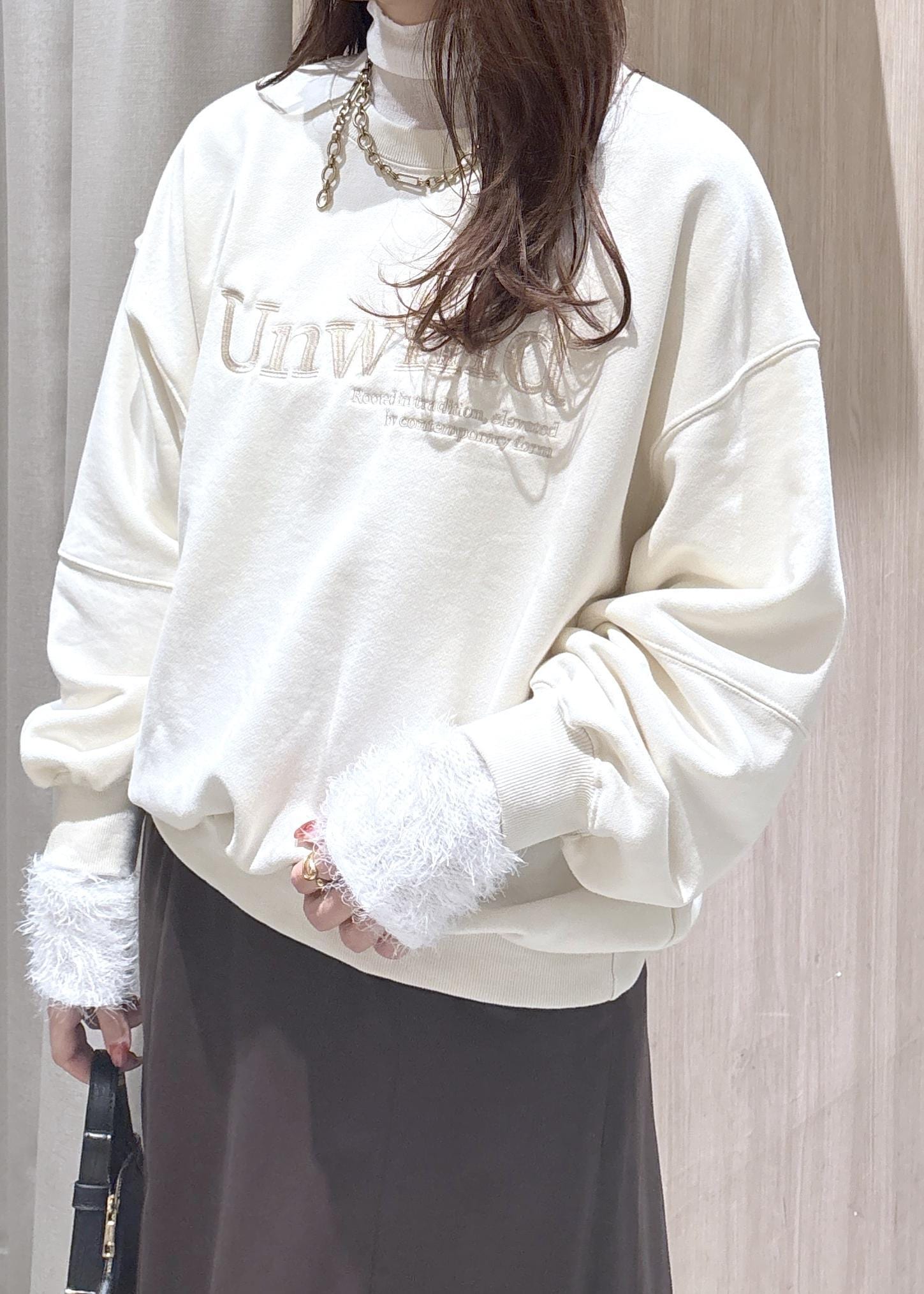 袖フェザーニットと合わせることでより柔らかい印象に。