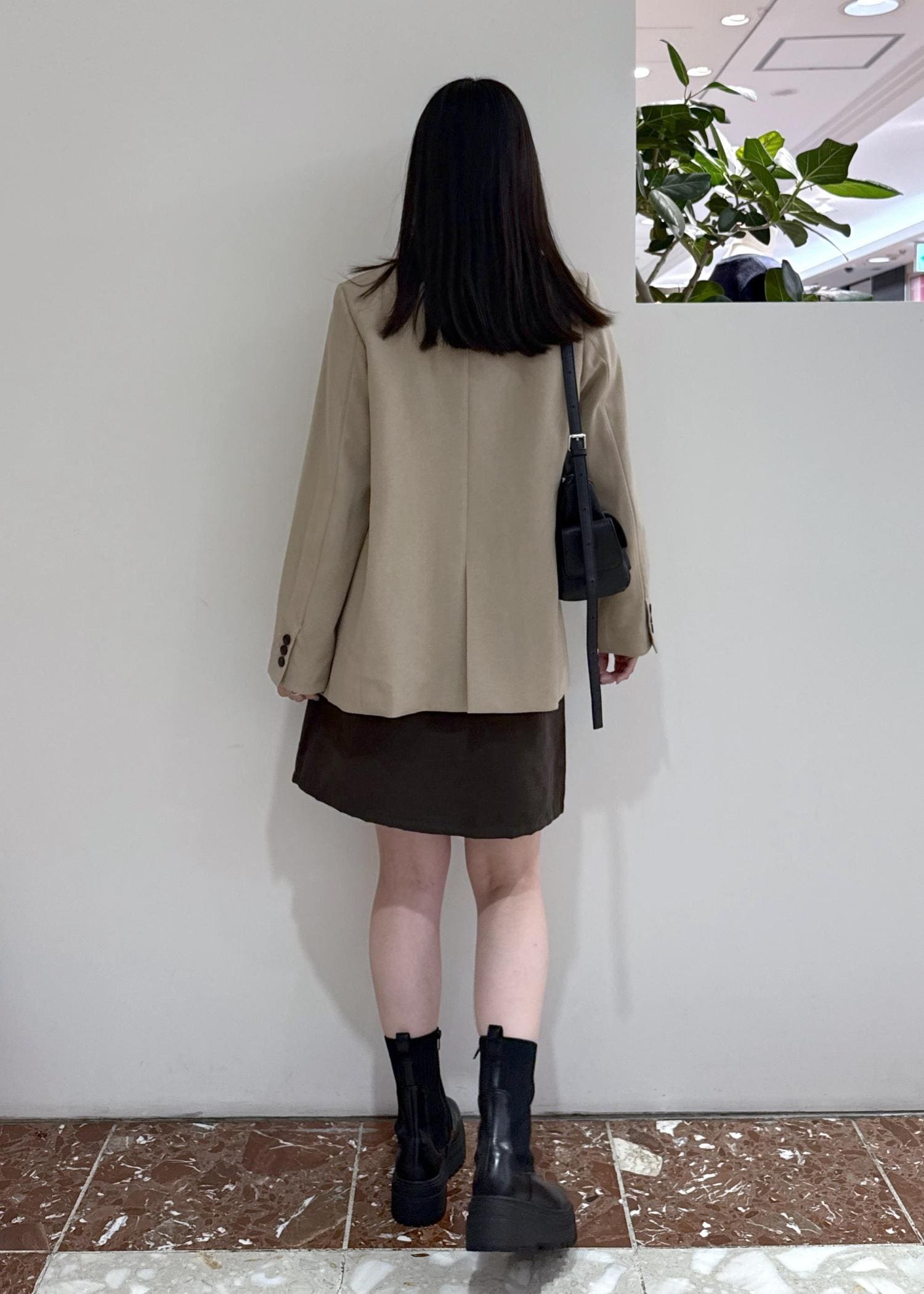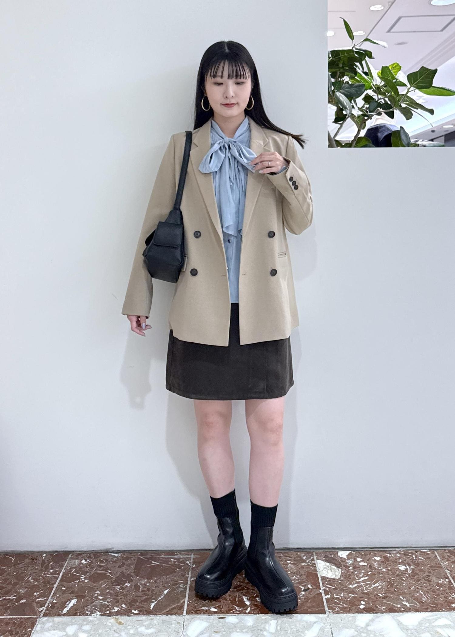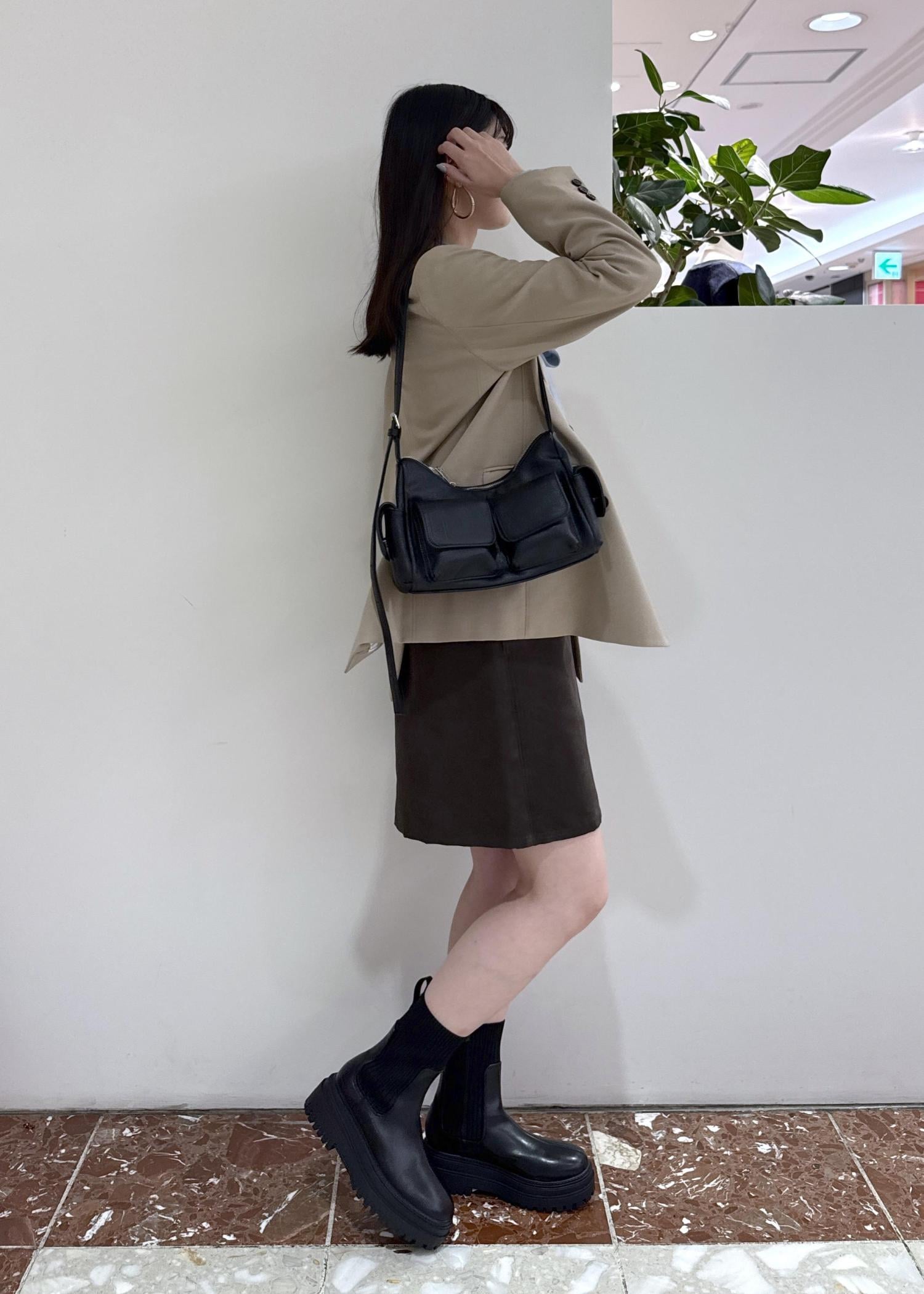 VIS釦ポイントスエードライクミニスカートダークブラウン / F¥5,929レビュー164cmで腰にかかるくらいのややコンパクトな丈感です。インしなくてもスッキリ見えます!