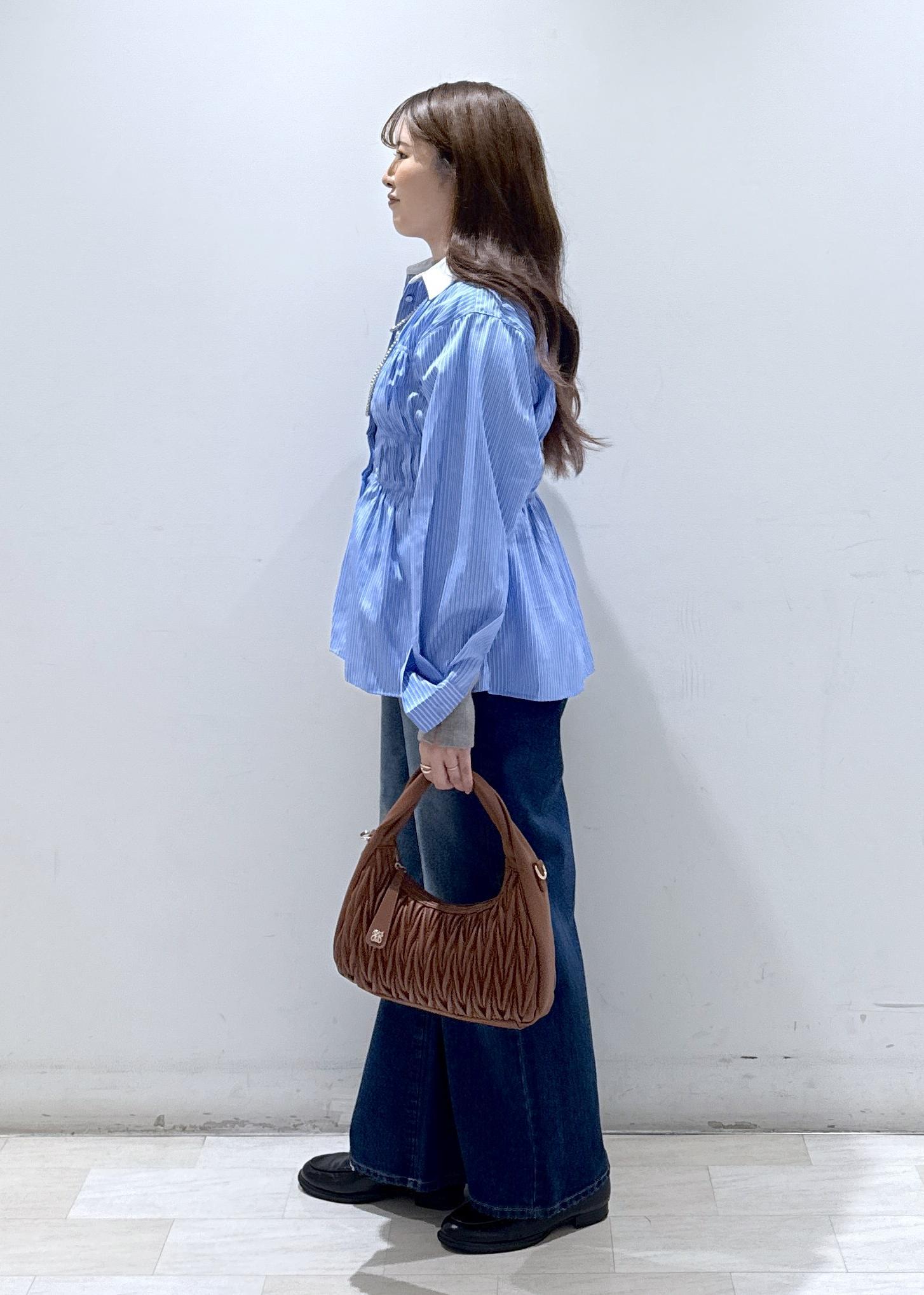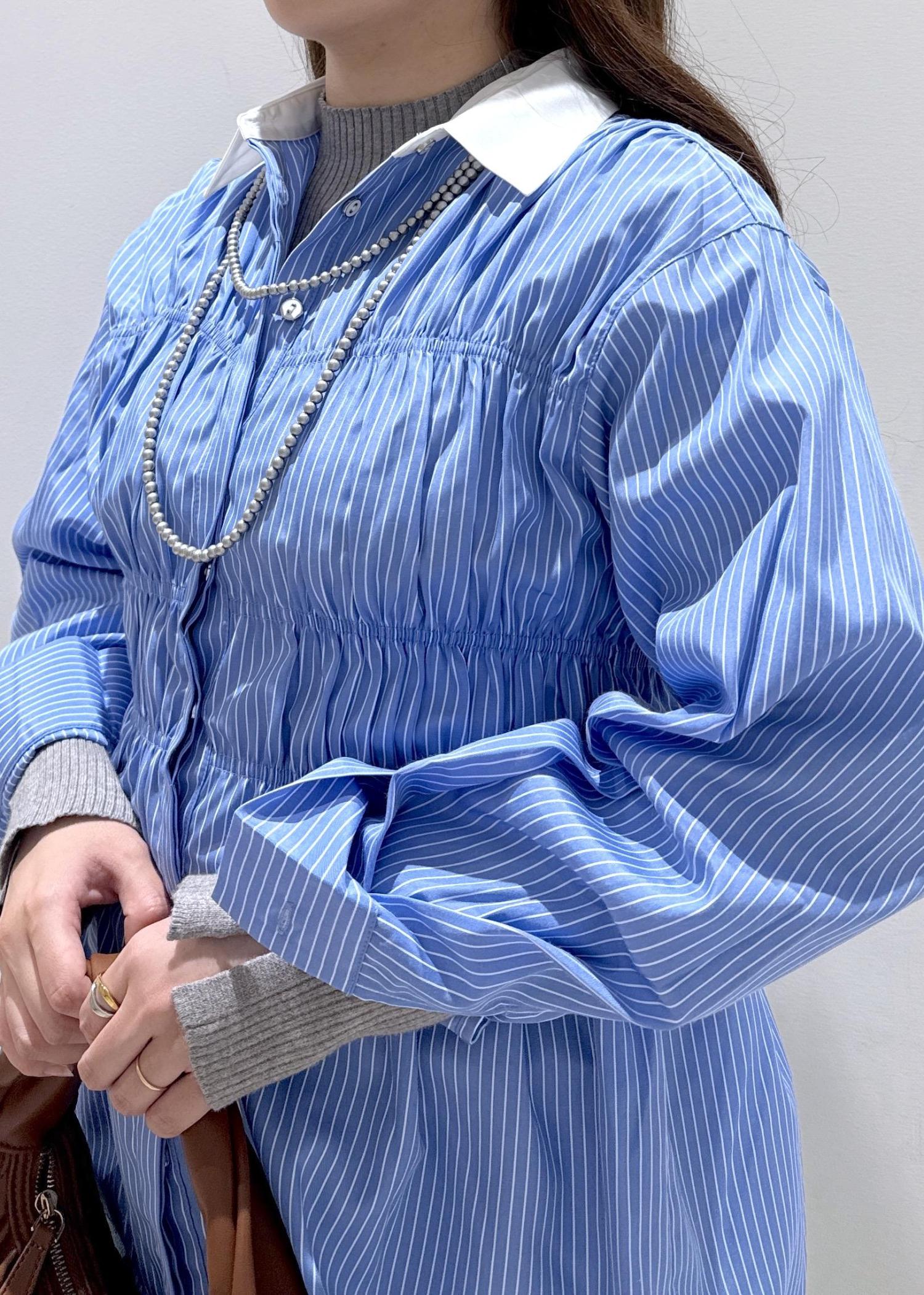 春夏に大人気だったシャーリングブラウスが、長袖バージョンになって新しく入荷しました☆着てみると意外とお袖がフワッとボリューム感があり、手首にキラッと光るメタルボタンも可愛いです♡身長157cmで思ったよりも少し長めの着丈になっていて、気になるお腹周りもカバーできちゃいます!今回は全色ストライプ柄になるので、洗濯をした際にも大きなシワ感も分かりにくいです。生地はサラッとした質感なので上から羽織ってももたつくことはないですよ♪