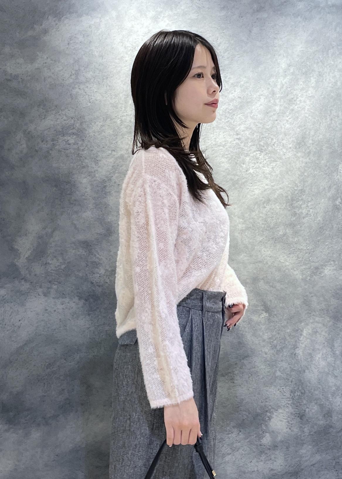 VISフラワーモチーフフェザーシアーニットピンク / F¥3,842レビュー身長160cmで腰骨にかかる丈感。