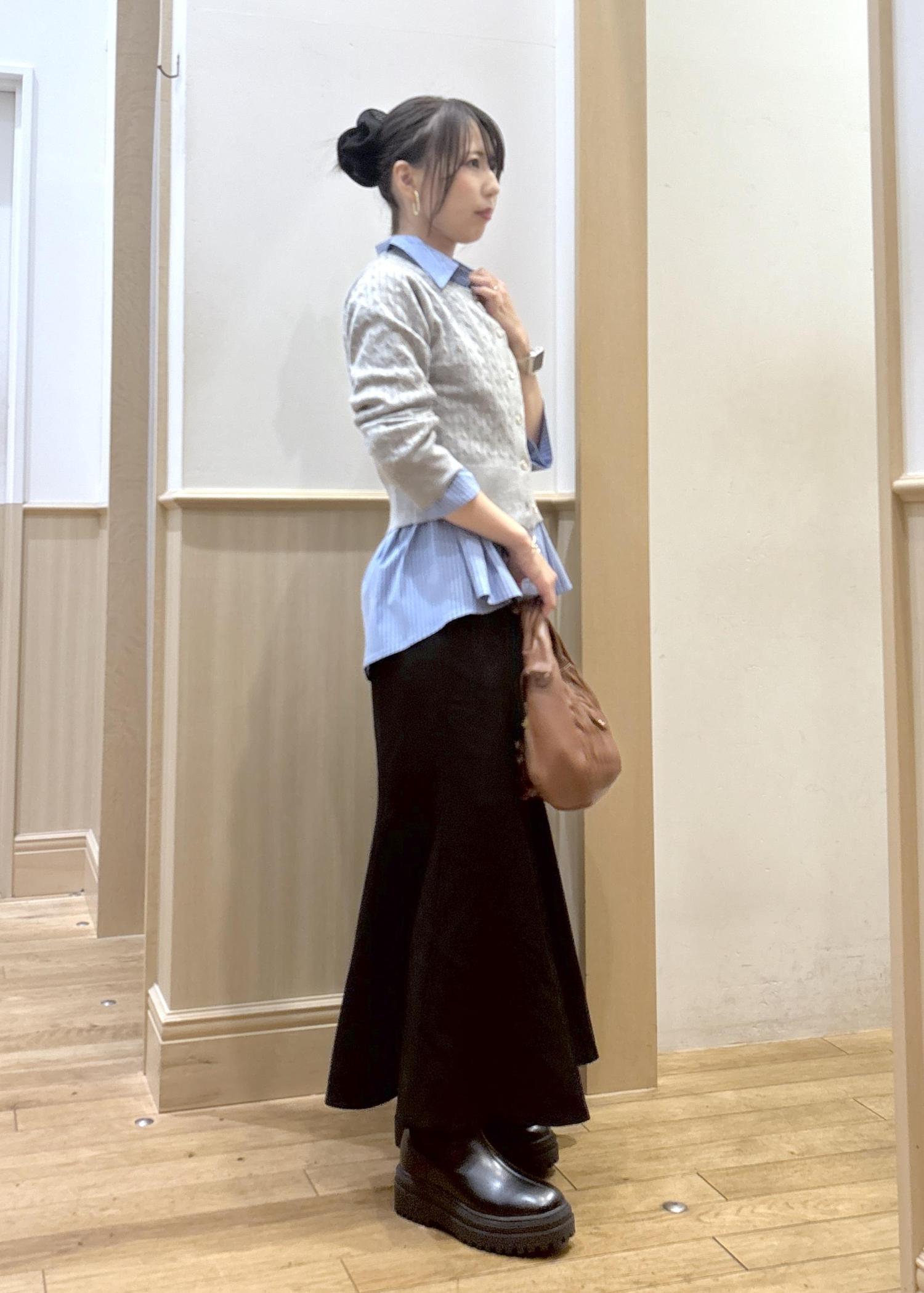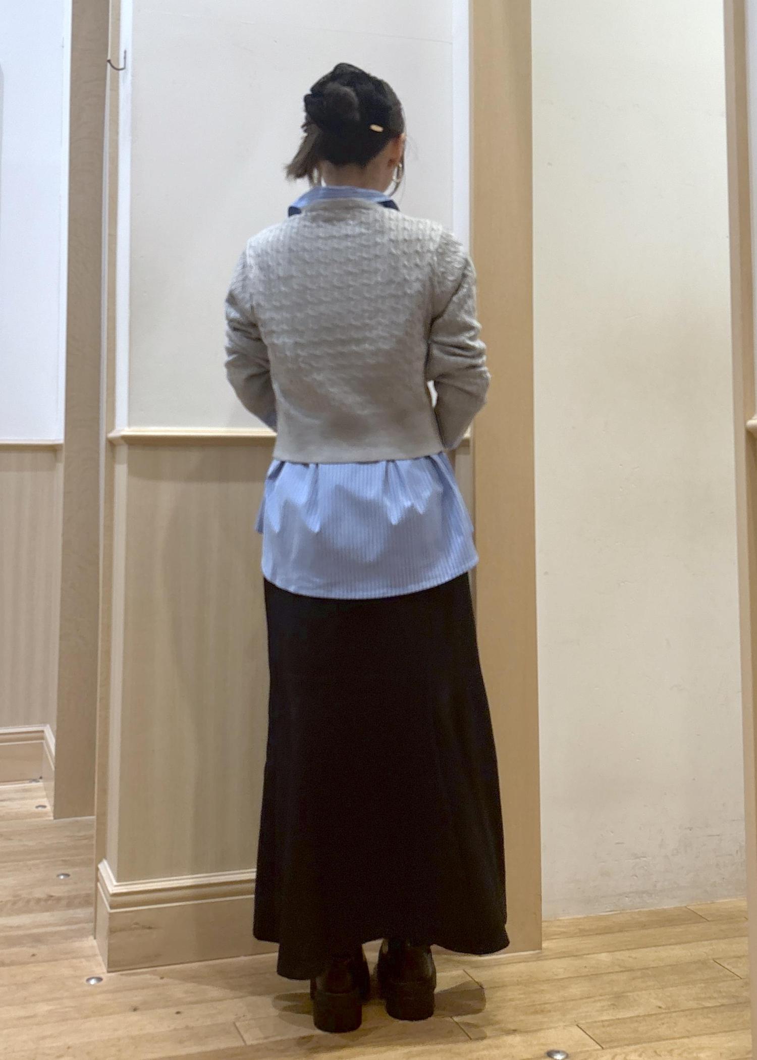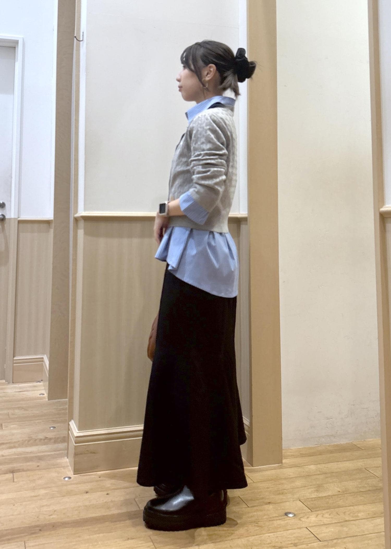 くるぶしくらいまでしっかり長さが欲しい時は、Mサイズでウエストを両ボタン詰めると、トップスをインして少し大きいくらいで、シルエットは綺麗なので、着たいバランスによってサイズ感を選びやすいスカートです。